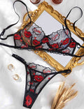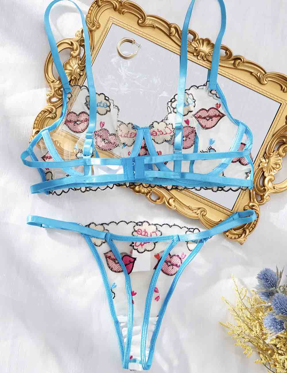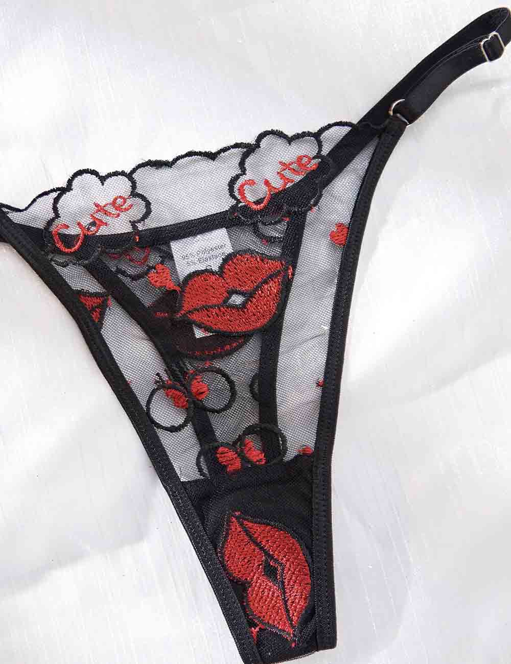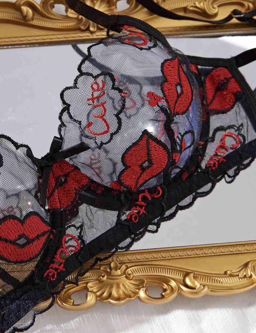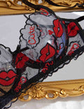 Ladies Red Lip Embroidery See Through 2PCS Lingerie Set 8HF4146