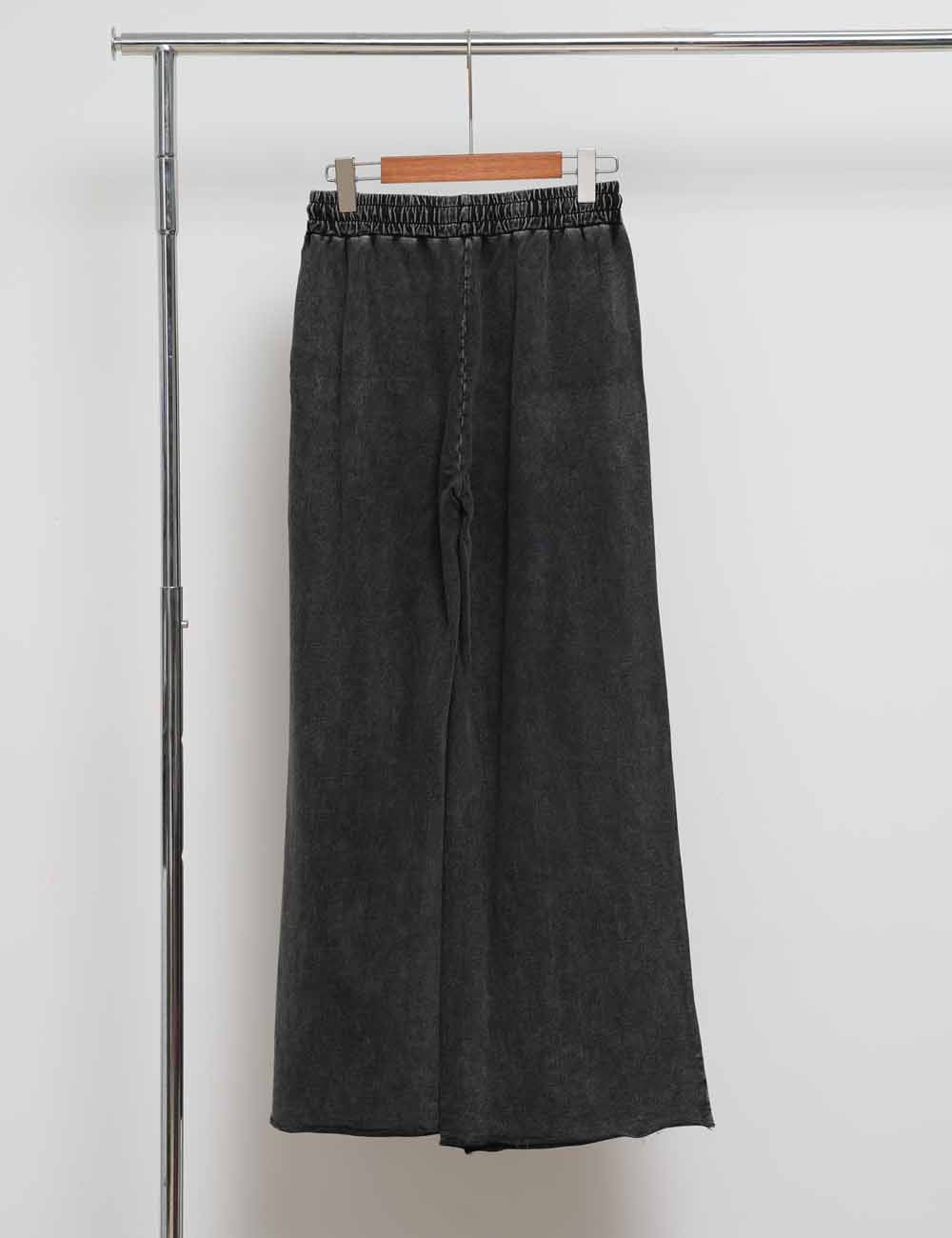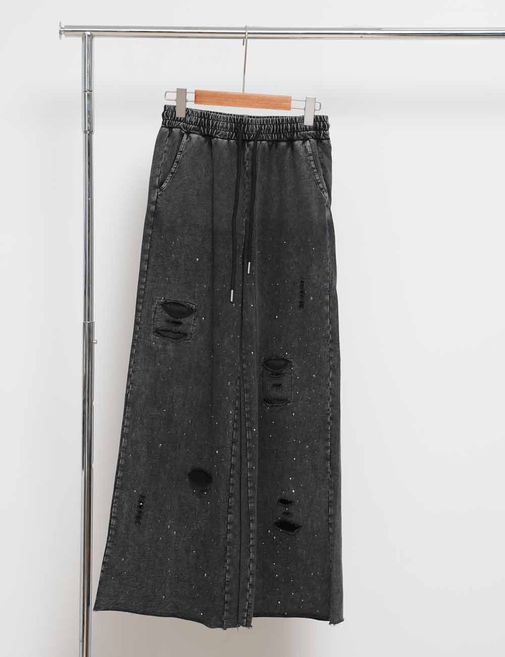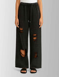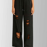 Ladies Rhinestone Elastic Waist Wide Leg Ripped Pants