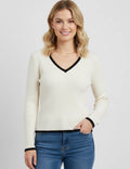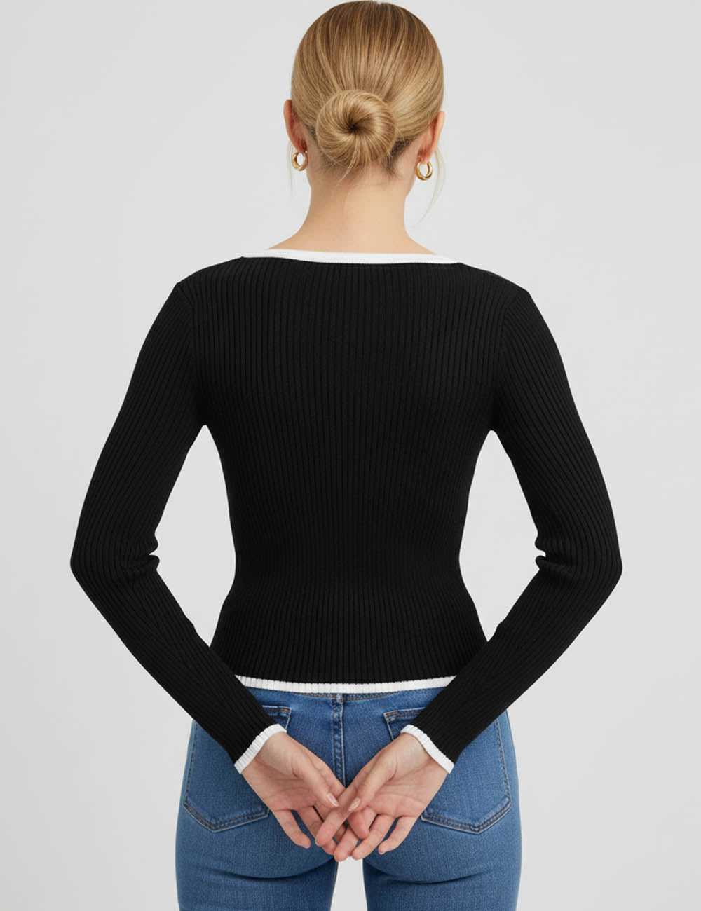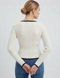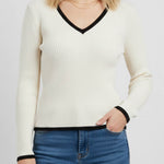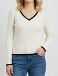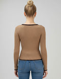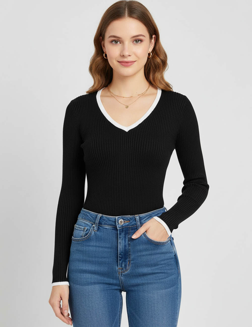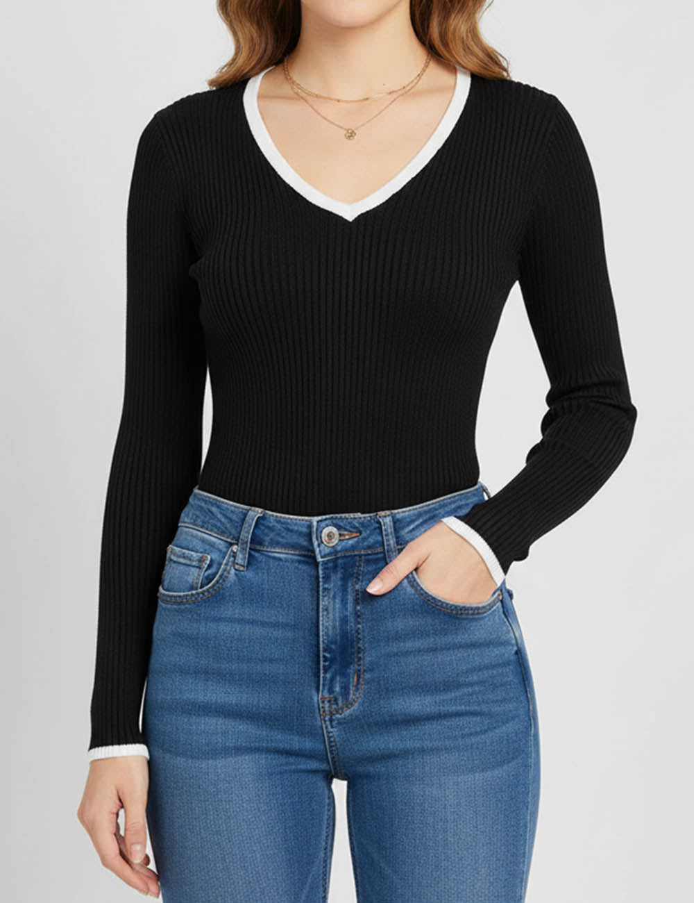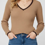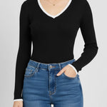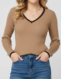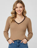 Ladies Ribbed Knit Color Block V-Neck Long Sleeves Top