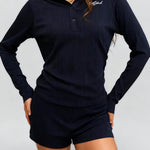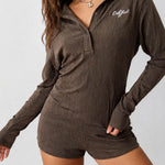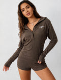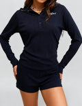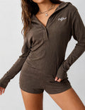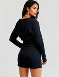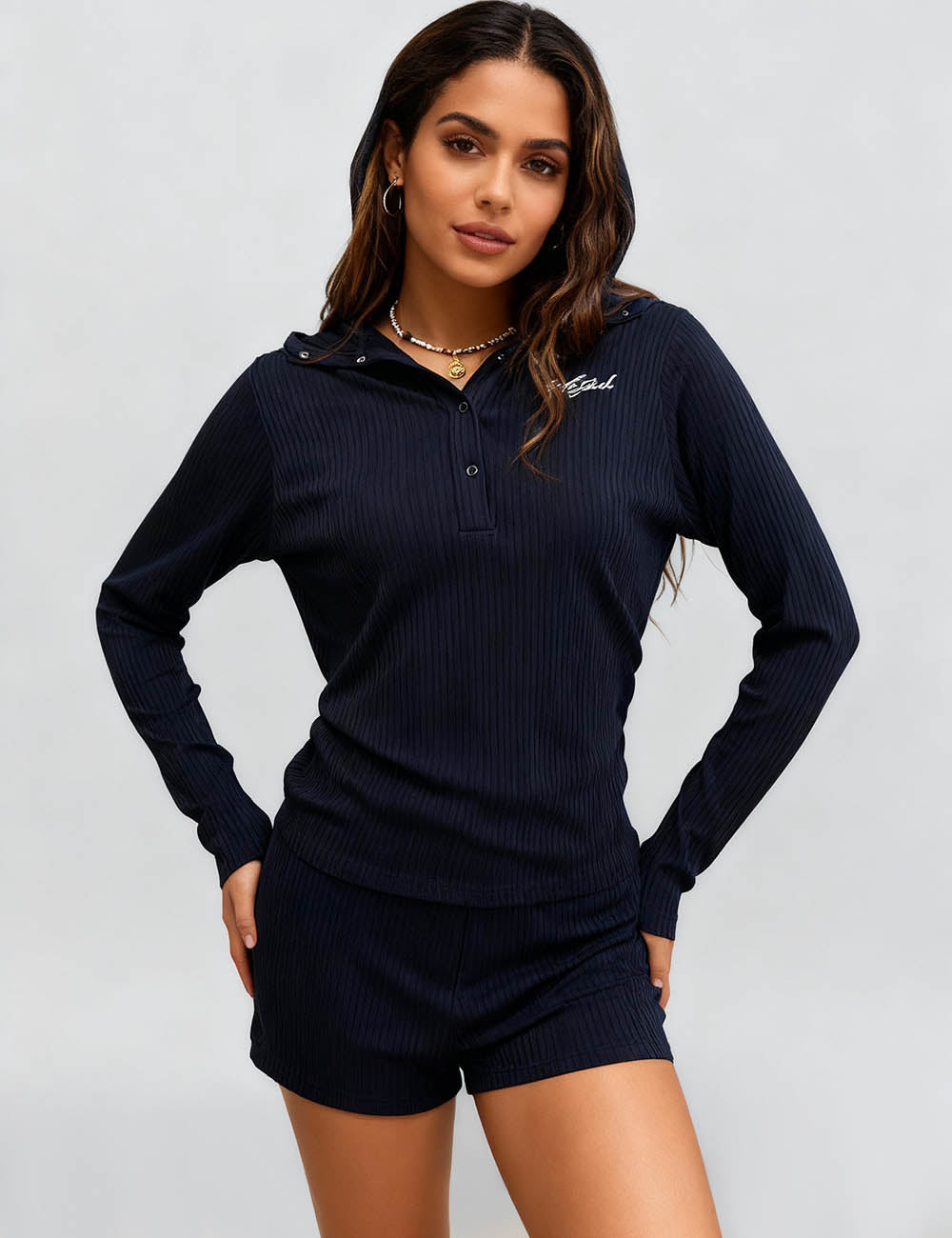 Ladies Ribbed Knit Hooded Button Front Top & Shorts Set