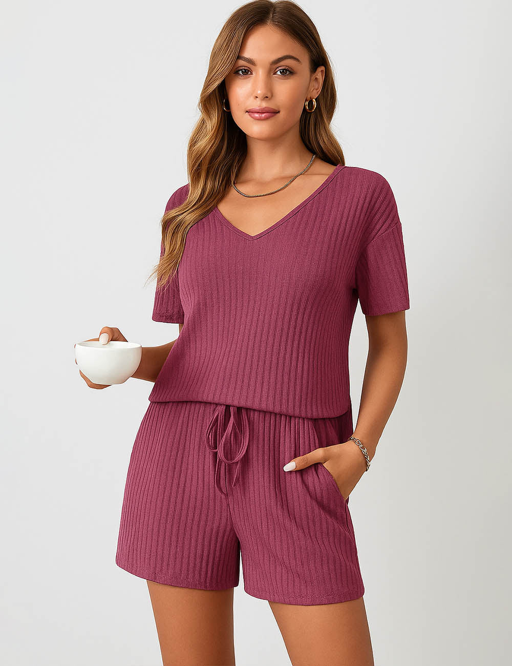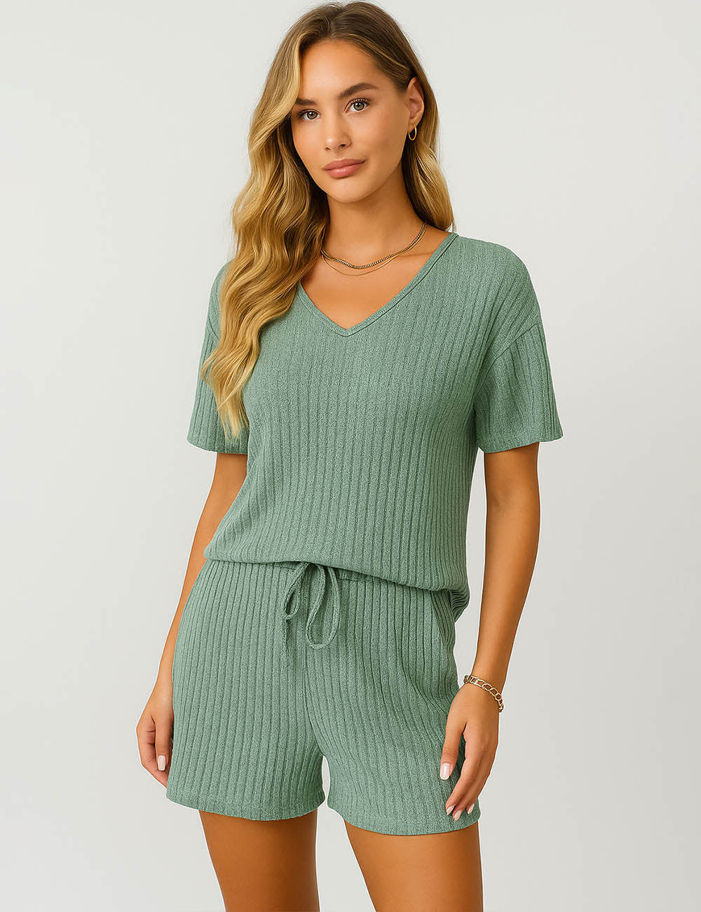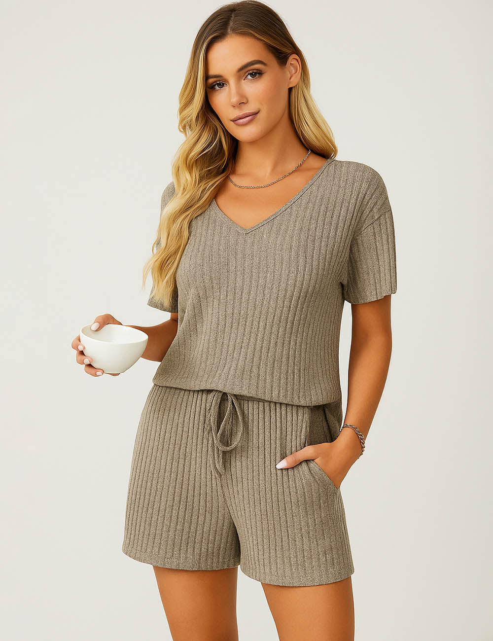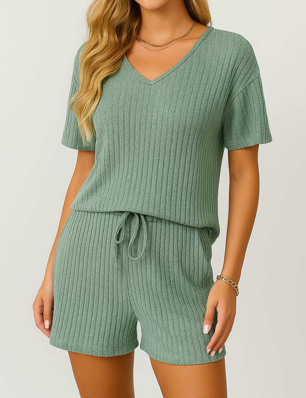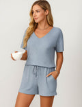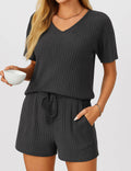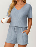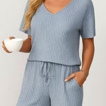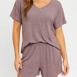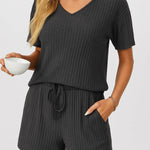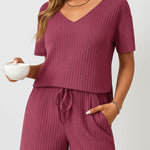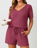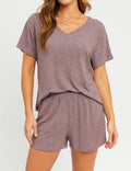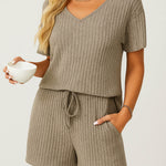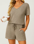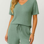 Ladies Ribbed Knit Set V-Neck Elastic Waist Top & Shorts Set