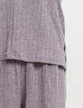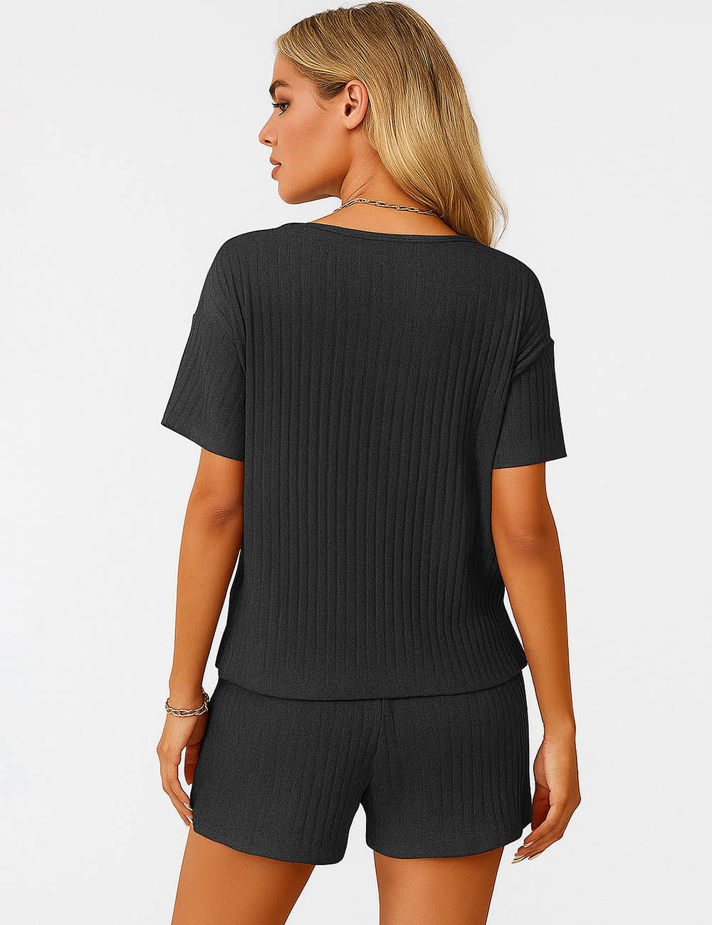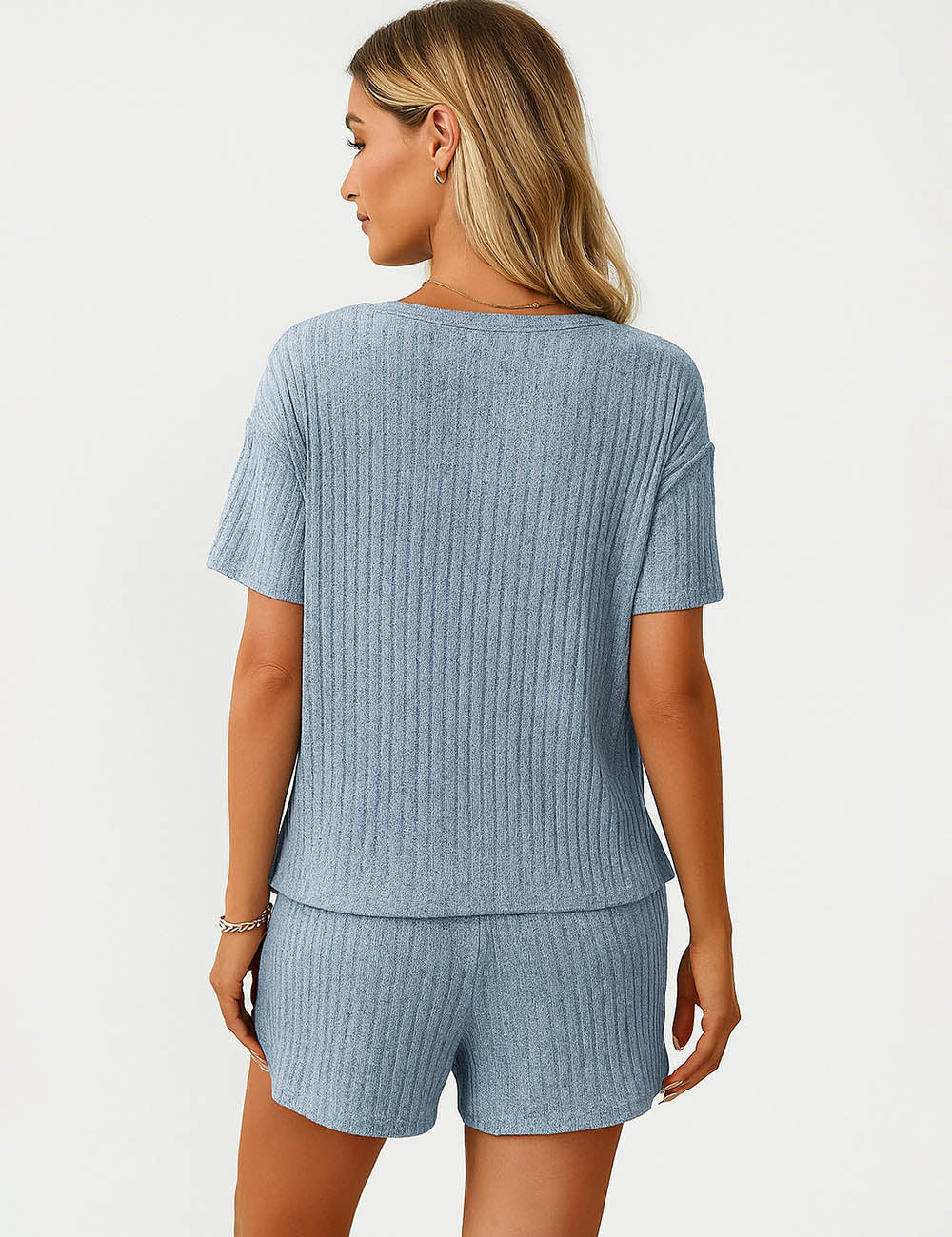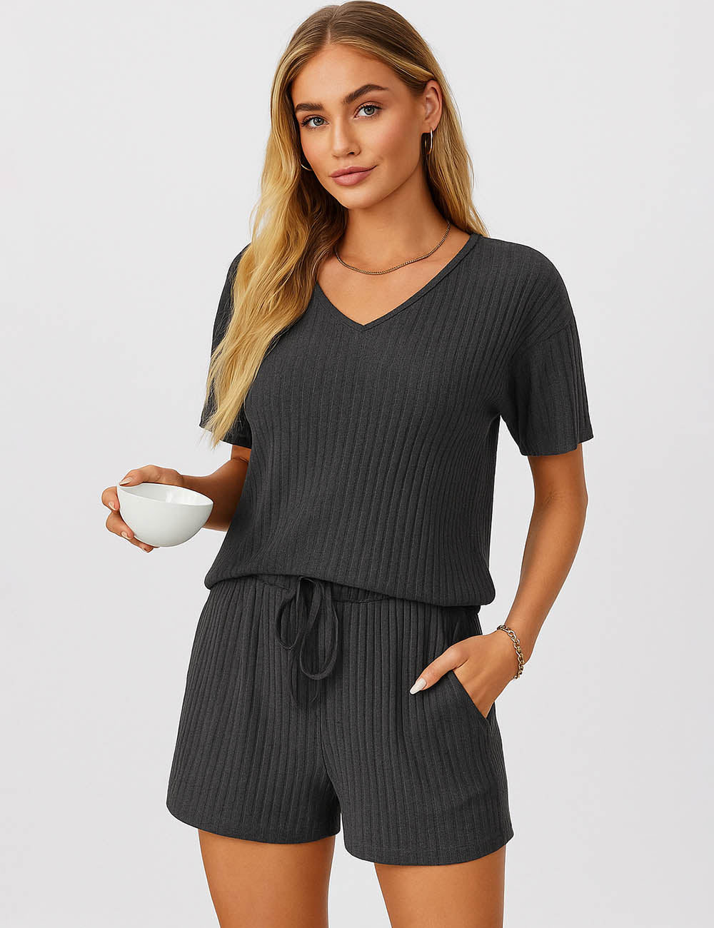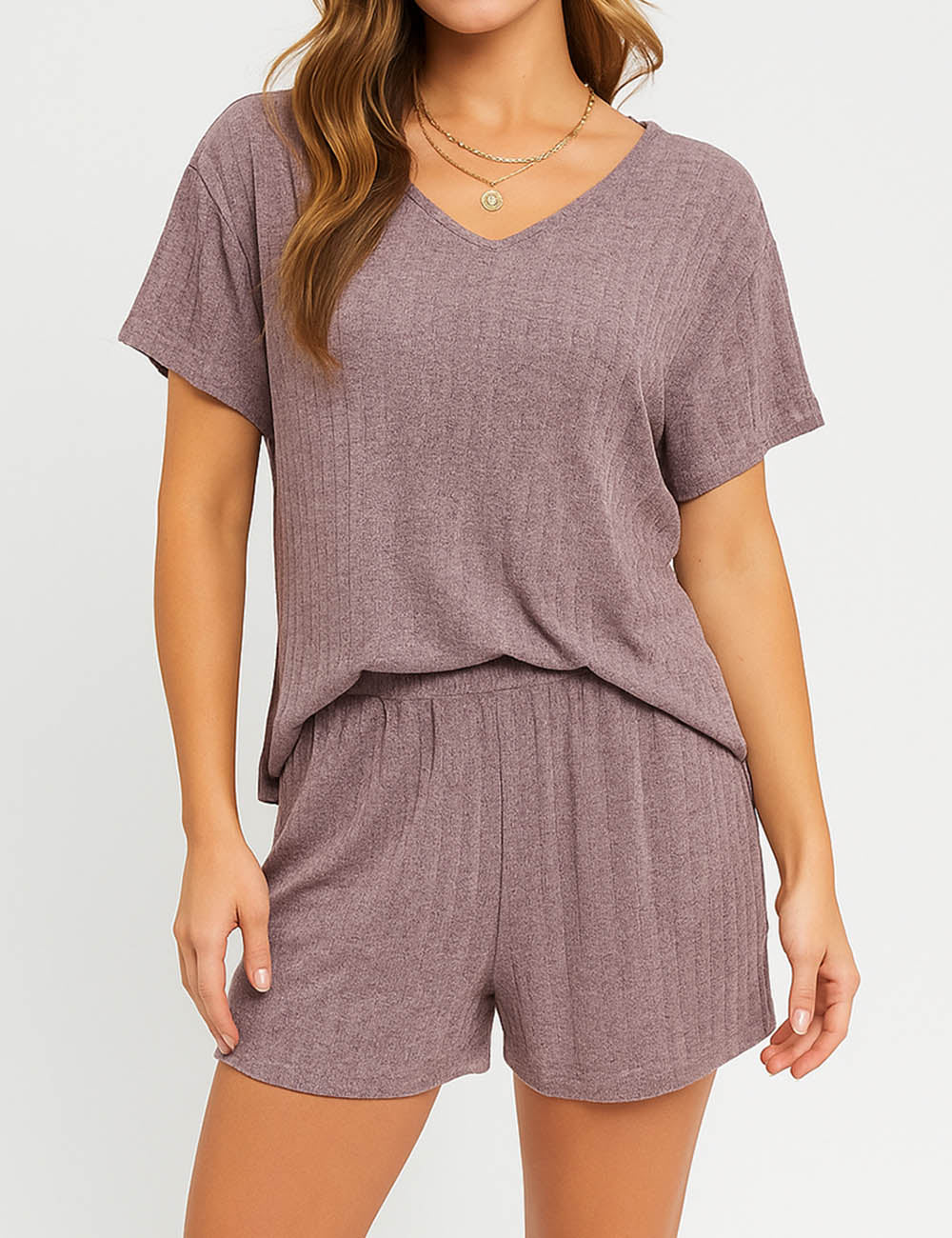 Ladies Ribbed Knit Set V-Neck Elastic Waist Top & Shorts Set
