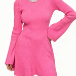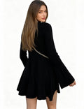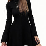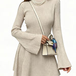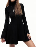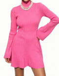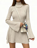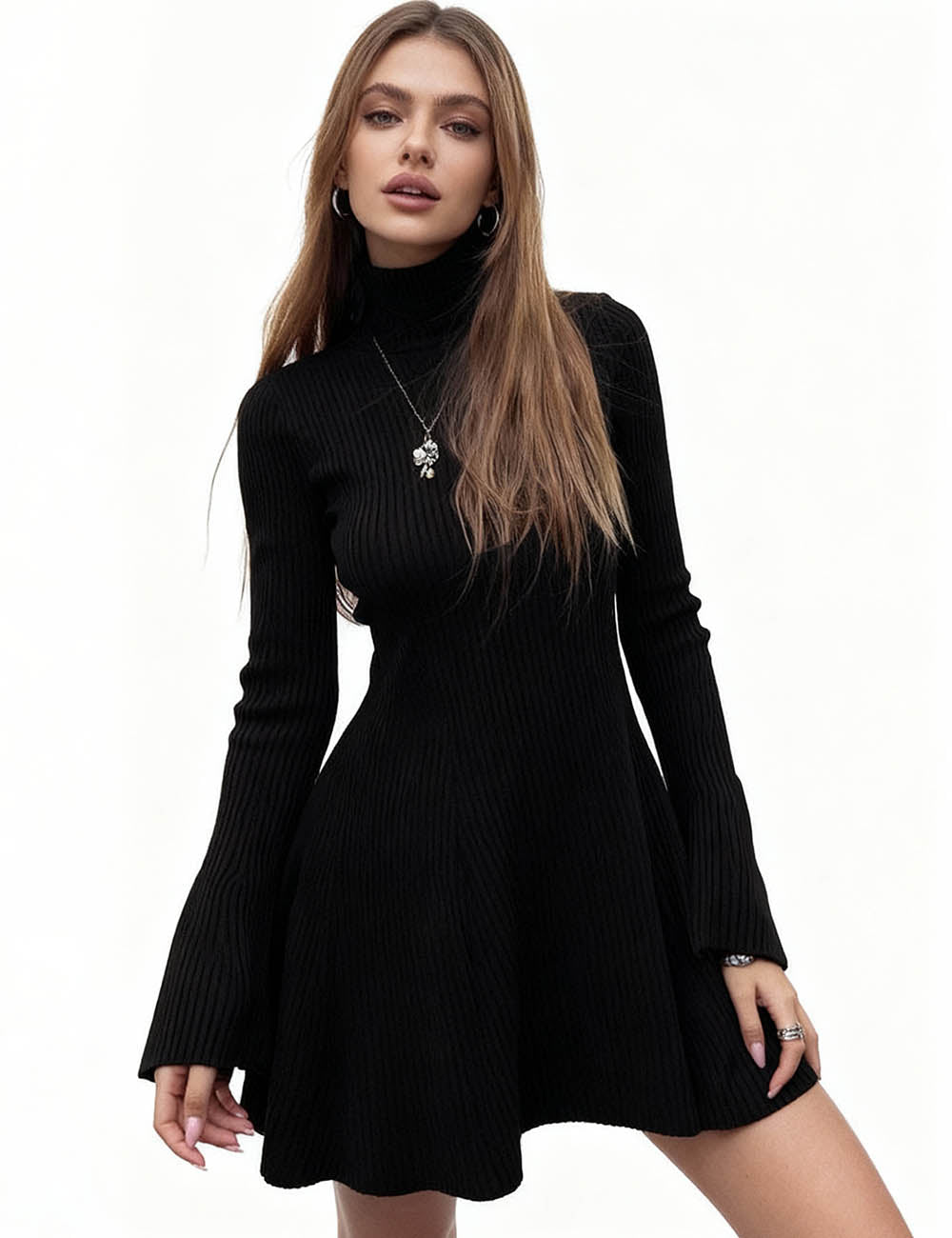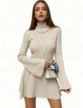 Ladies Ribbed Knit Turtle Neck Flared Sleeves Mini Dress