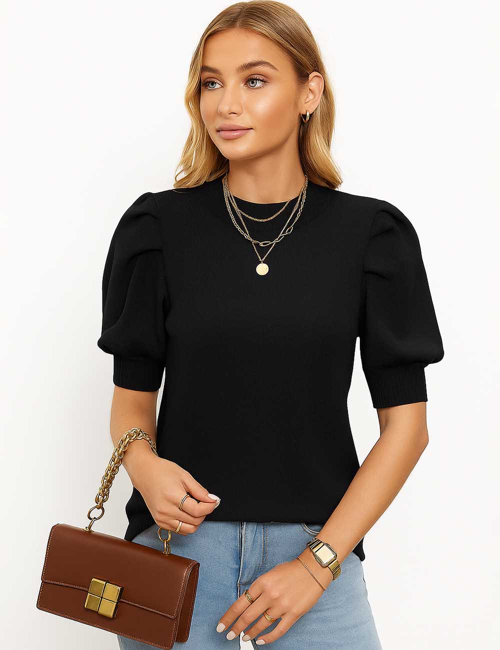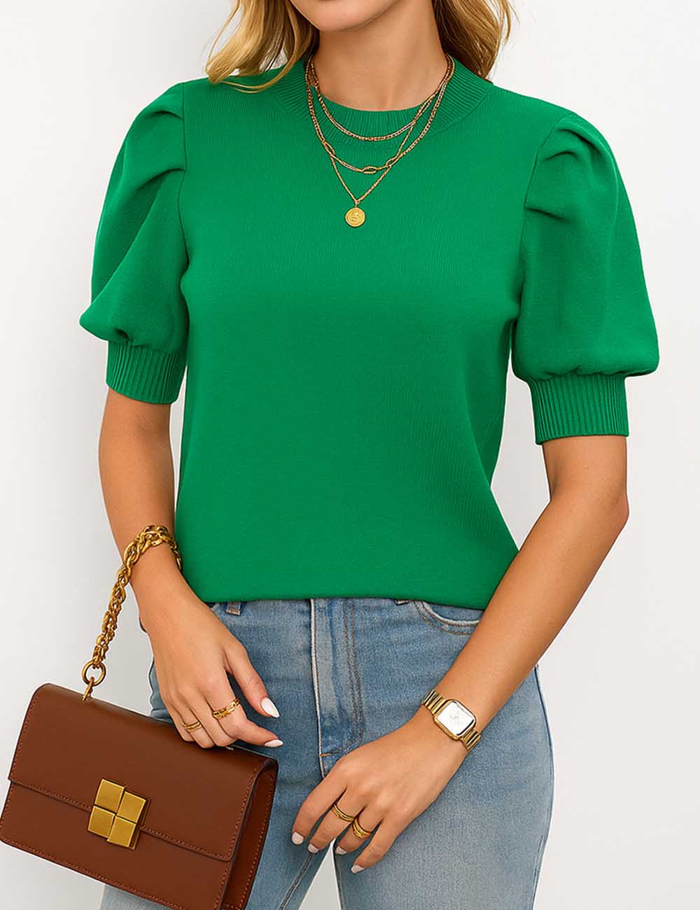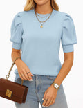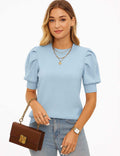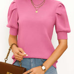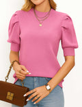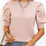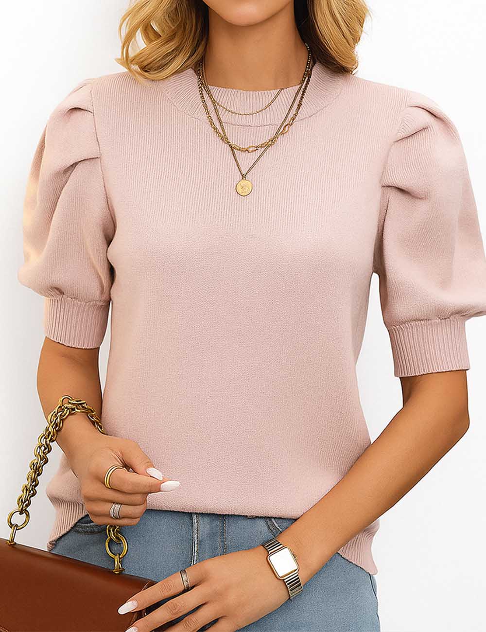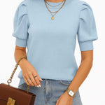 Ladies Ribbed Round Neck Puff Sleeves Knit Top