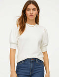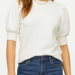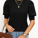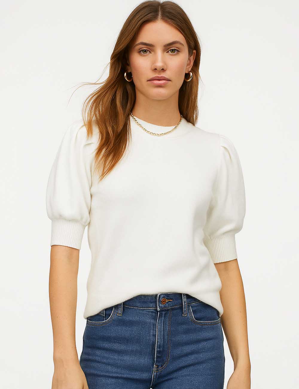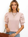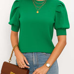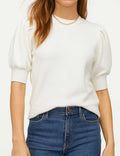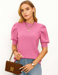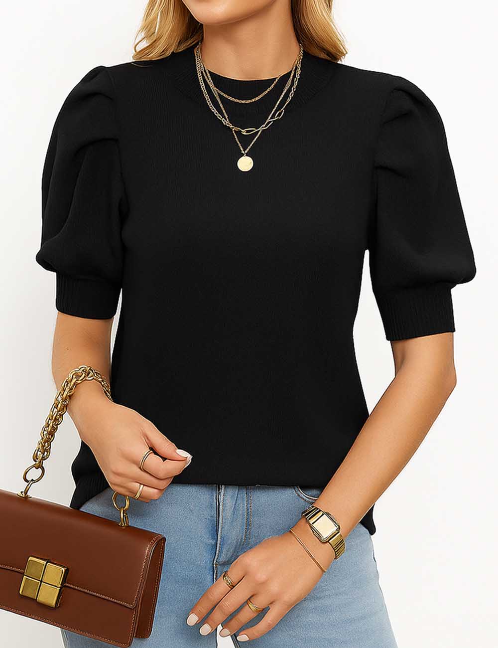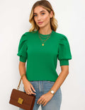 Ladies Ribbed Round Neck Puff Sleeves Knit Top