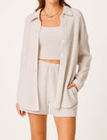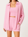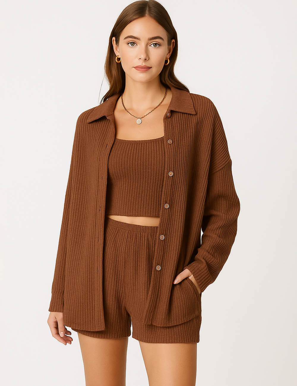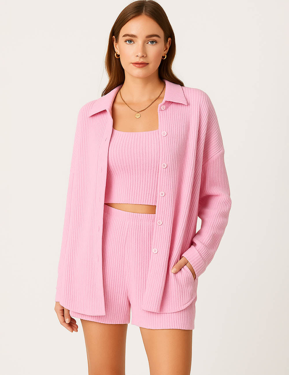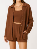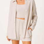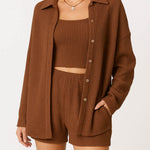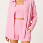 Ladies Ribbed Tube Top Button Down Shirt Shorts 3PCS Set