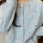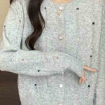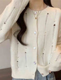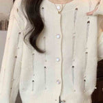 Ladies Round Collar Long Sleeves Distressed Knit Cardigan