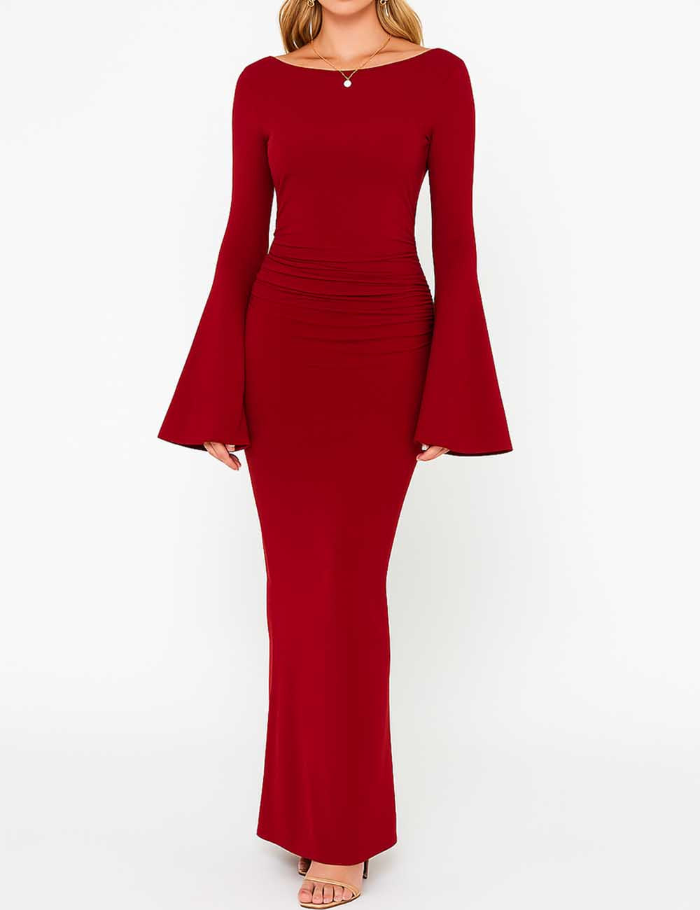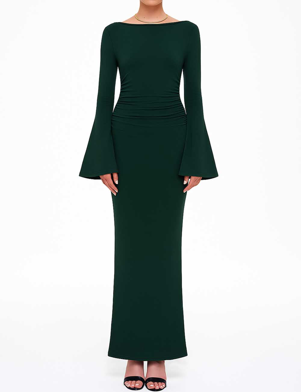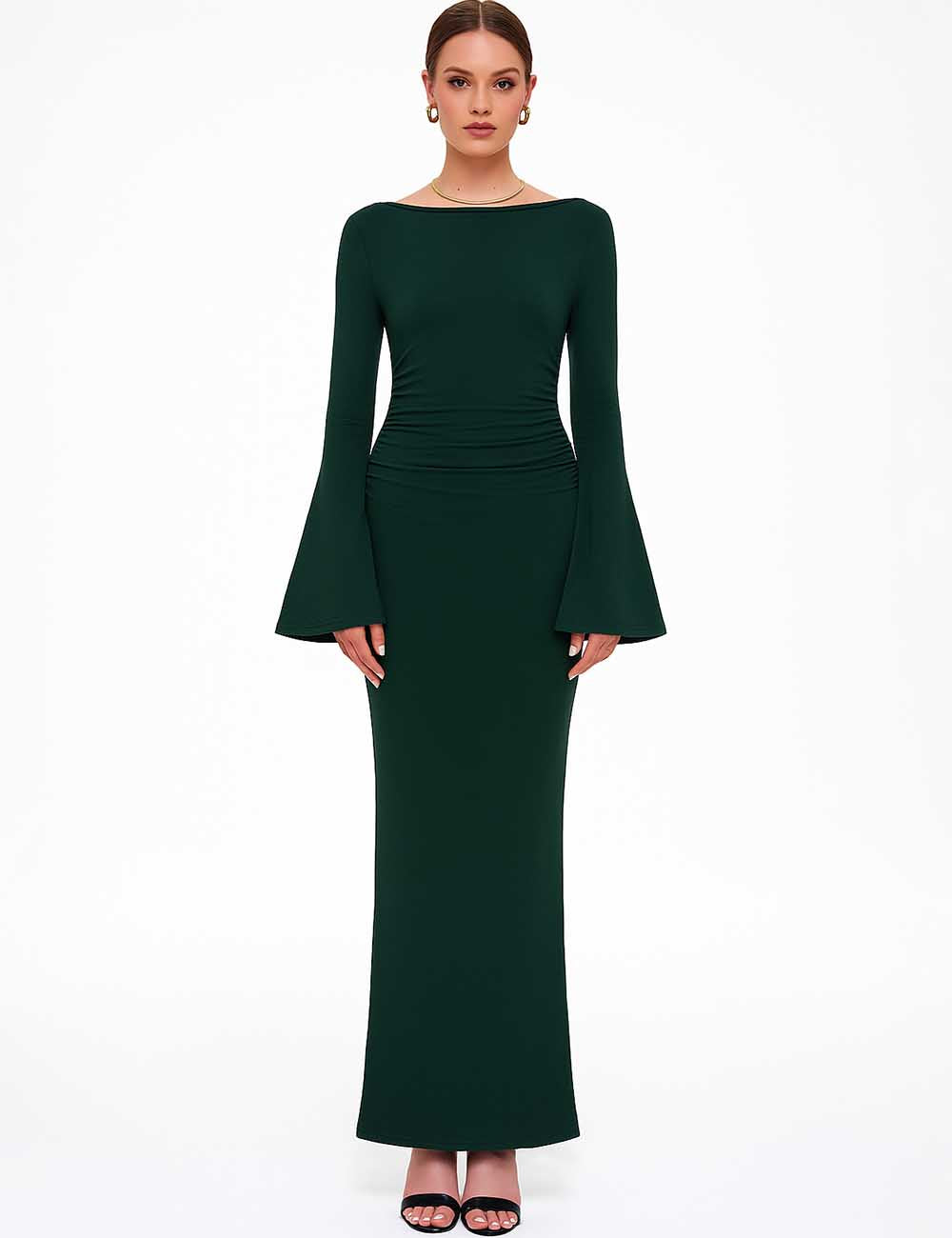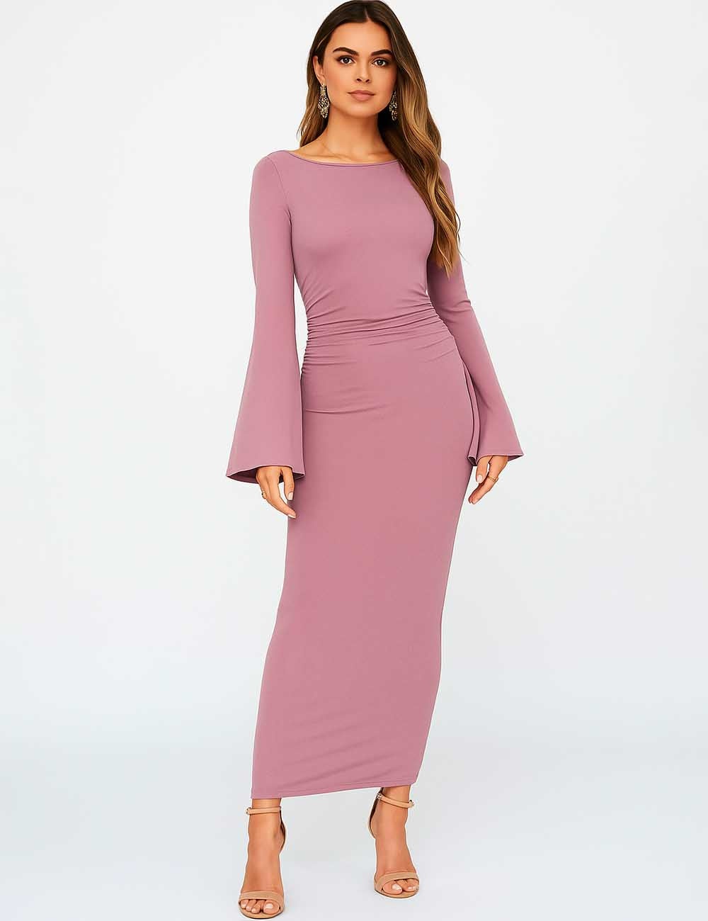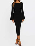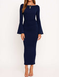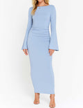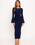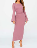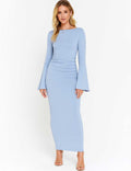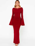 Ladies Round Neck Flared Sleeves Hip Wrap Split Maxi Dress