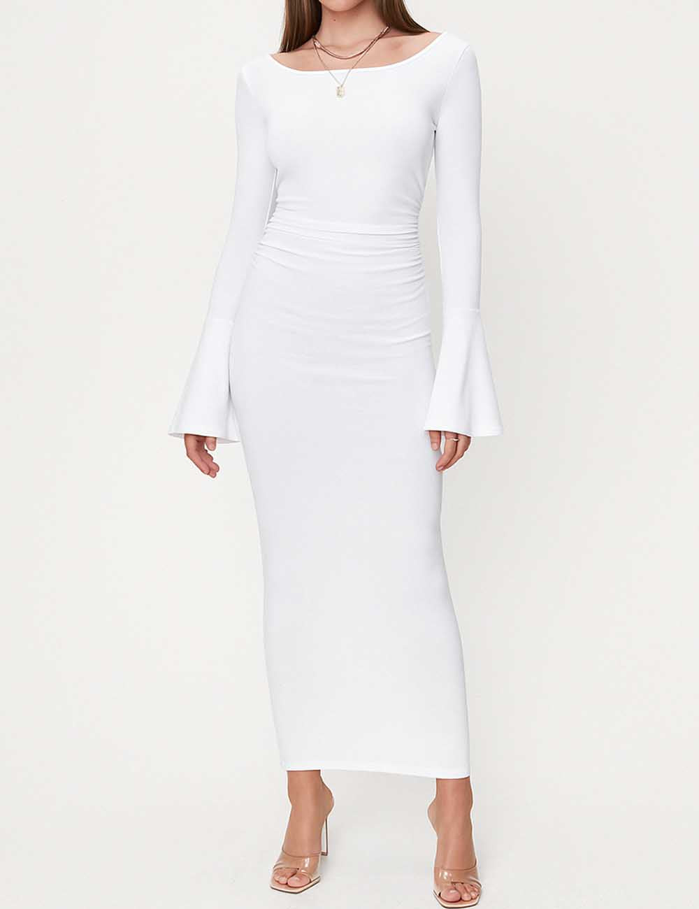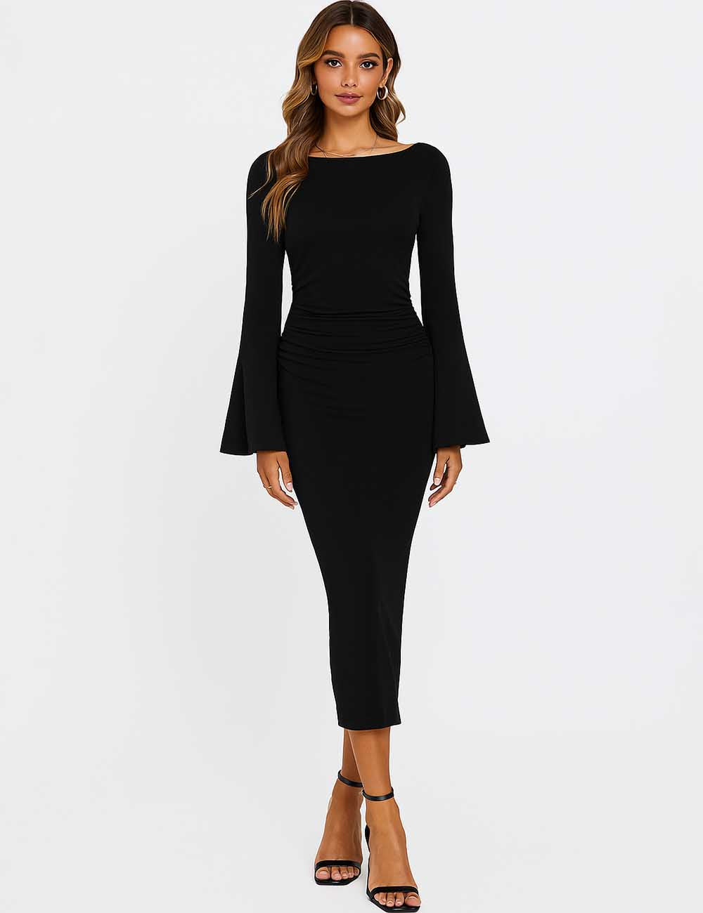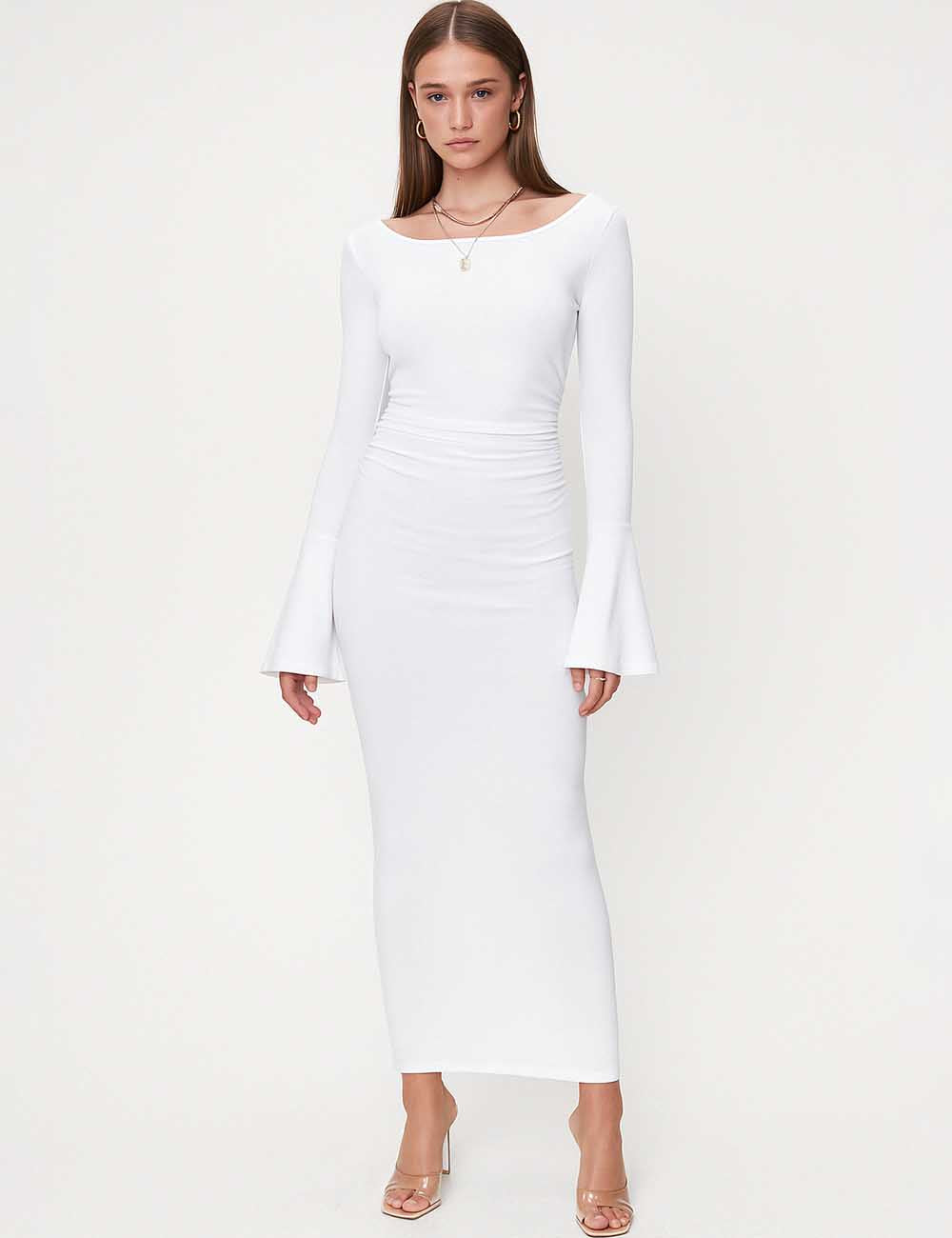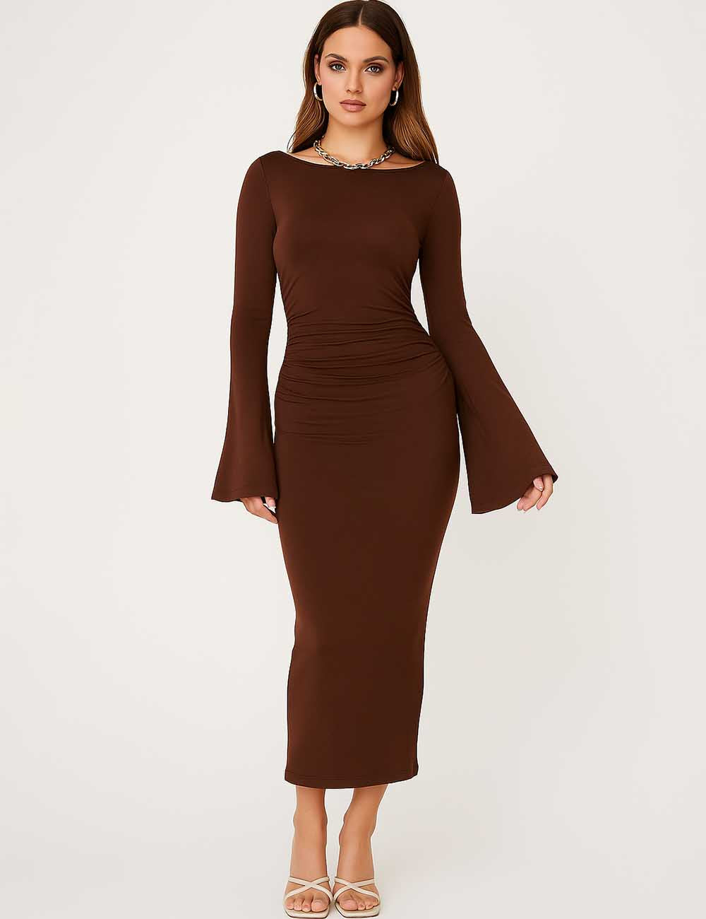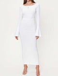 Ladies Round Neck Flared Sleeves Hip Wrap Split Maxi Dress