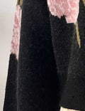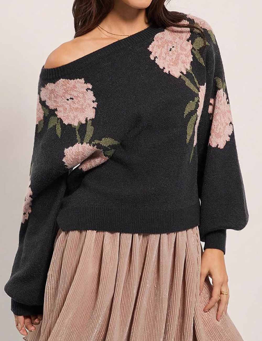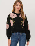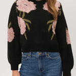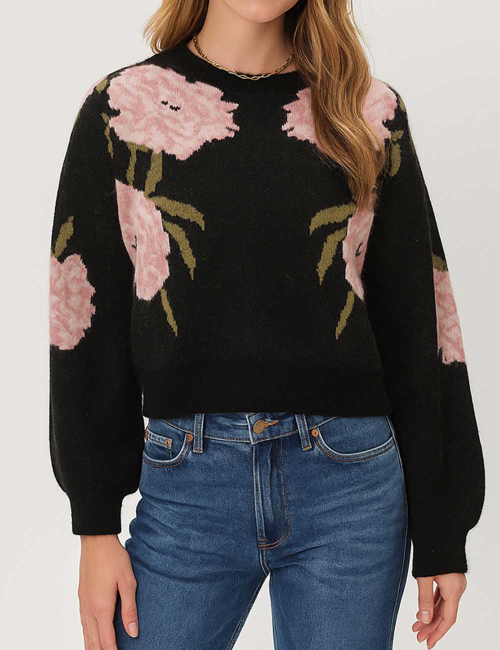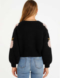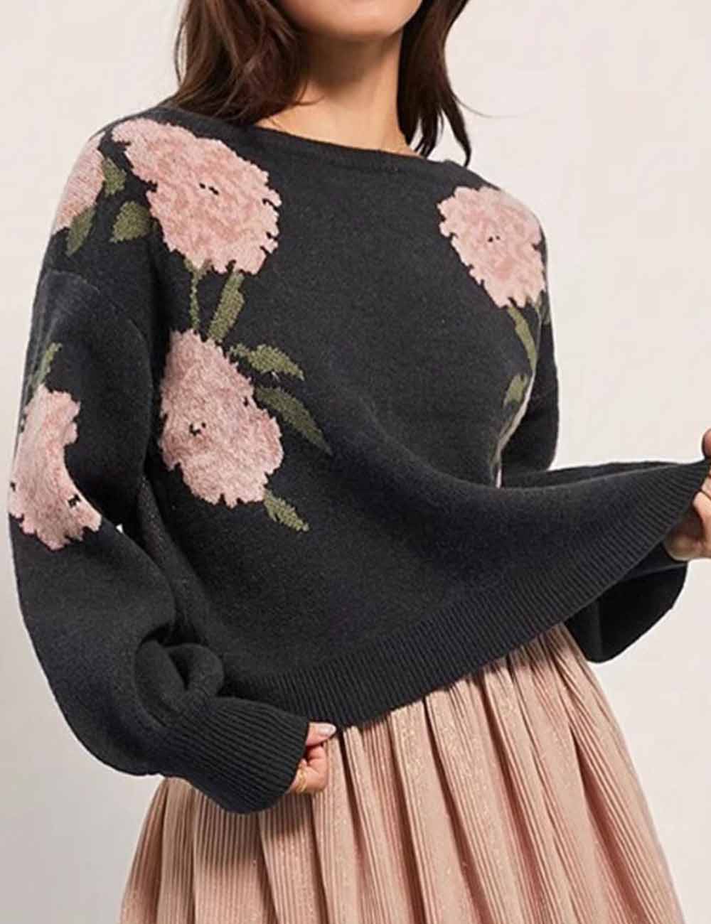 Ladies Round Neck Floral Pattern Lantern Sleeves Sweater