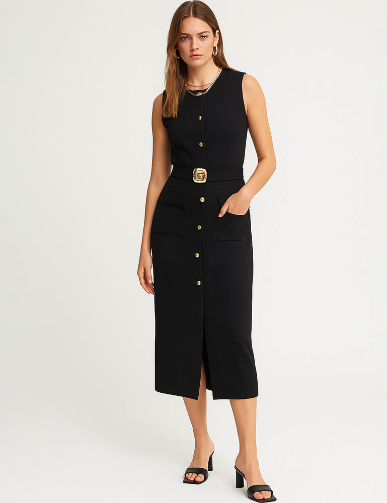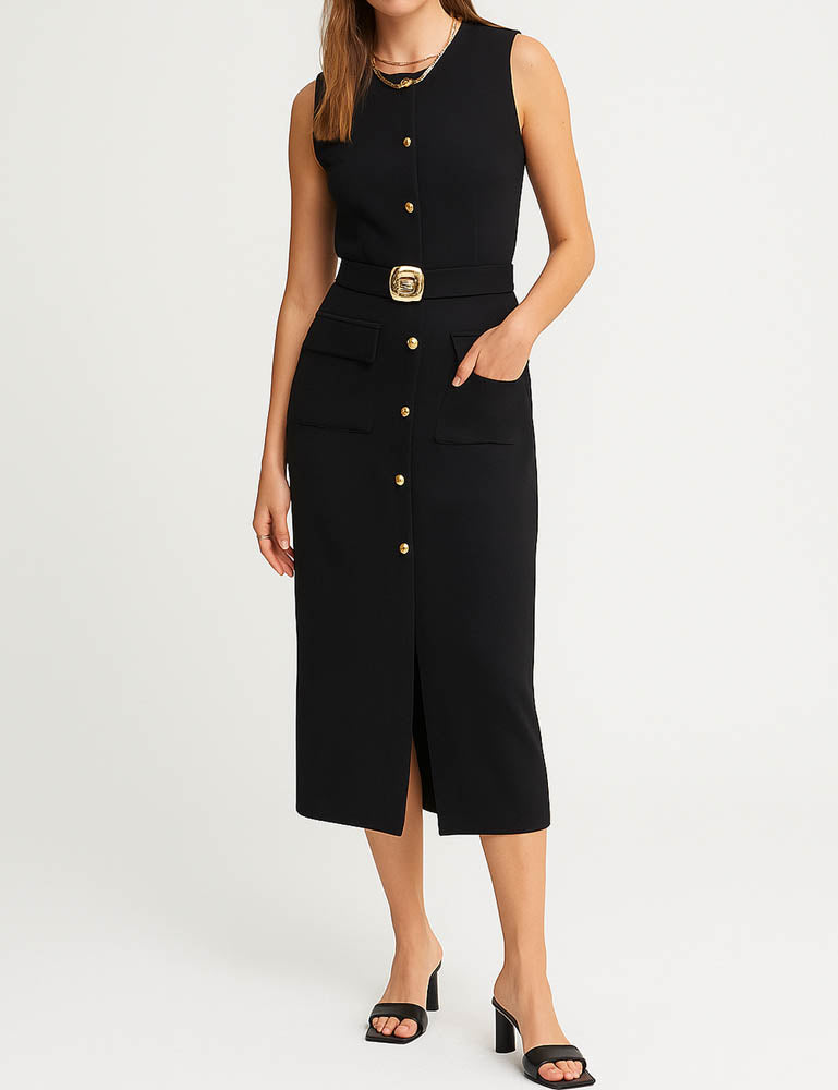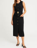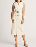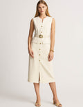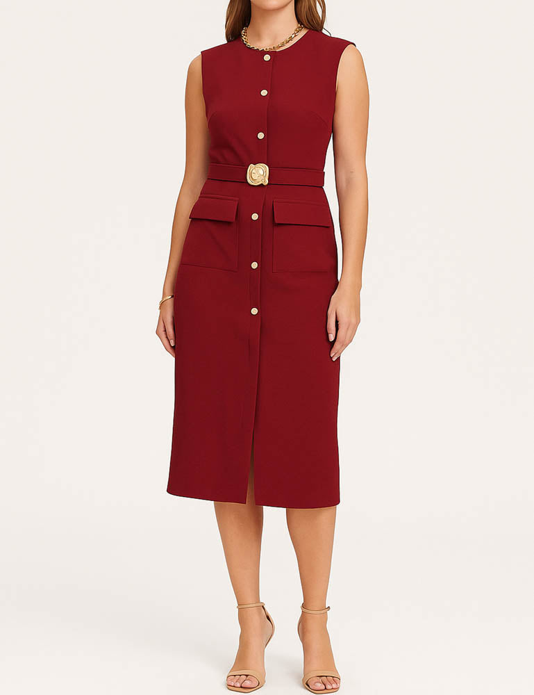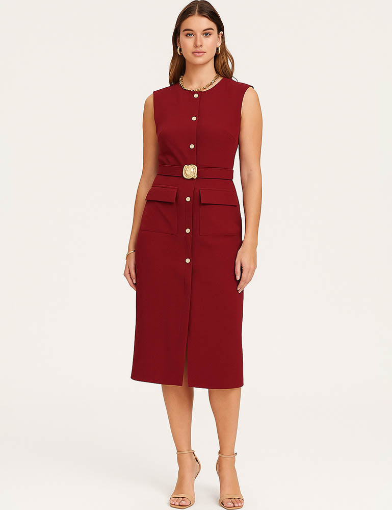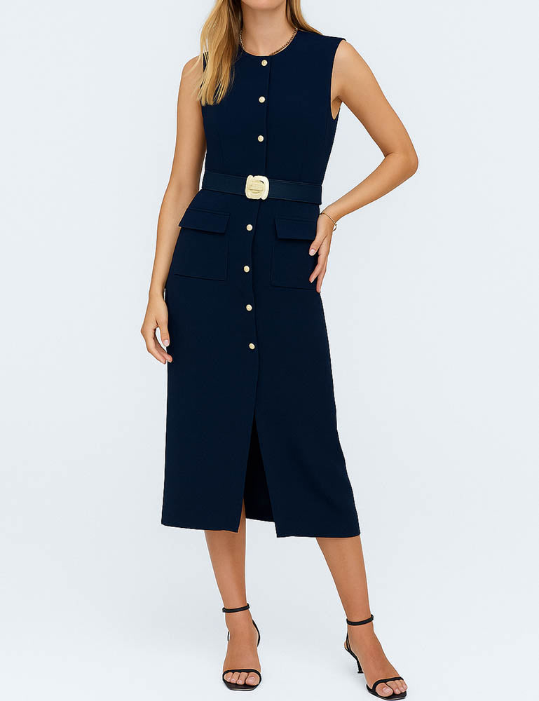 Ladies Round Neck Metal Button Sleeveless Belted Midi Dress