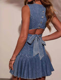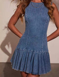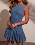 Ladies Round Neck Sleeveless Pleated Denim Mini Dress