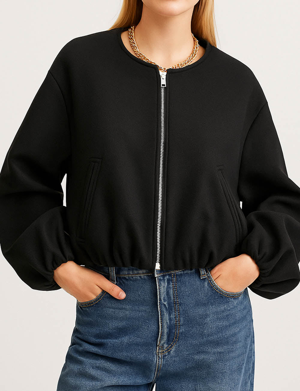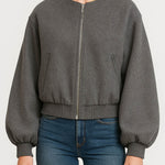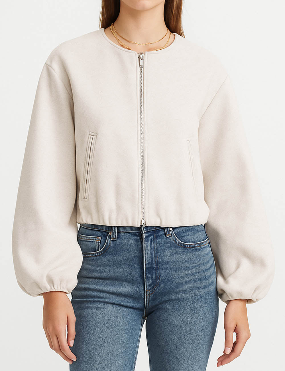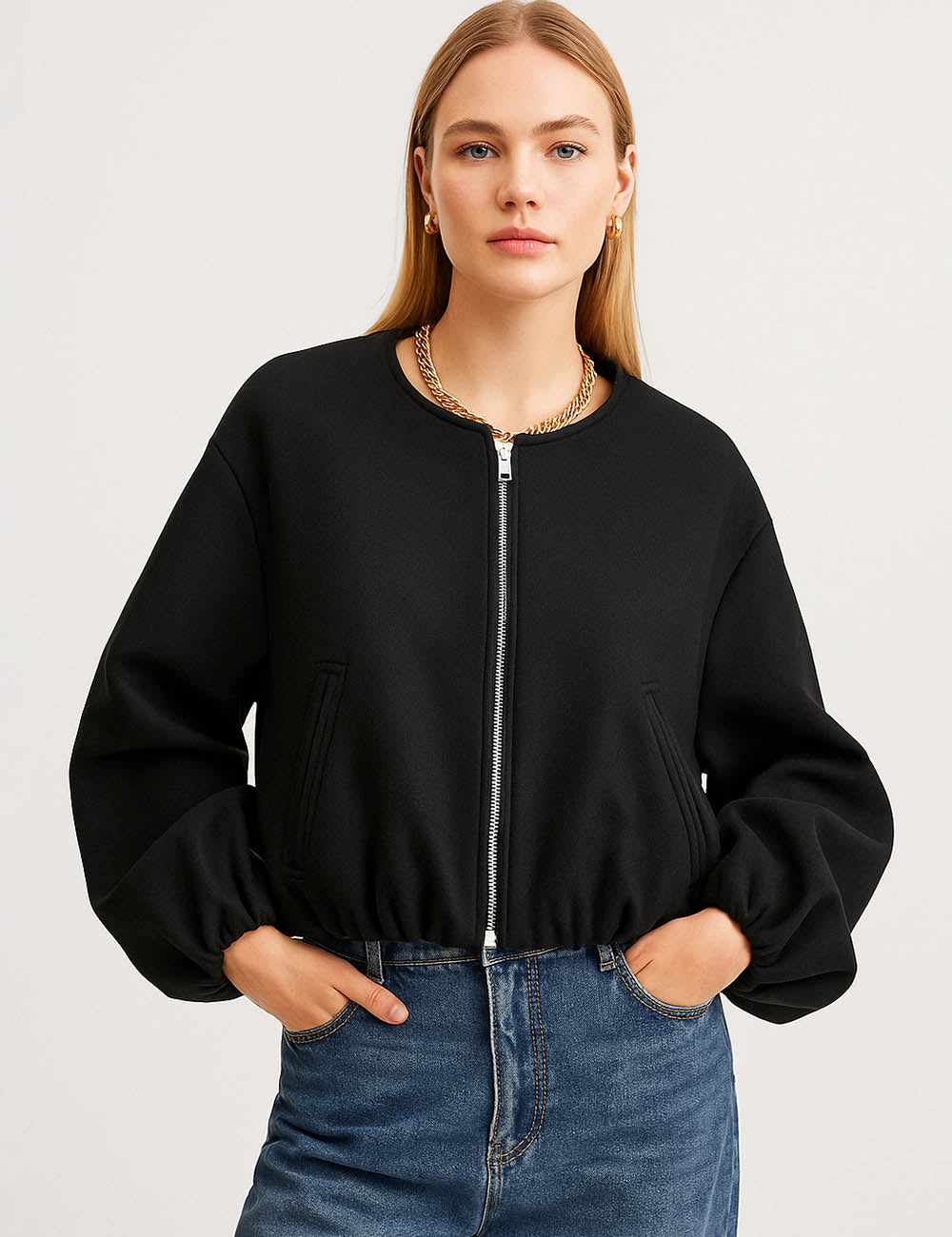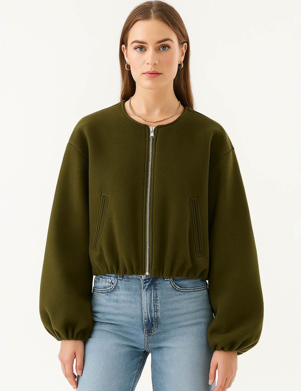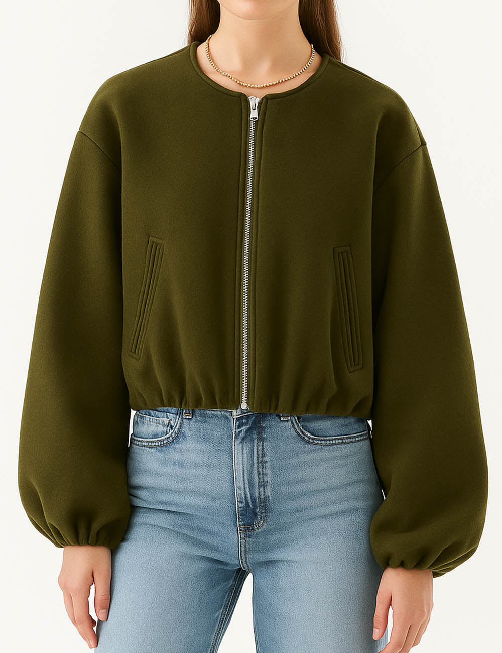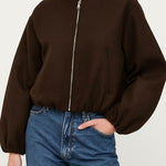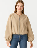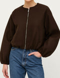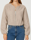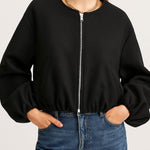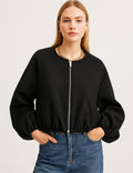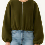 Ladies Round Neck Zipper Front Puff Sleeves Jacket