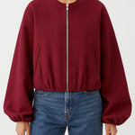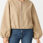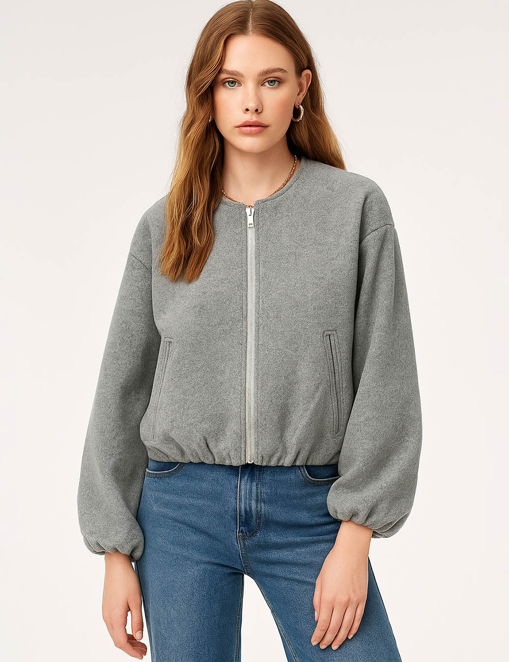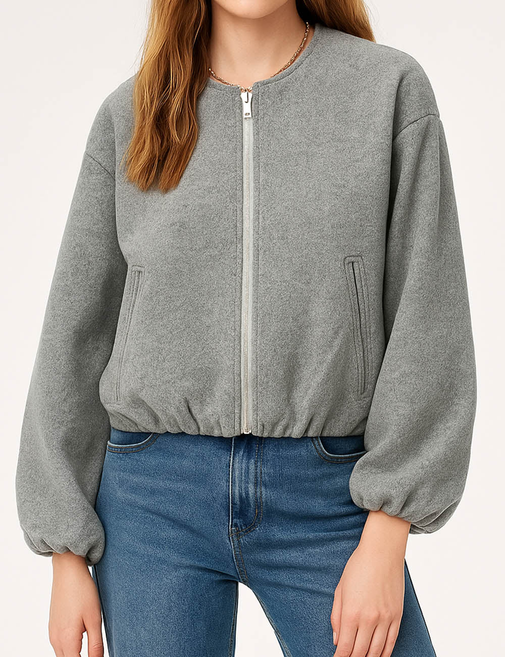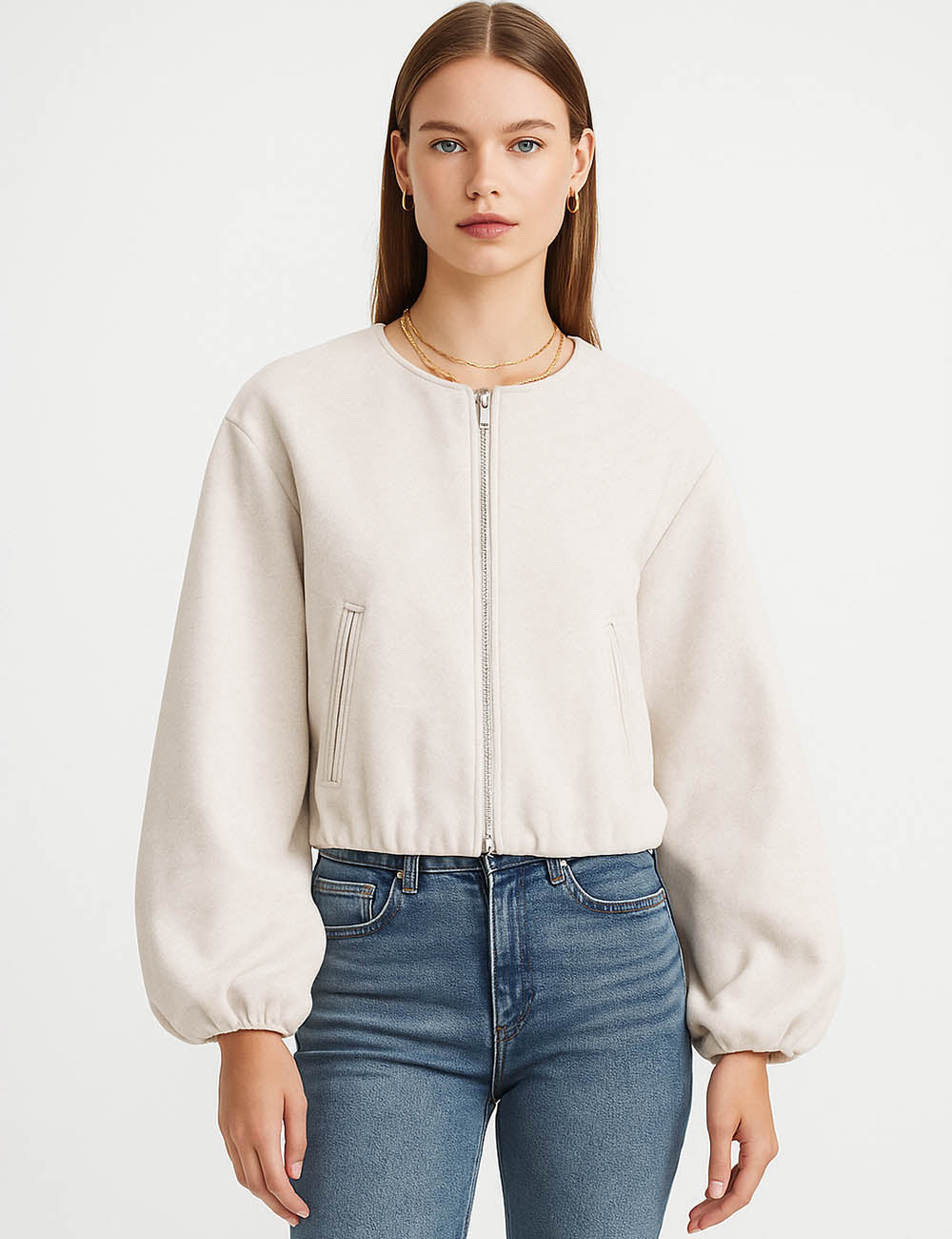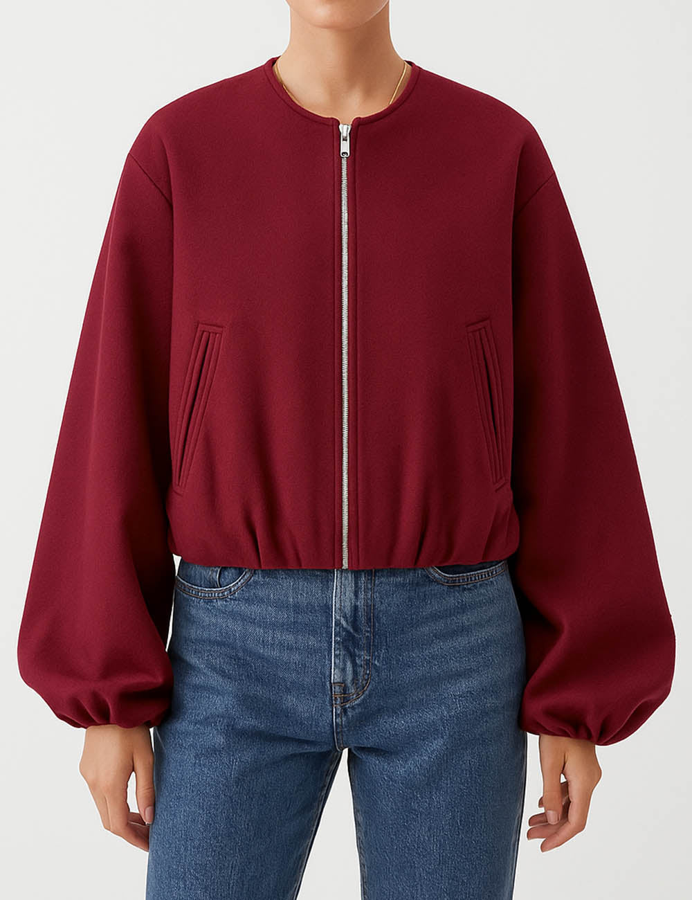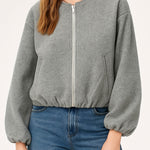 Ladies Round Neck Zipper Front Puff Sleeves Jacket