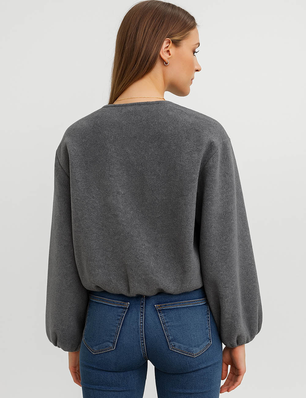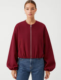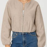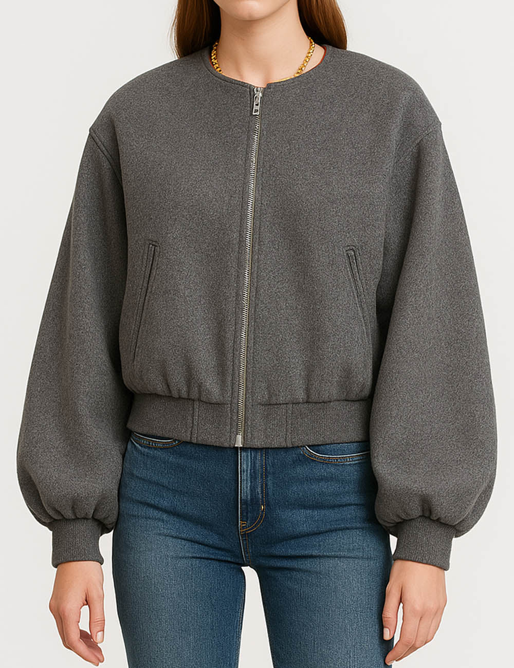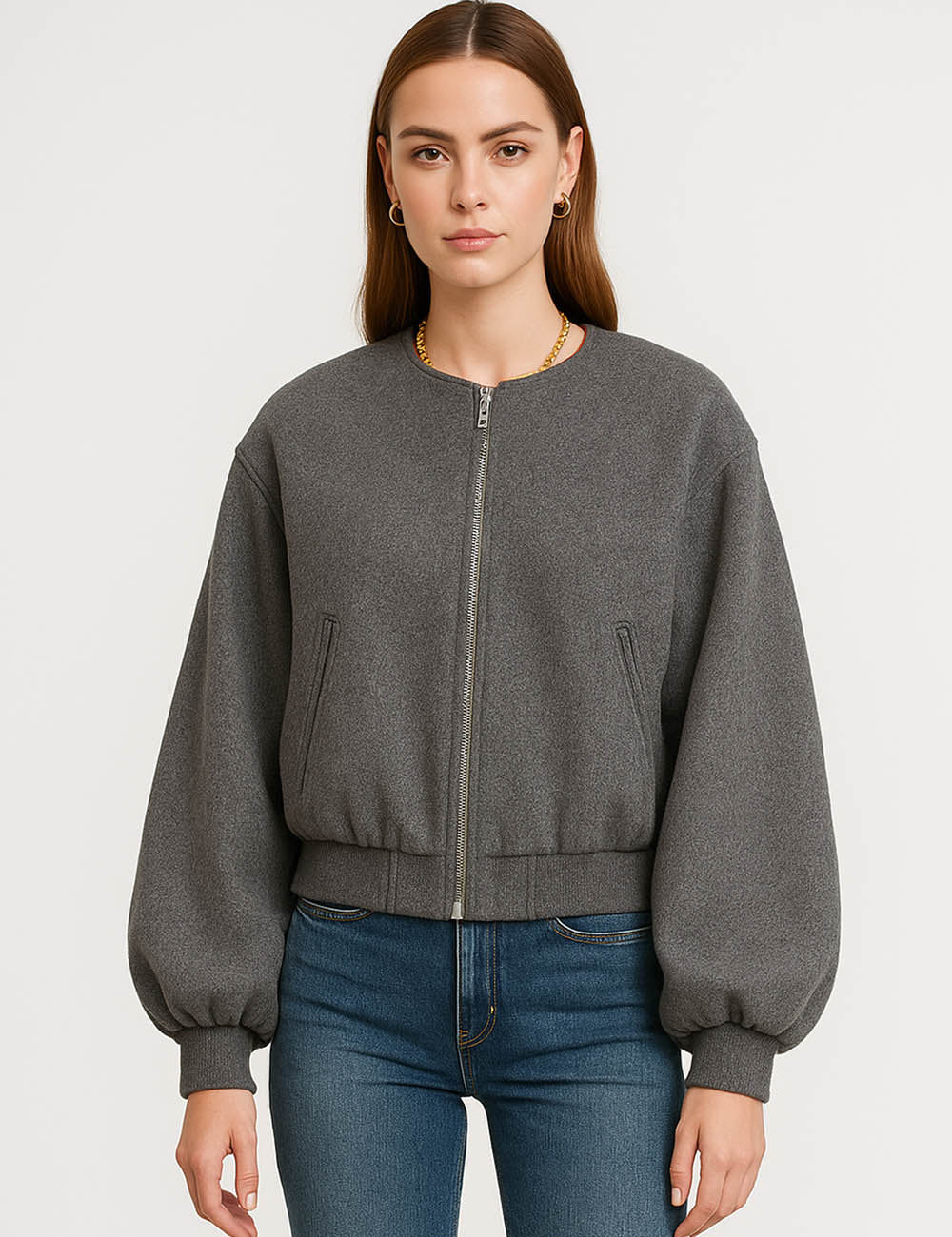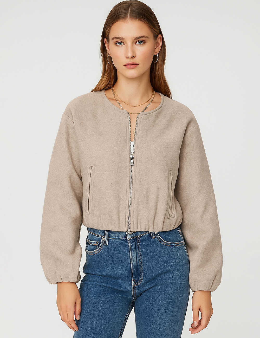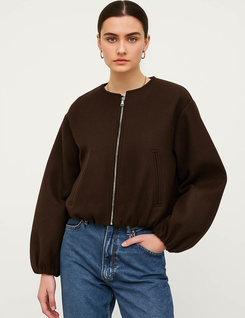 Ladies Round Neck Zipper Front Puff Sleeves Jacket