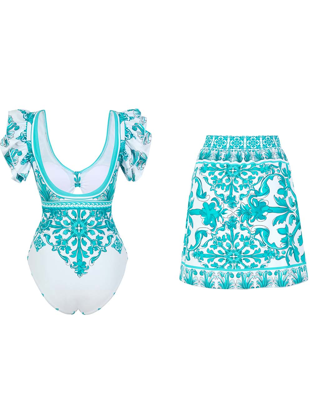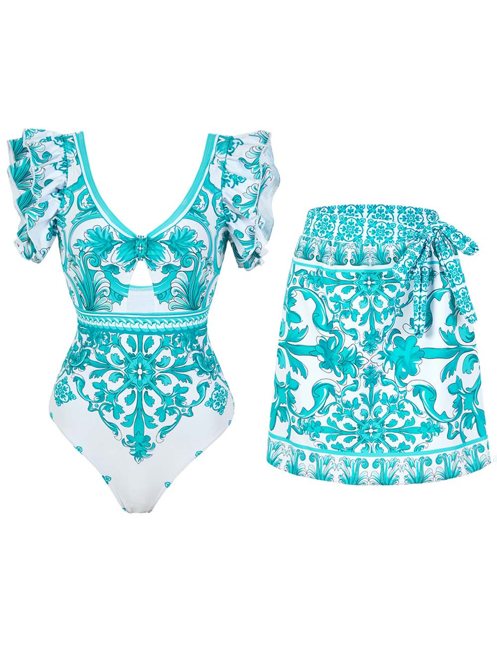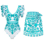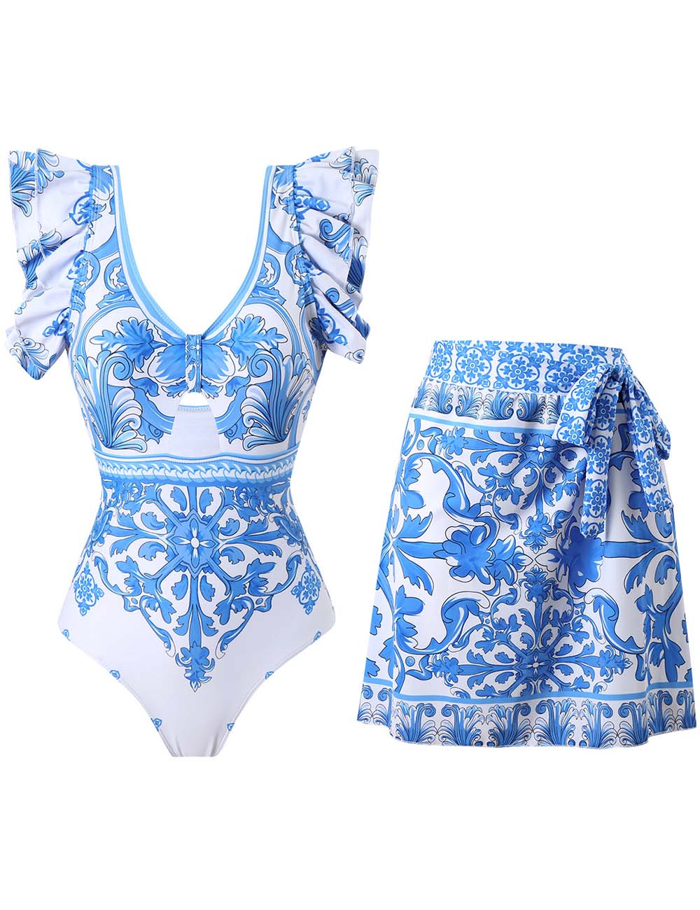 Ladies Ruff Sleeves One-Piece Swimsuit & Wrap Tie Sarong Skirt Set