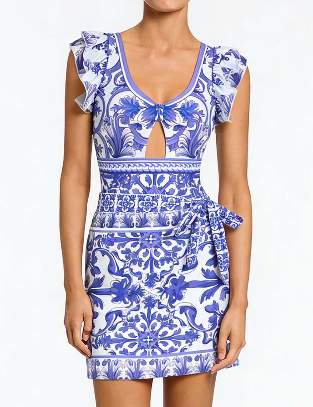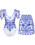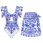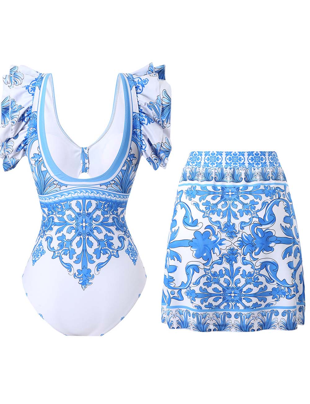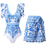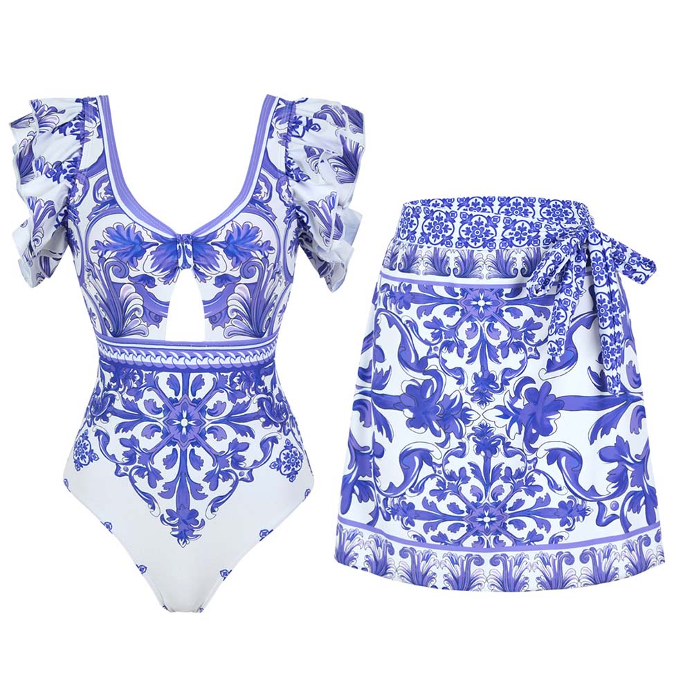 Ladies Ruff Sleeves One-Piece Swimsuit & Wrap Tie Sarong Skirt Set