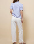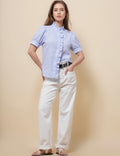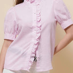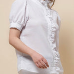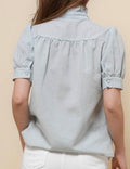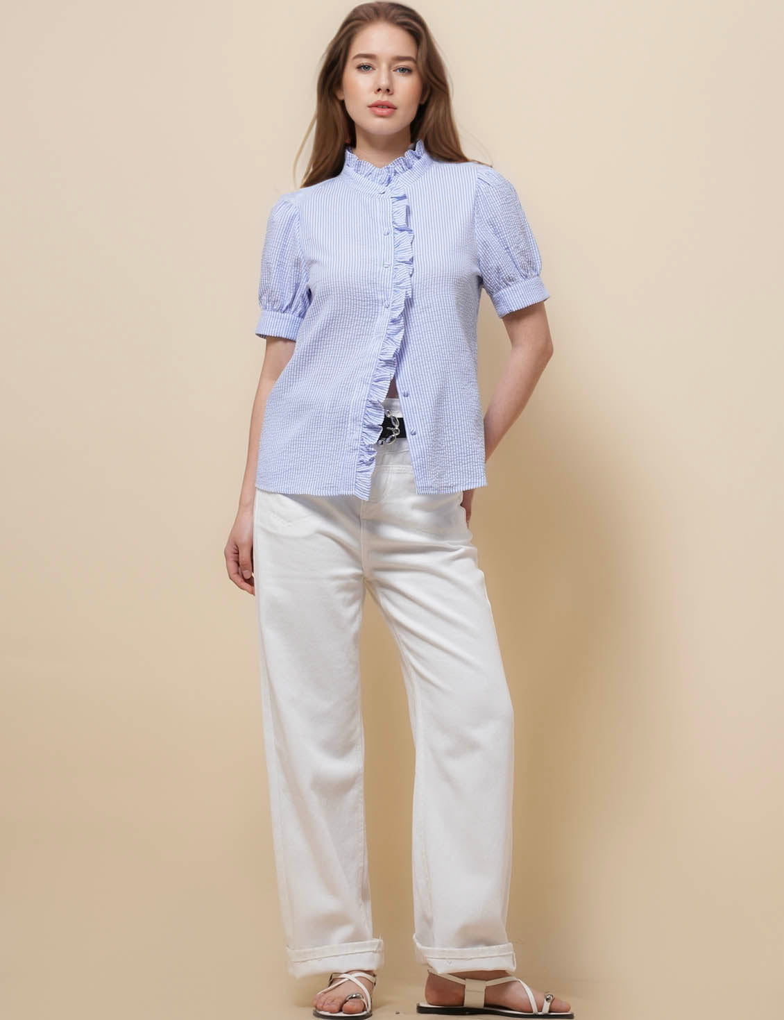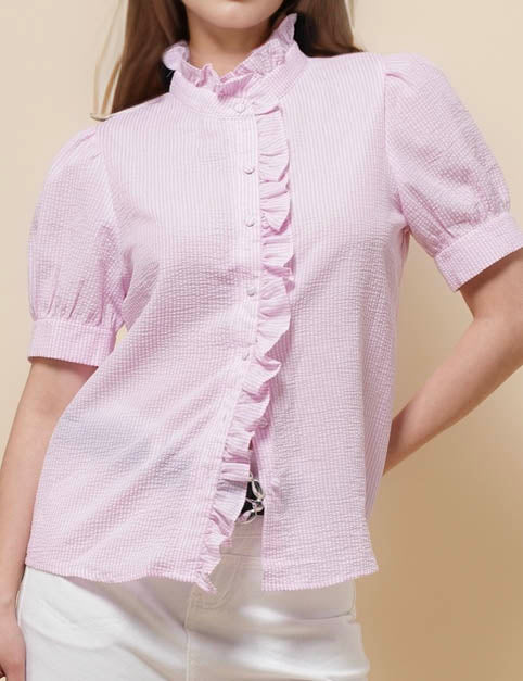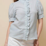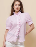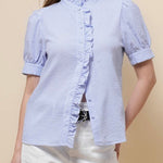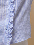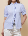 Ladies Ruffle Neck Short Sleeves Striped Shirt SKT51087