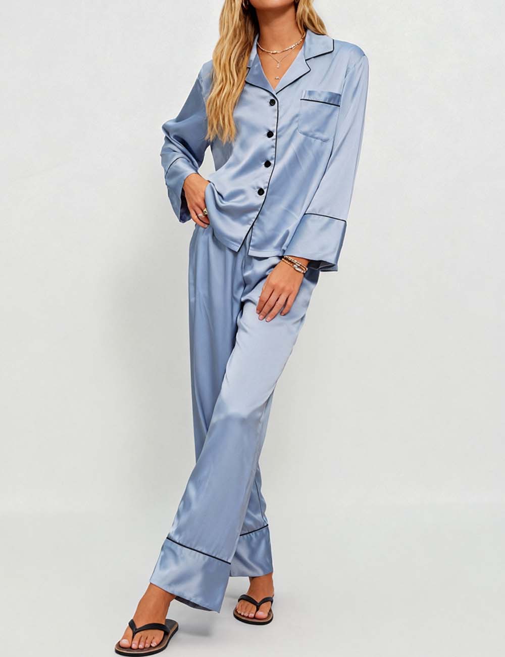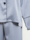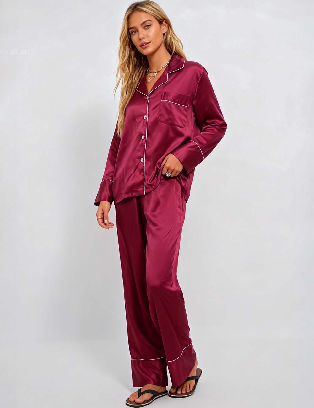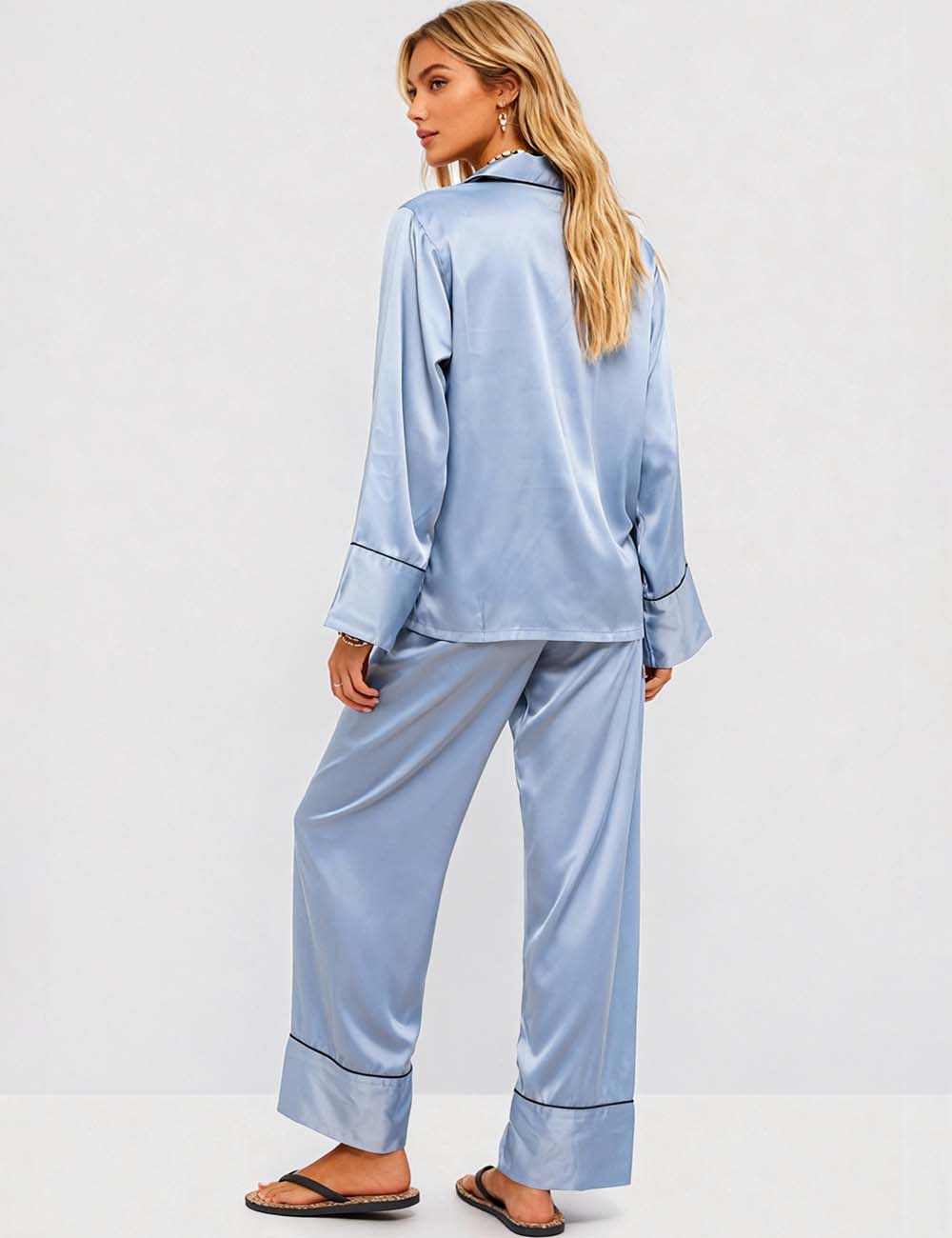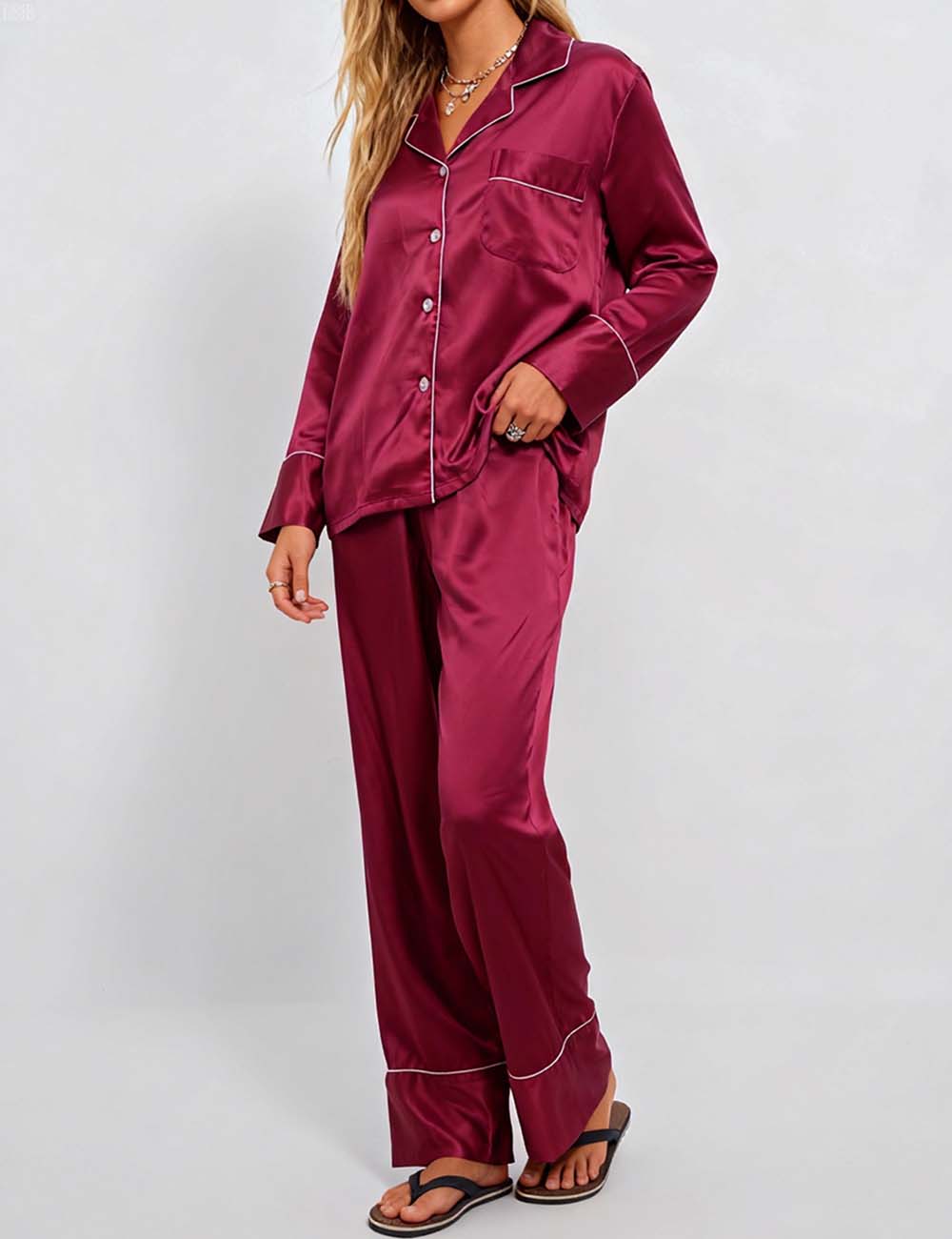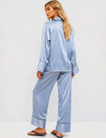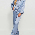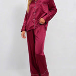 Ladies Satin Button Long Sleeves Top & Pants Loungewear Set