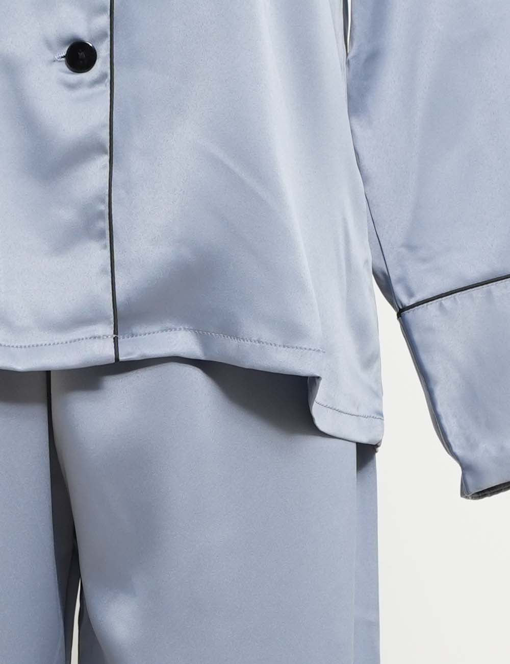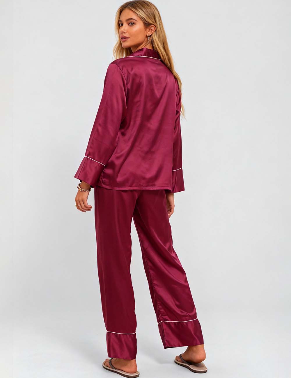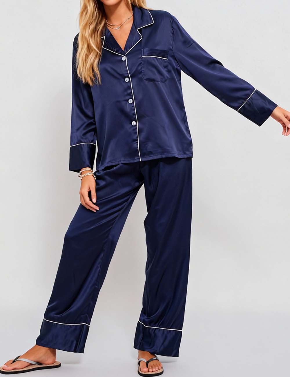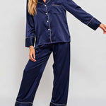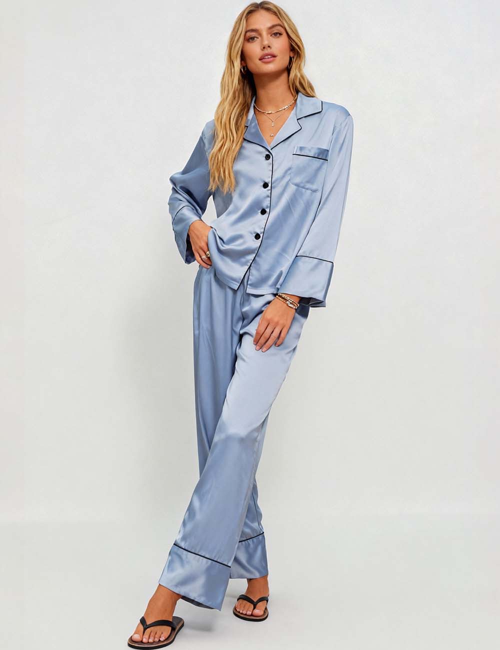 Ladies Satin Button Long Sleeves Top & Pants Loungewear Set