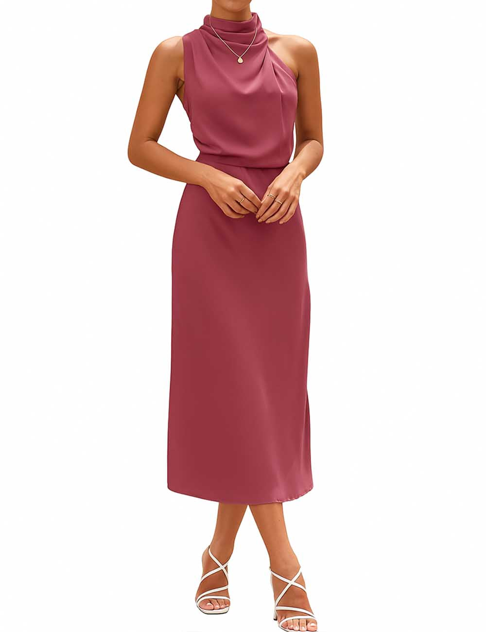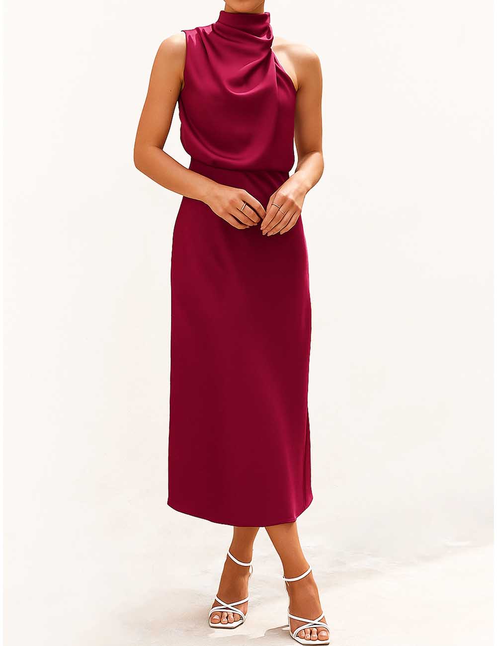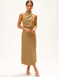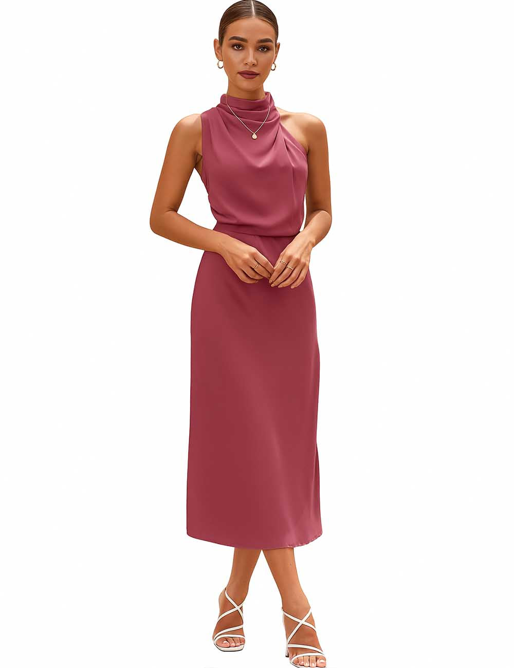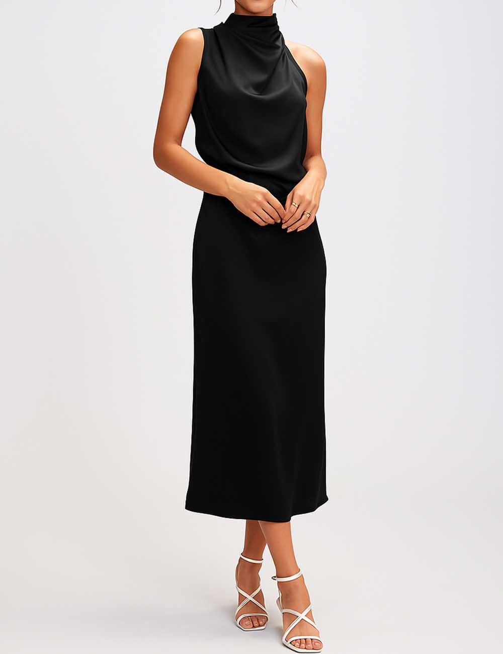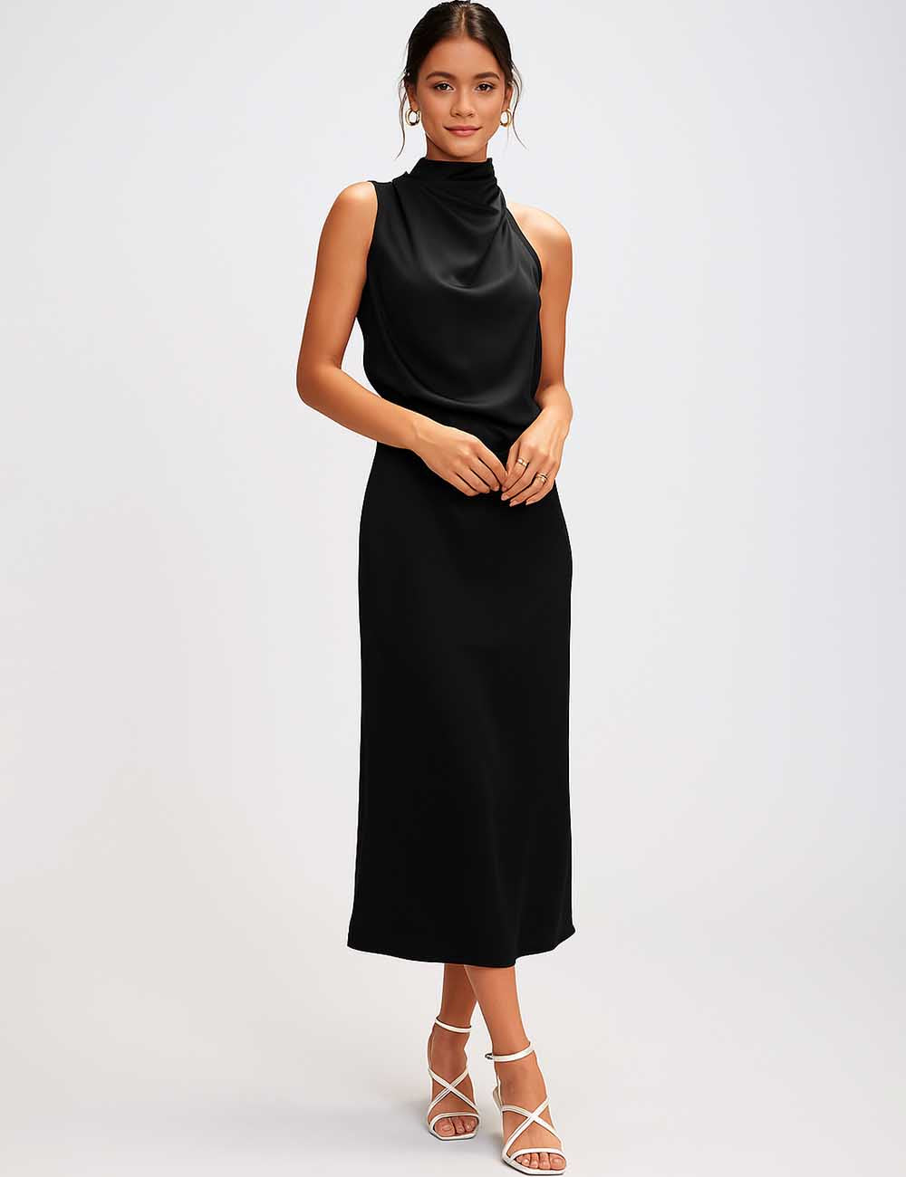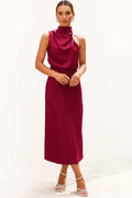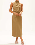 Ladies Satin Mock Neck Sleeveless Ruched Maxi Dress