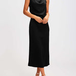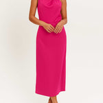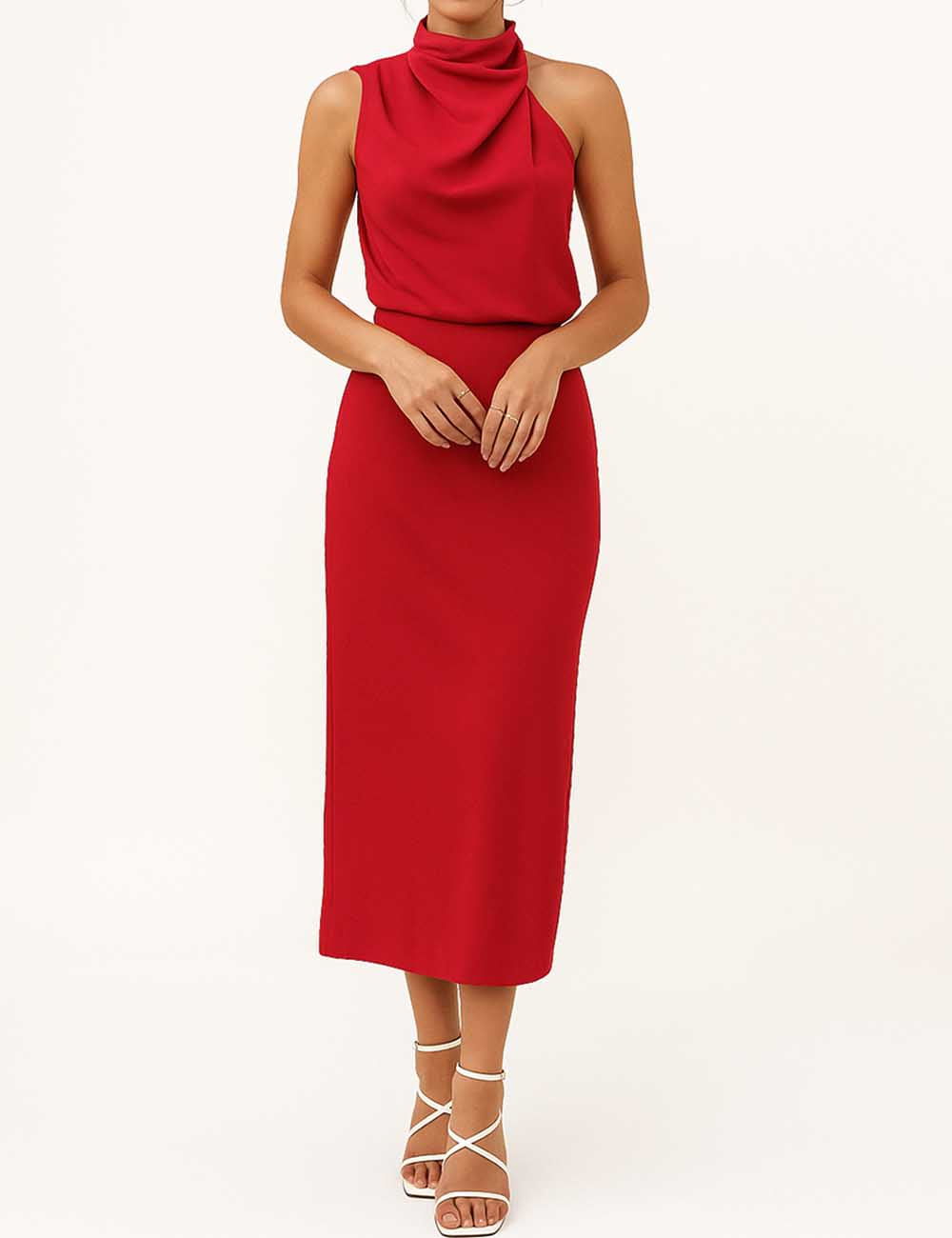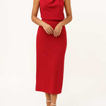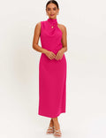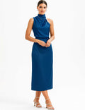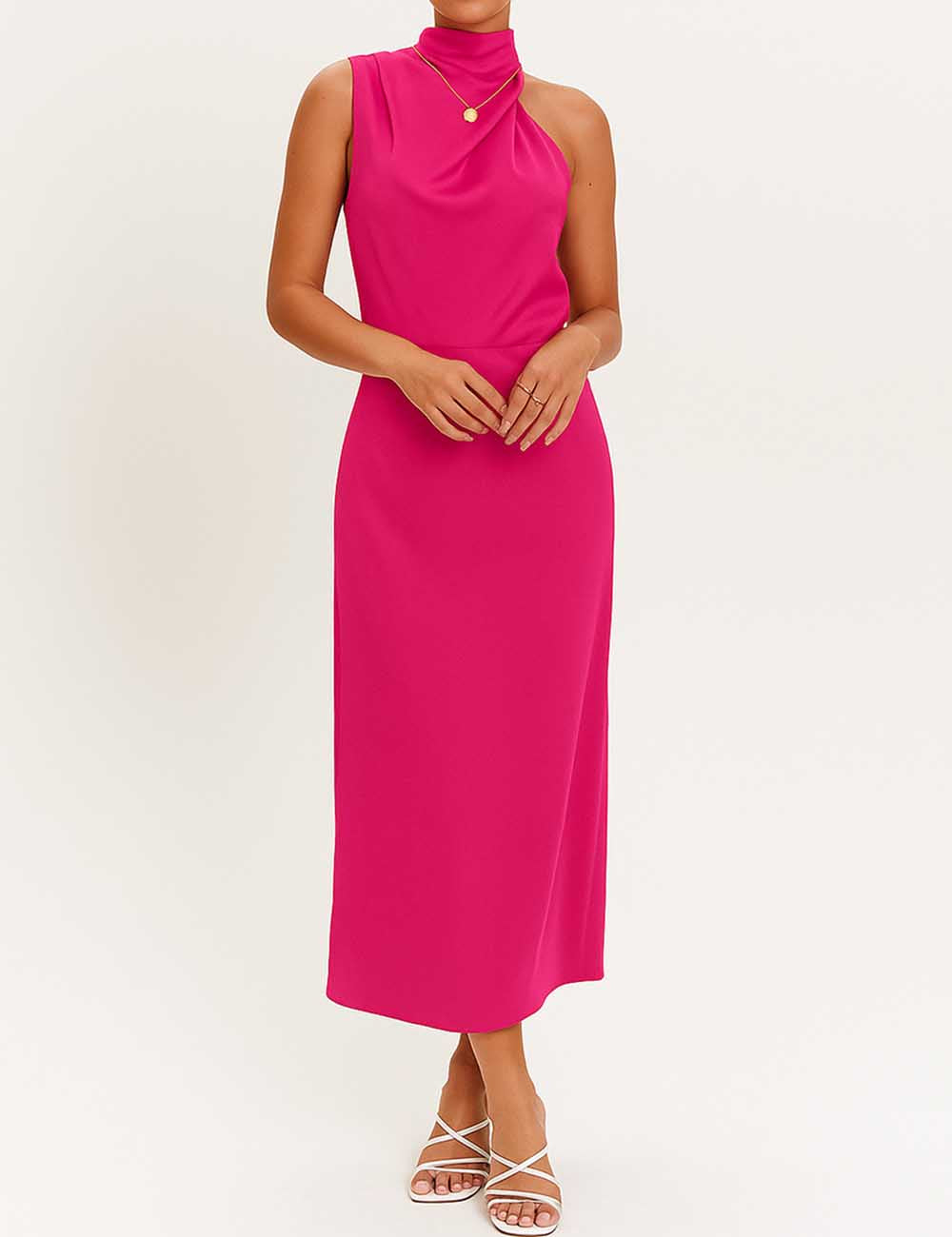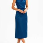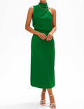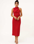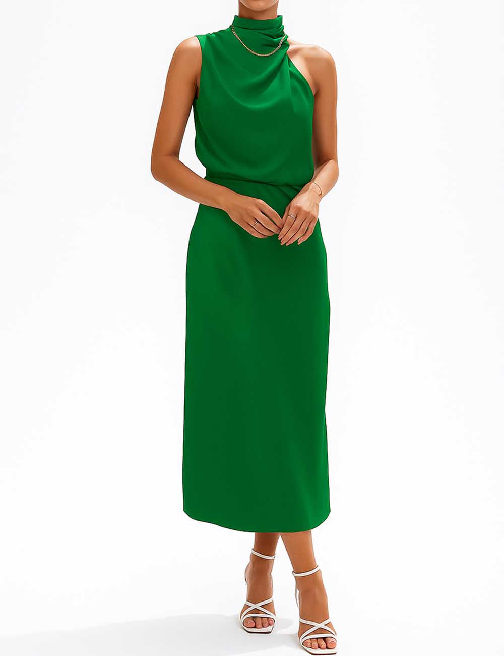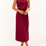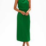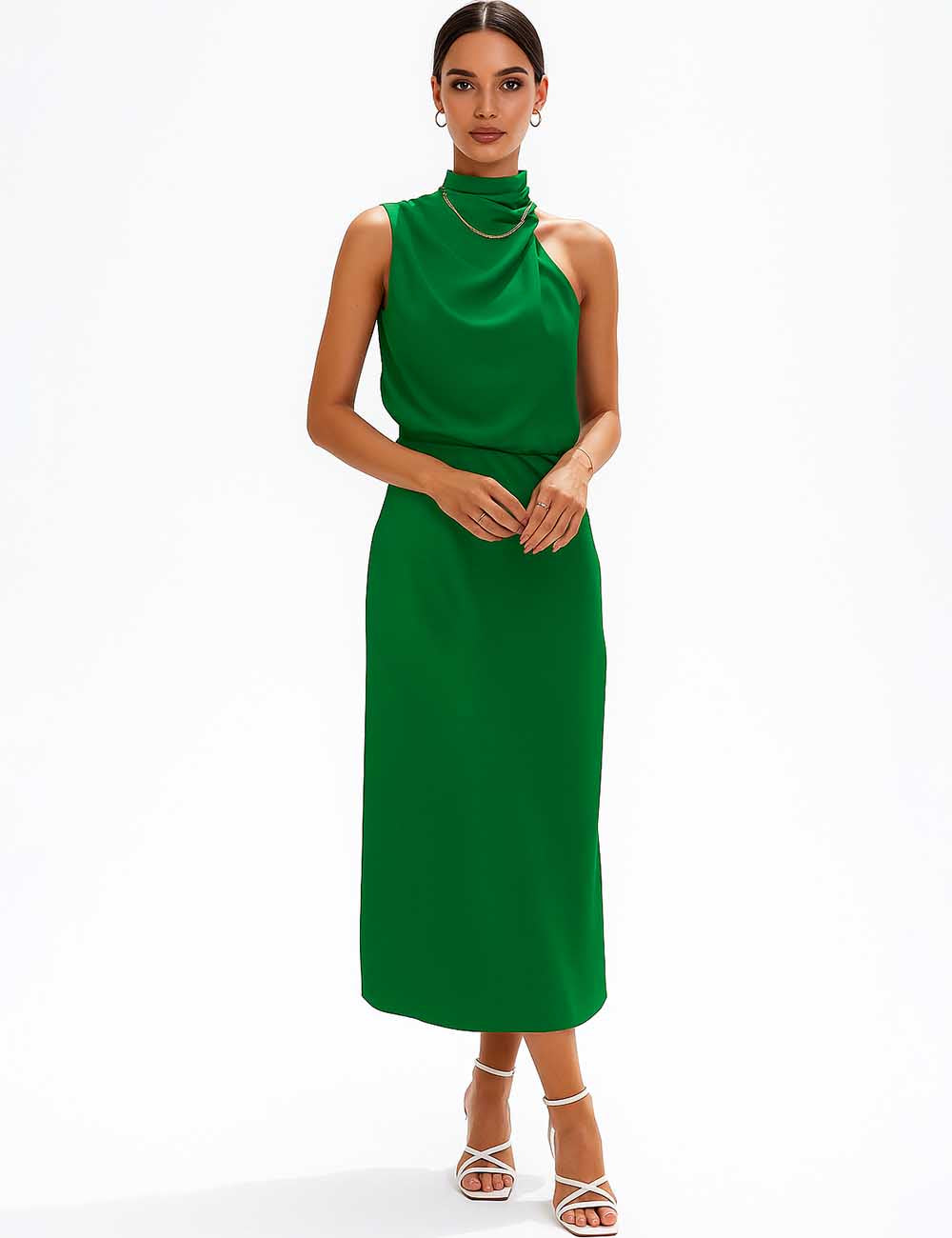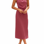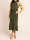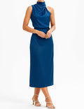Ladies Satin Mock Neck Sleeveless Ruched Maxi Dress