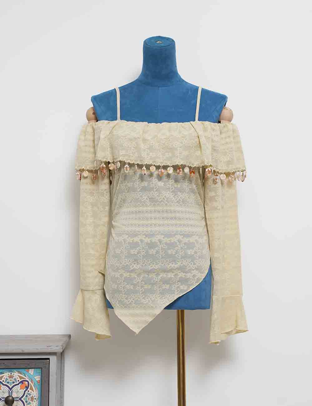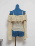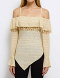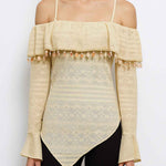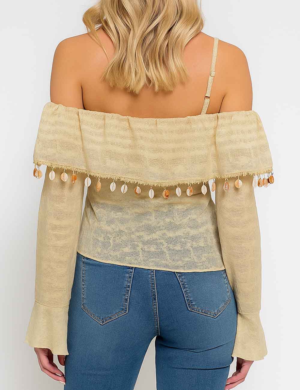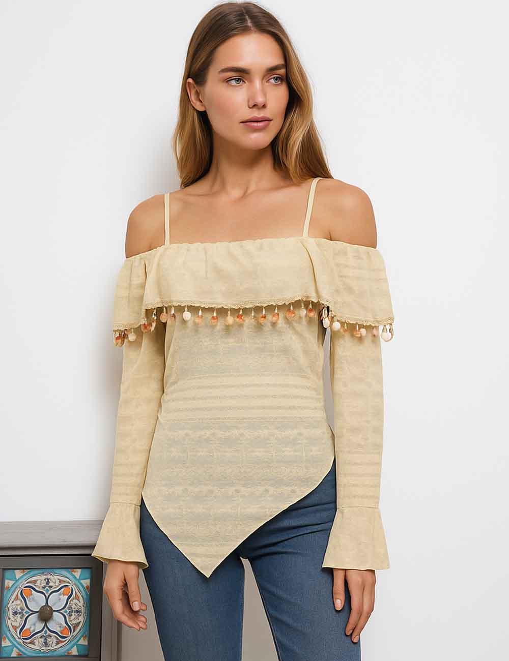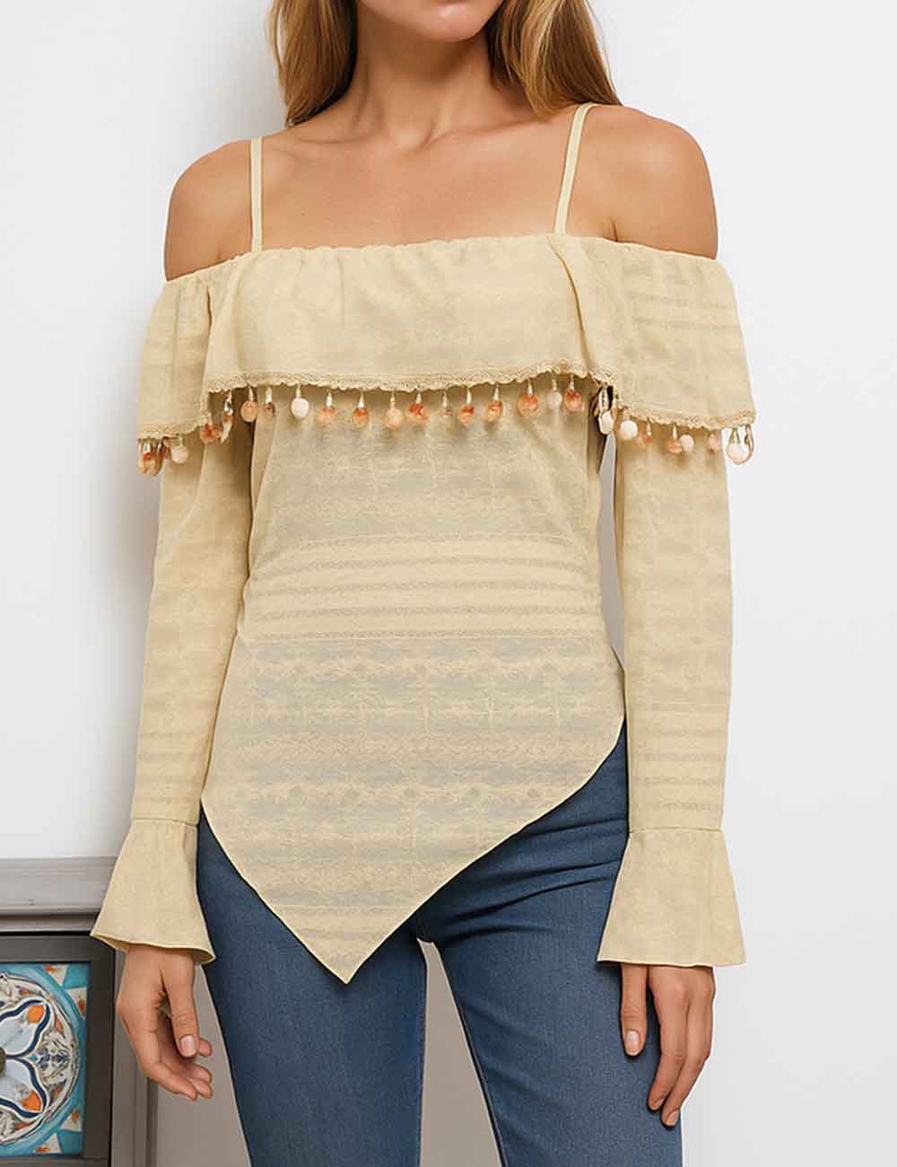 Ladies Seashell Ruffle Asymmetrical Off Shoulder Bell Sleeves Top