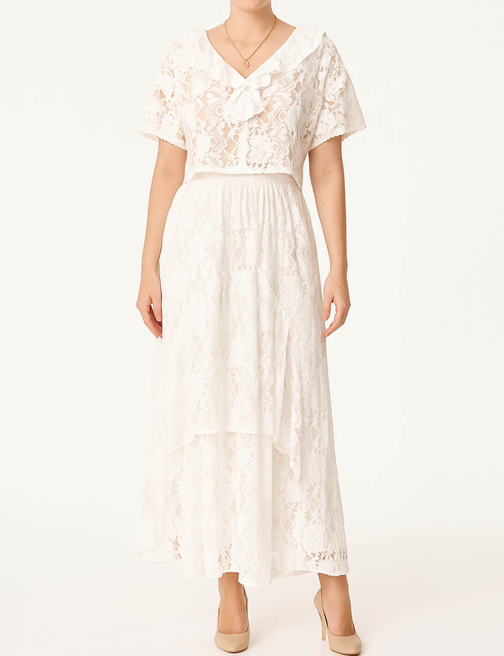 Ladies See Sheer Lace Ruffle V-Neck Top & Skirt Set