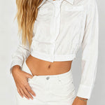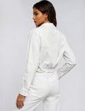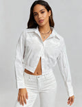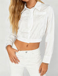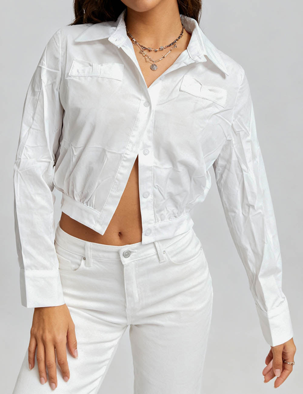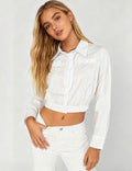 Ladies Solid Color Bow Tie Neck Button Down Crop Shirt