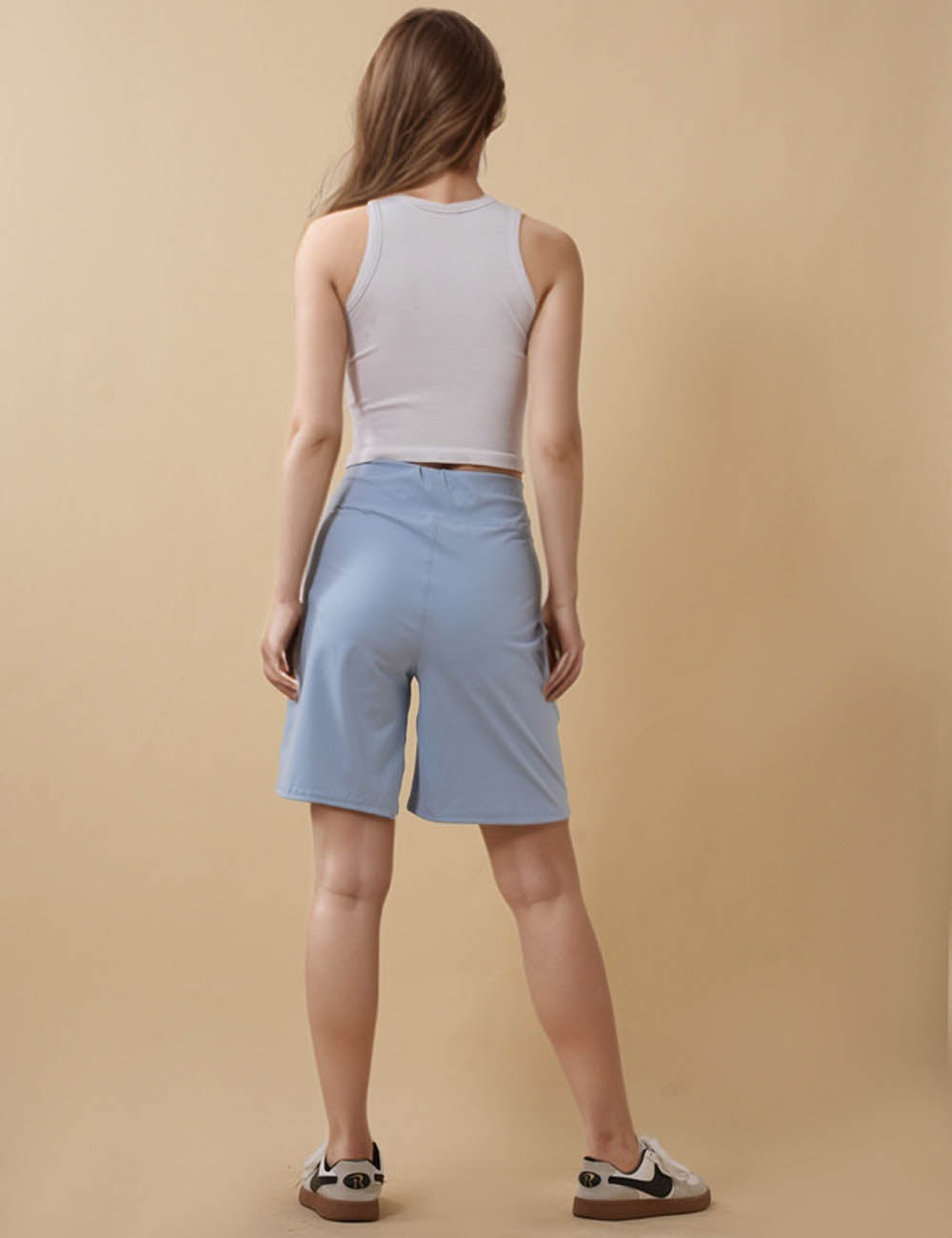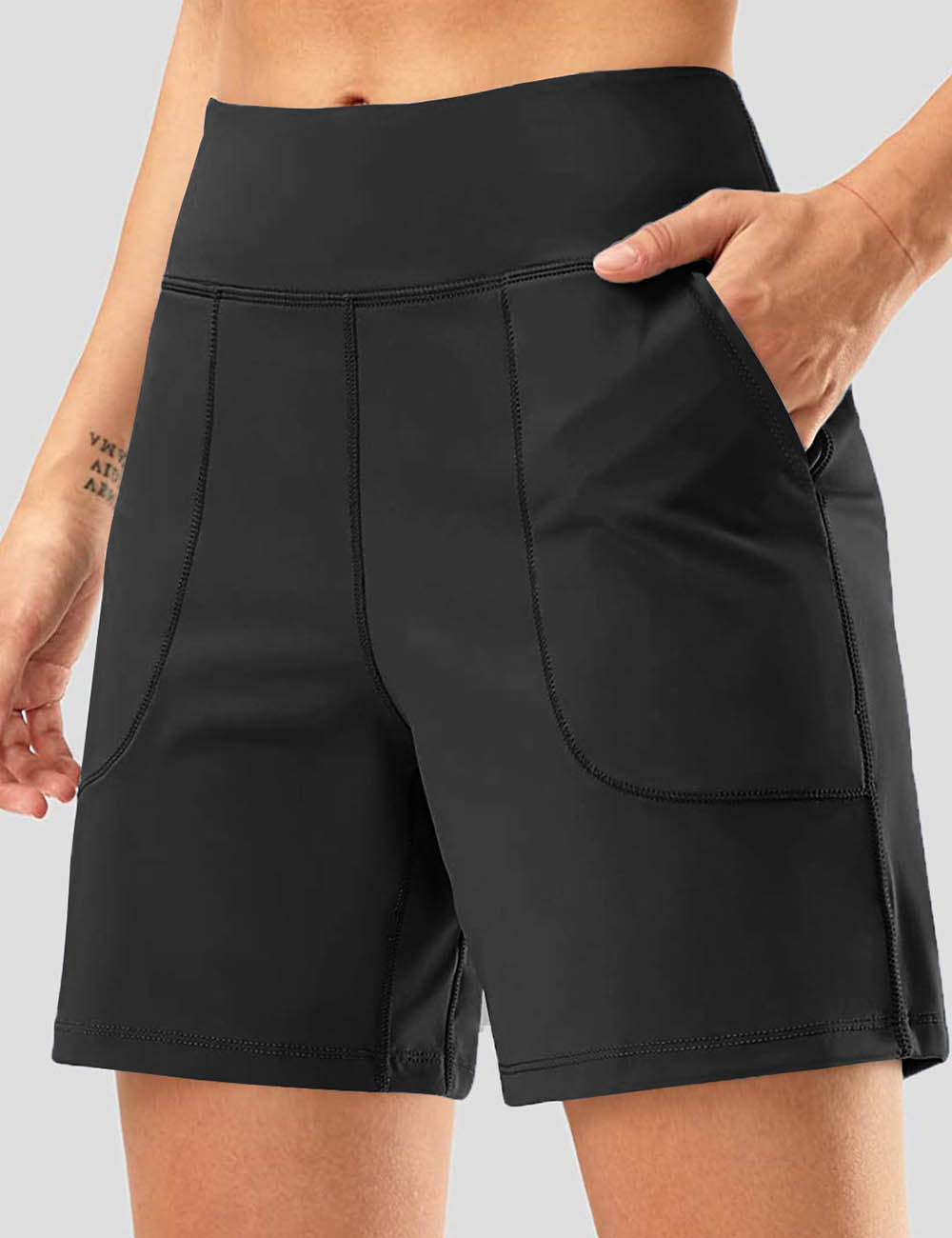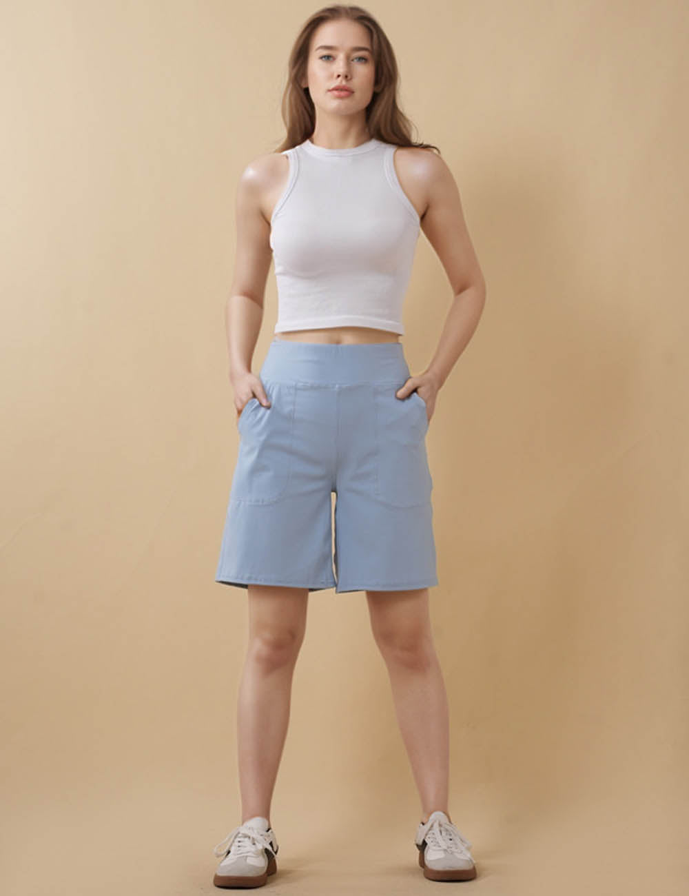 Ladies Solid Color Elastic Waist Pocket Sport Shorts