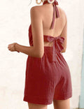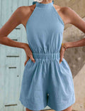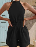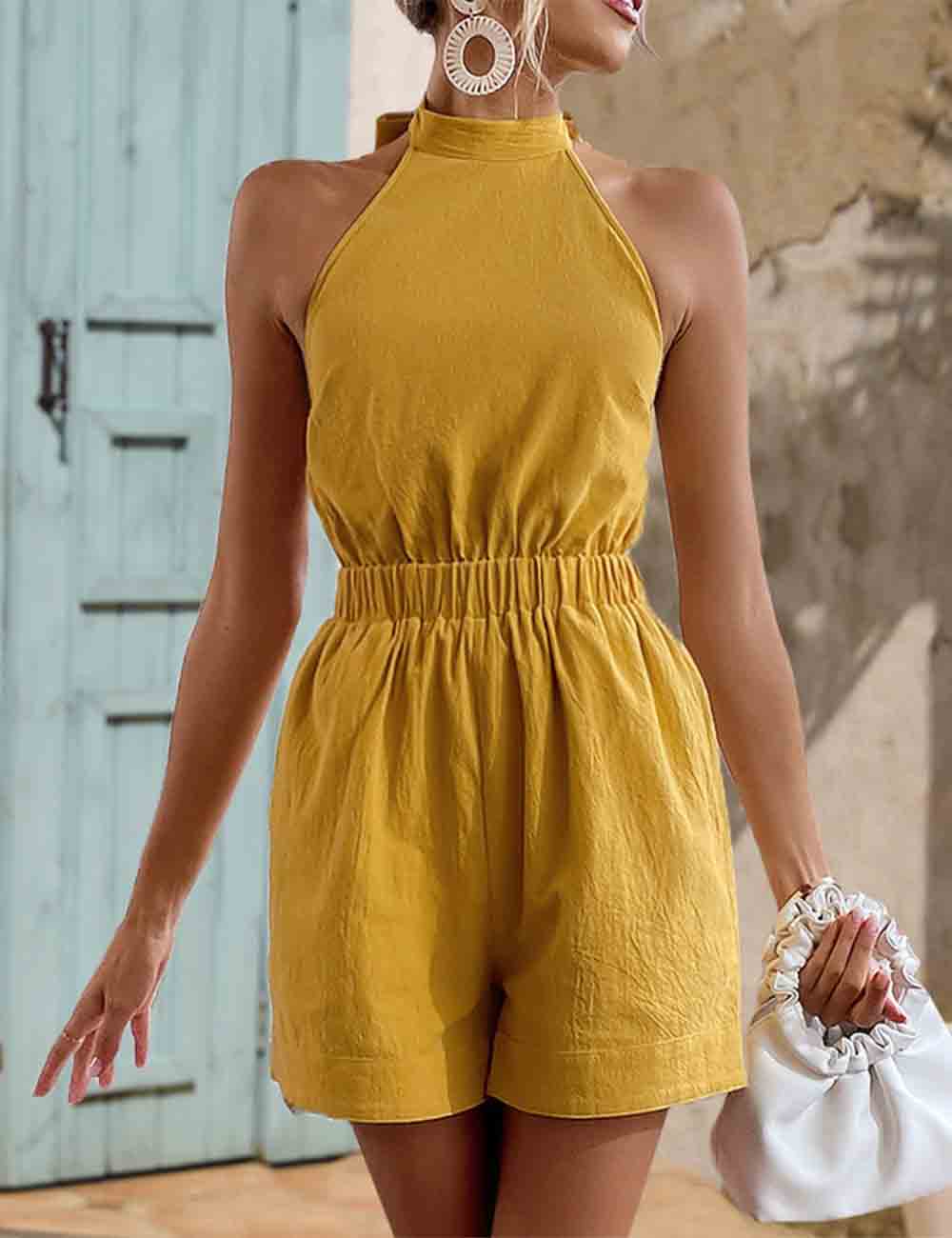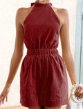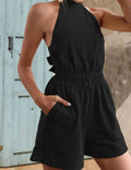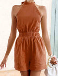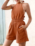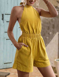 Ladies Solid Color Halter Backless Sleeveless Pocket Romper