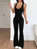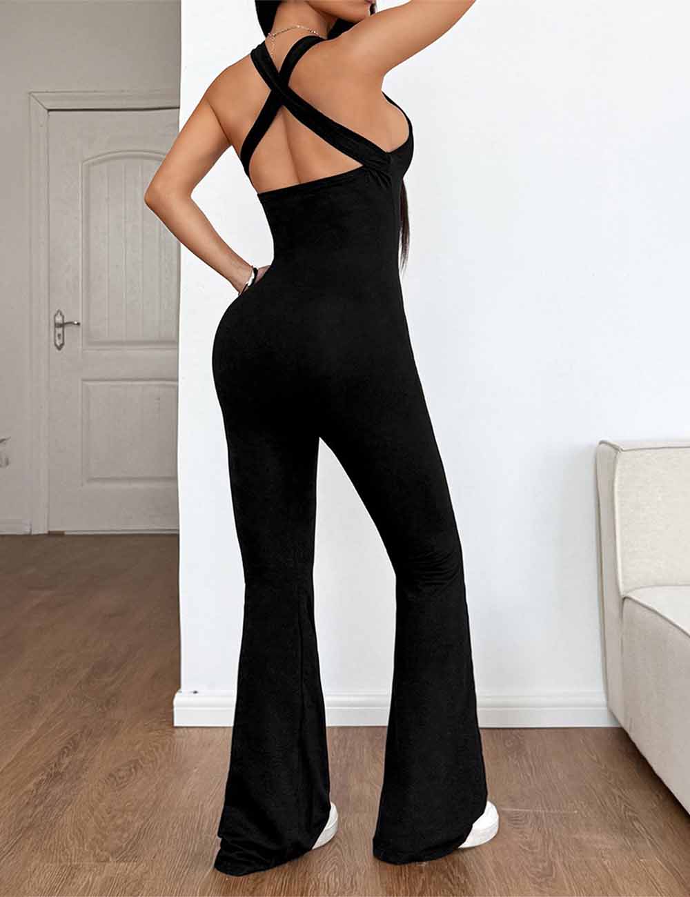 Ladies Solid Color Halter Strap Shoulder Sleeveless Flared Jumpsuit