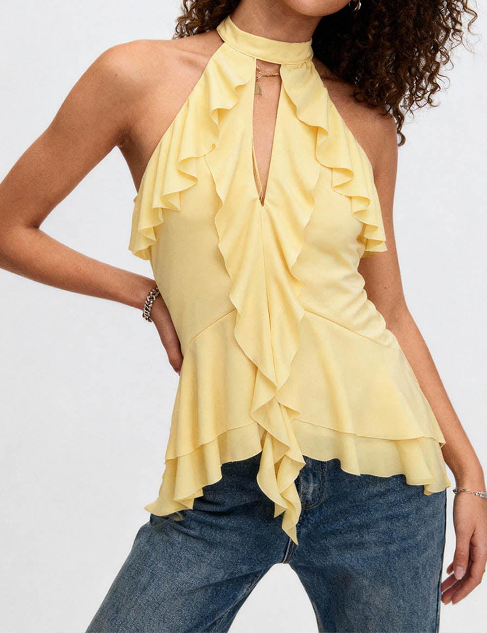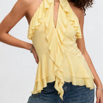 Ladies Solid Color Halter Tie Neck Ruffle Trim Sleeveless Top
