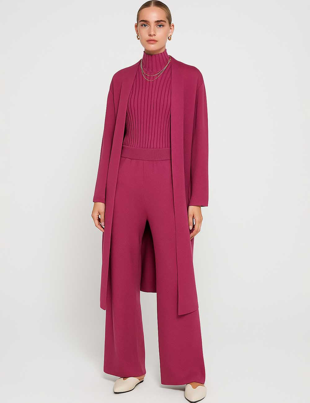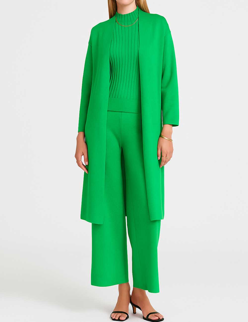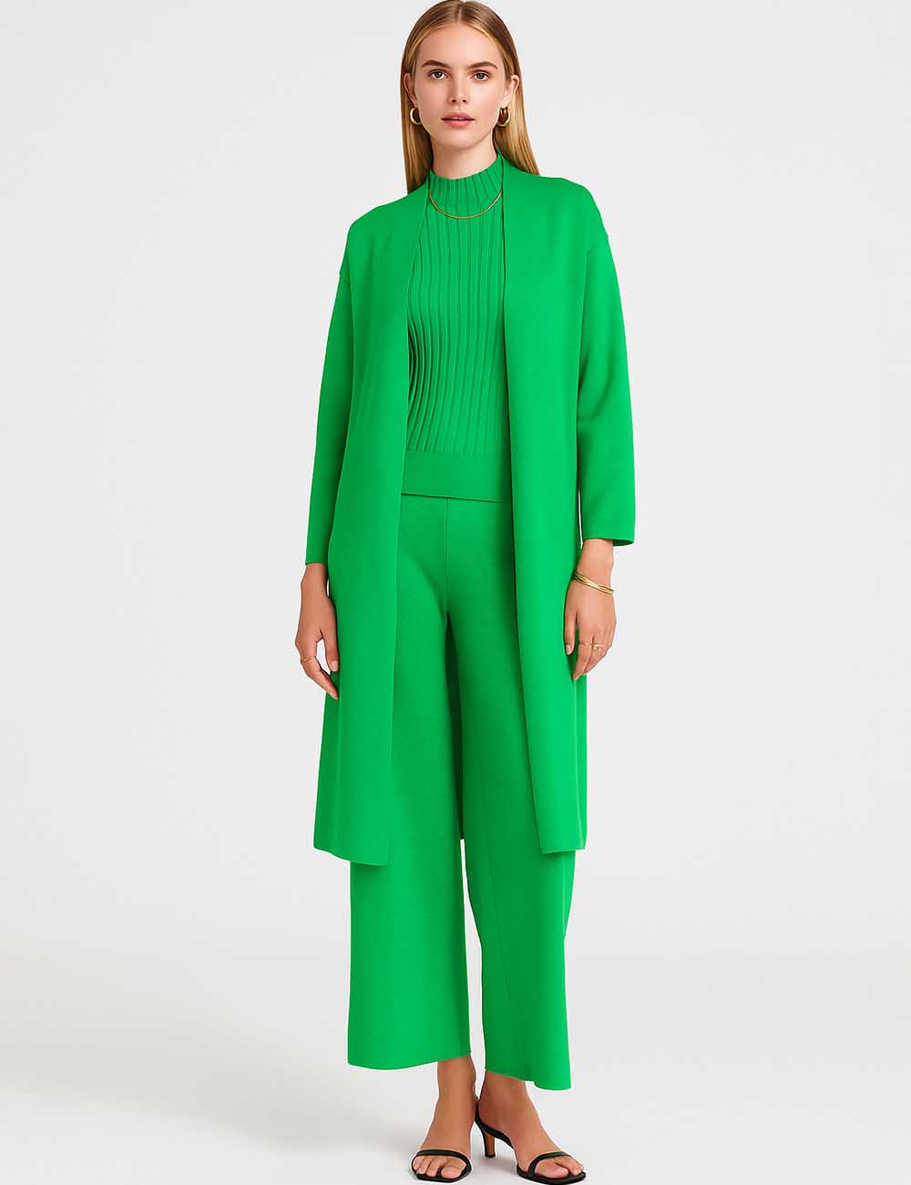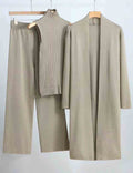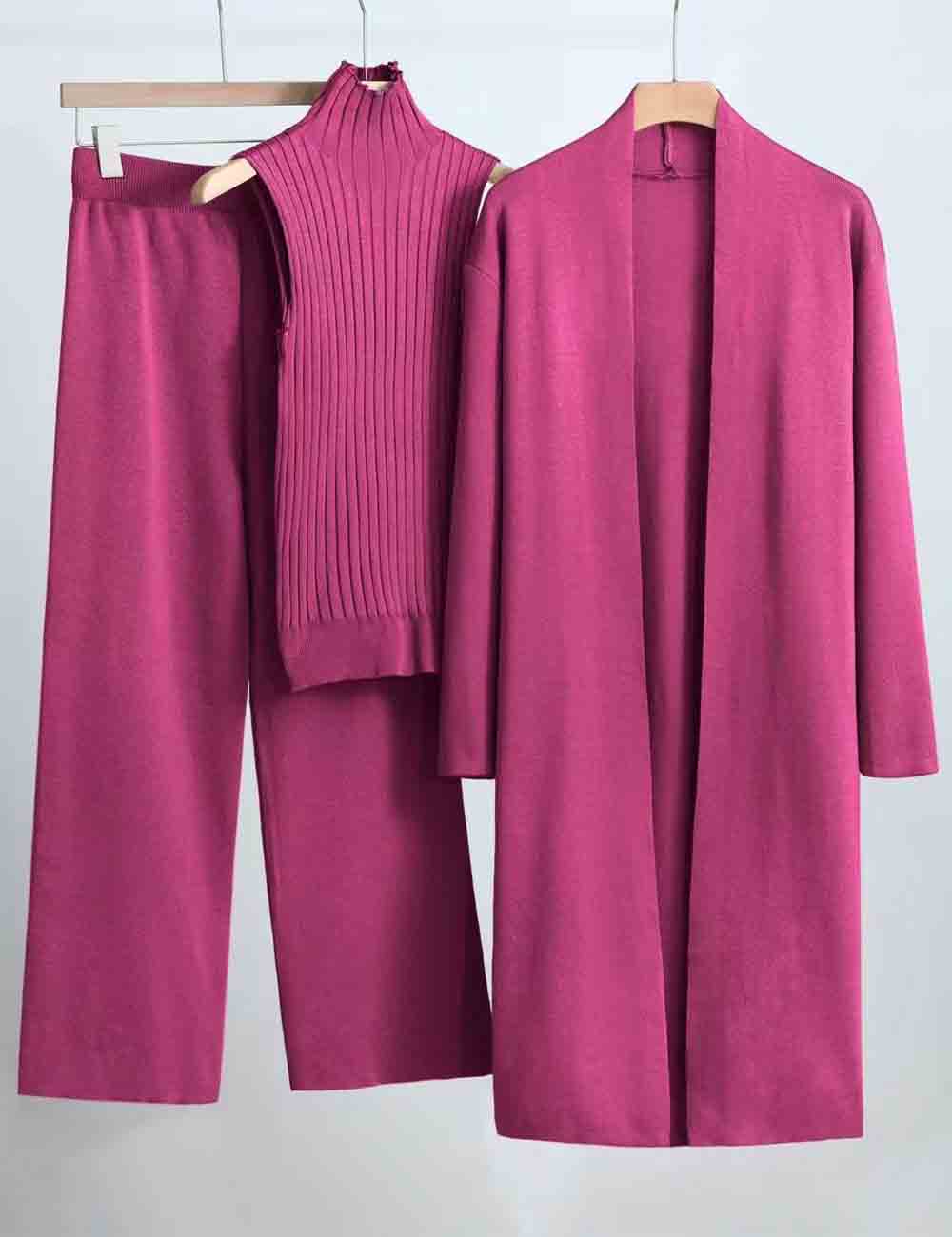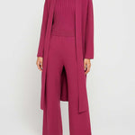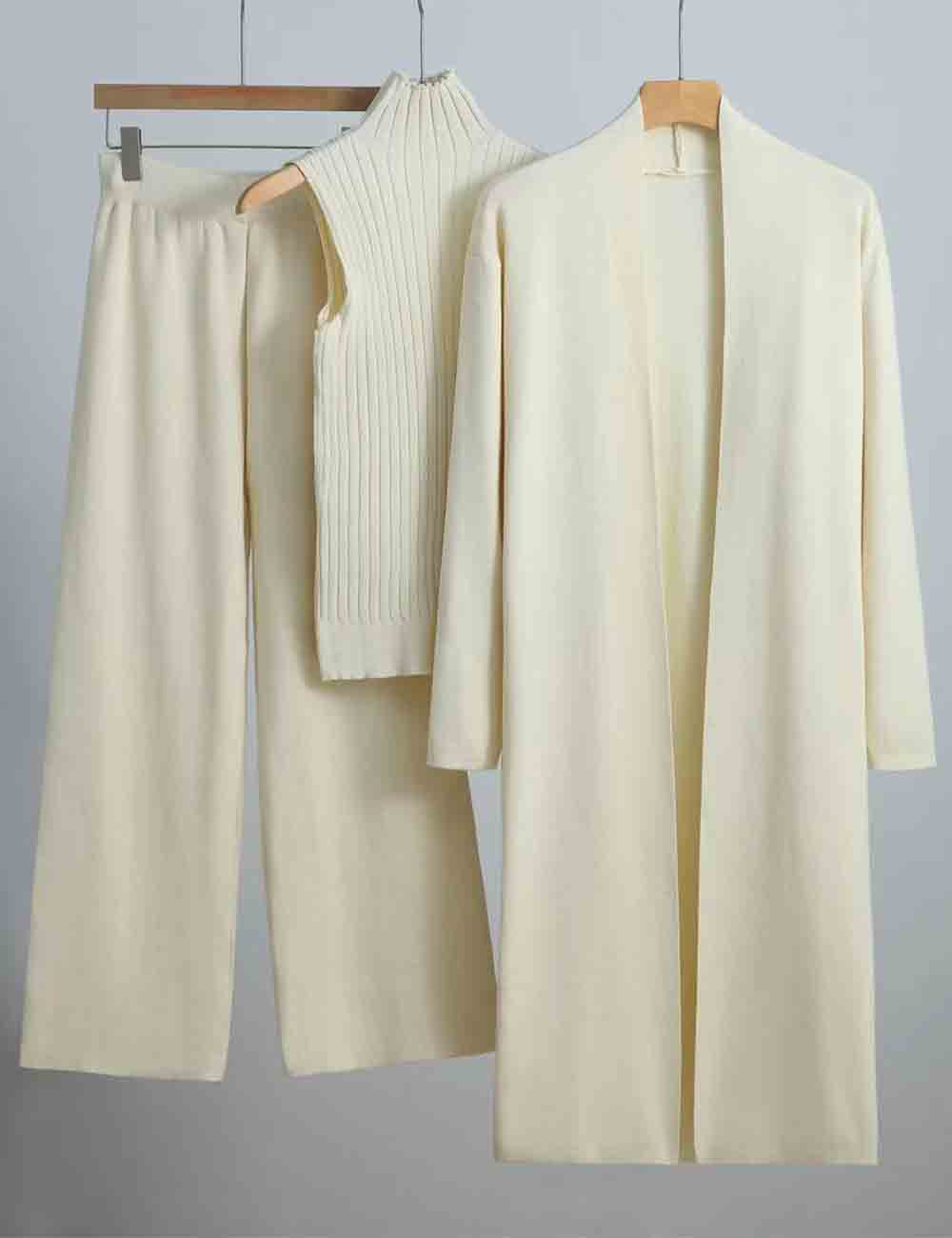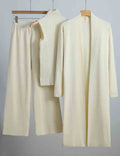 Ladies Solid Color Open Knit Cardigan & Pants 3PCS Set
