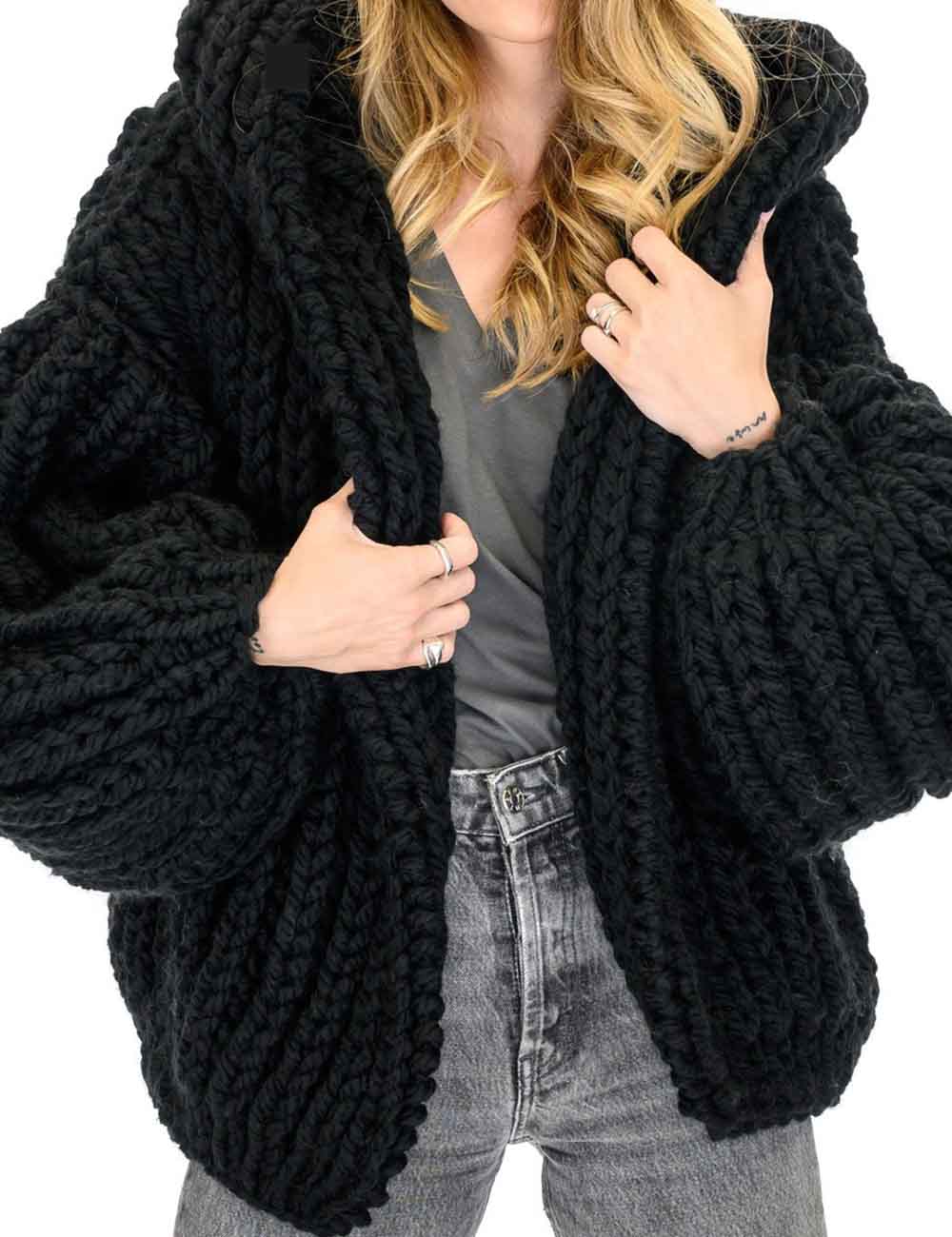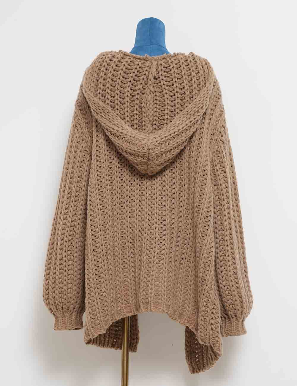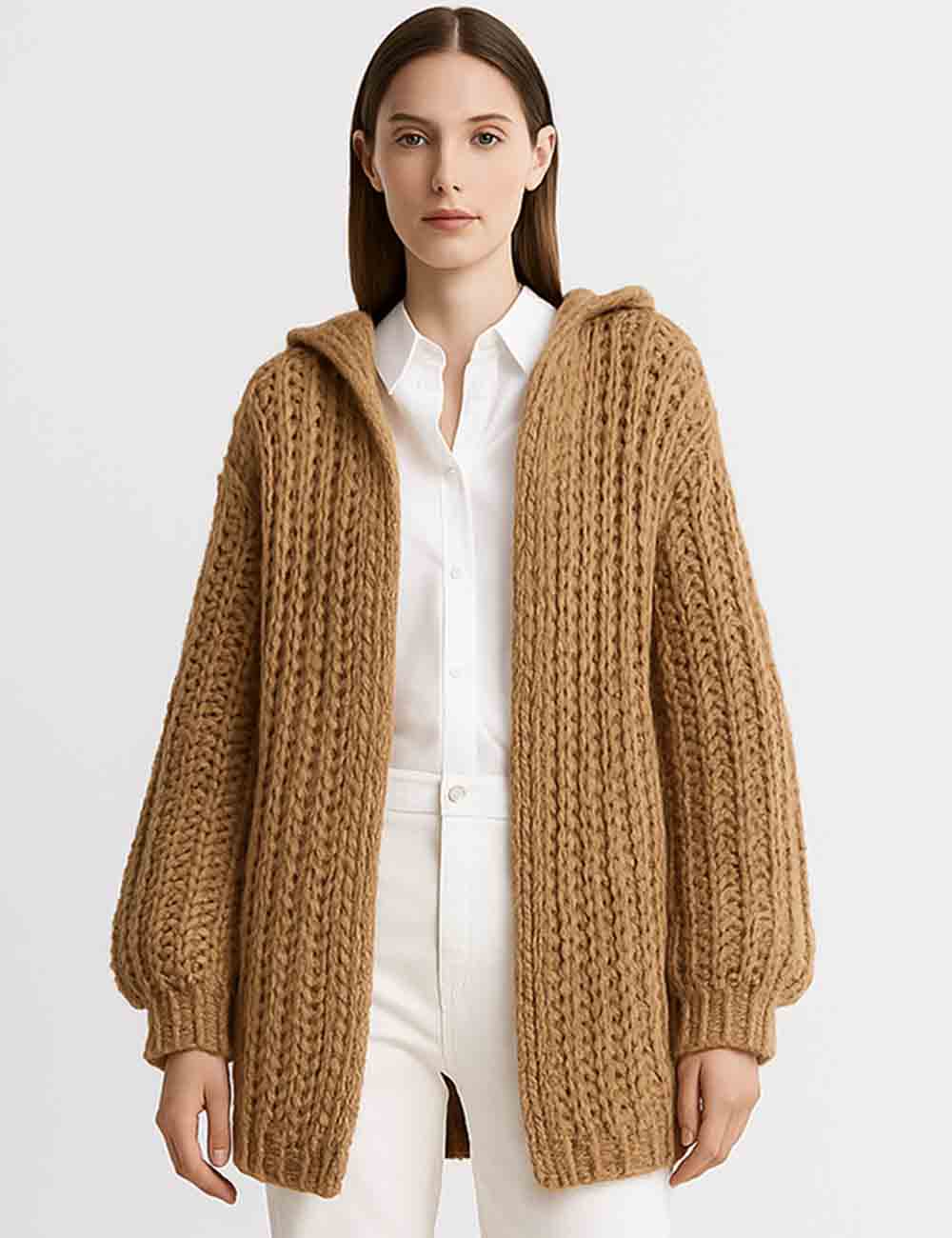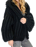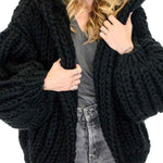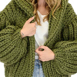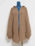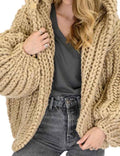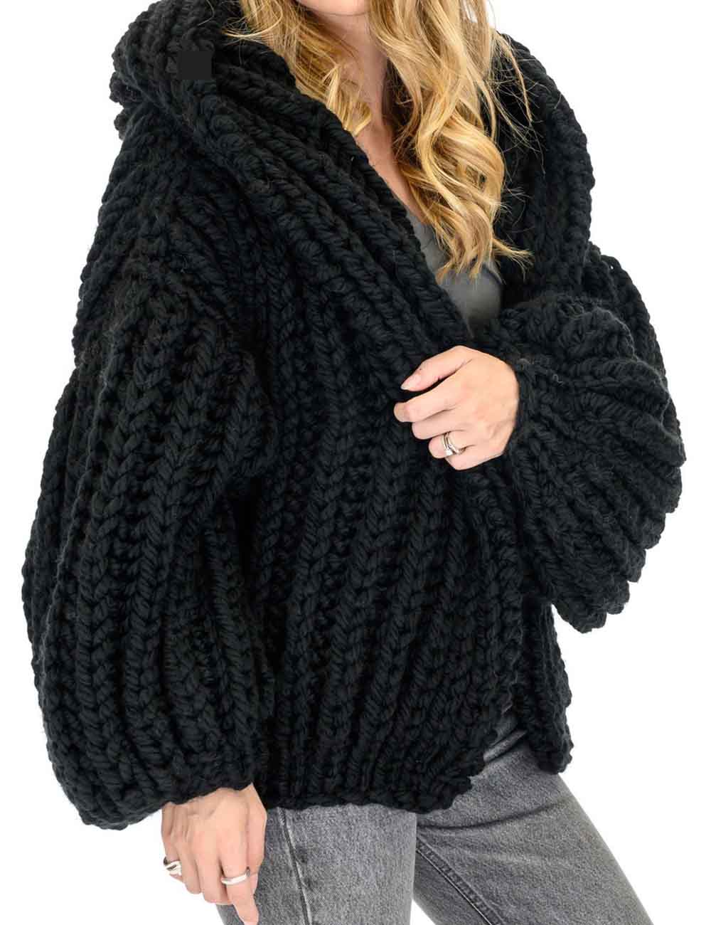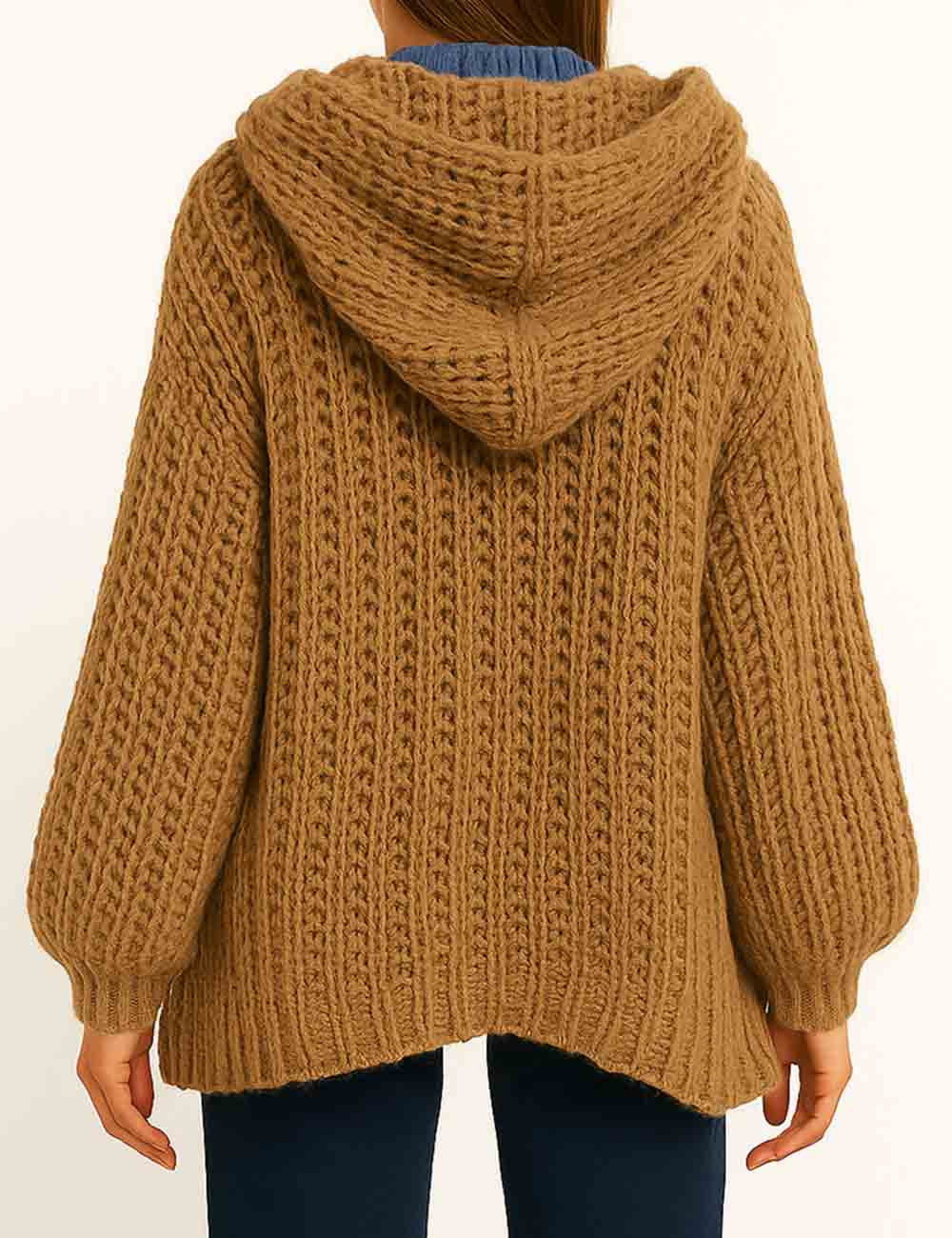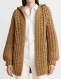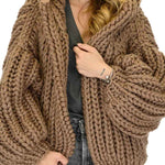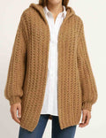 Ladies Solid Color Lantern Sleeves Cable Hooded Chunky Knit Cardigan