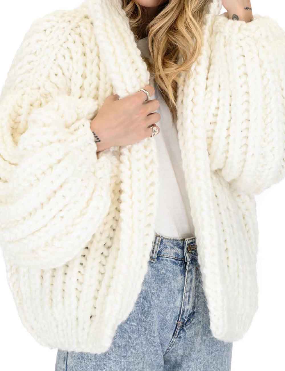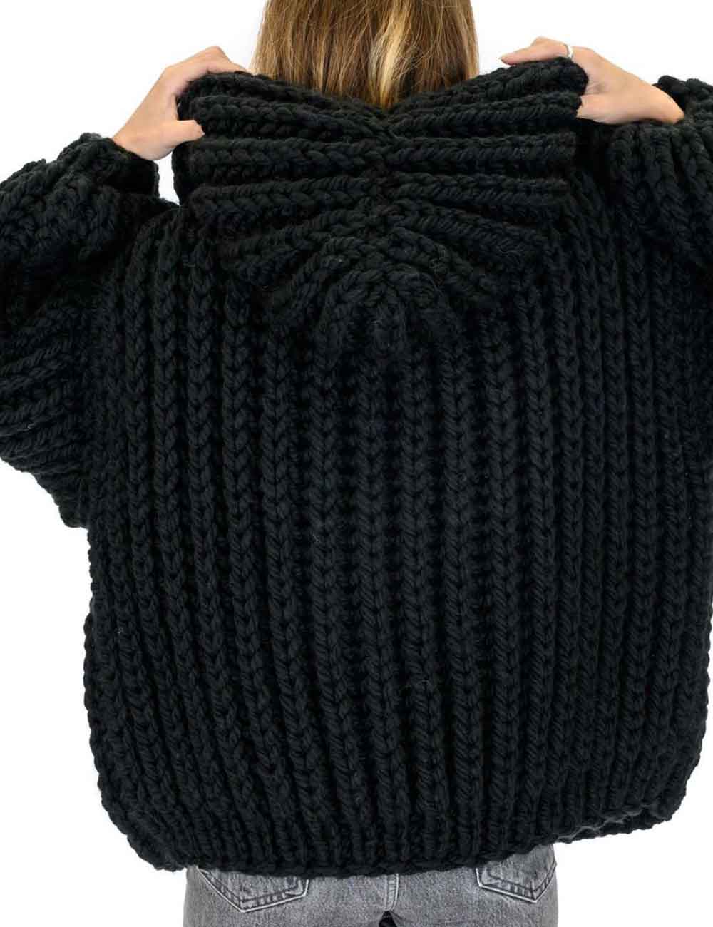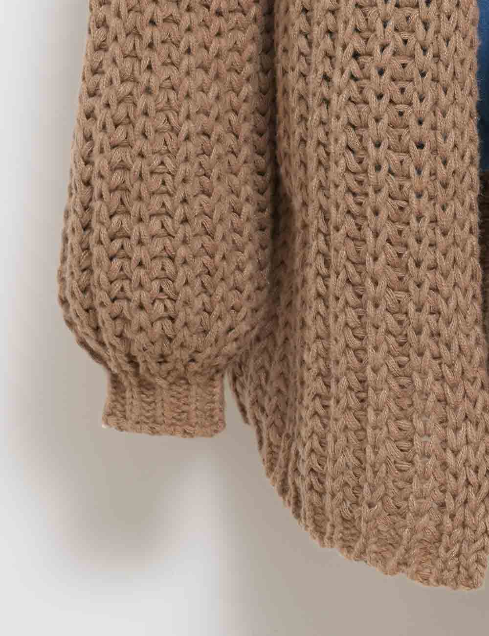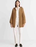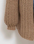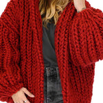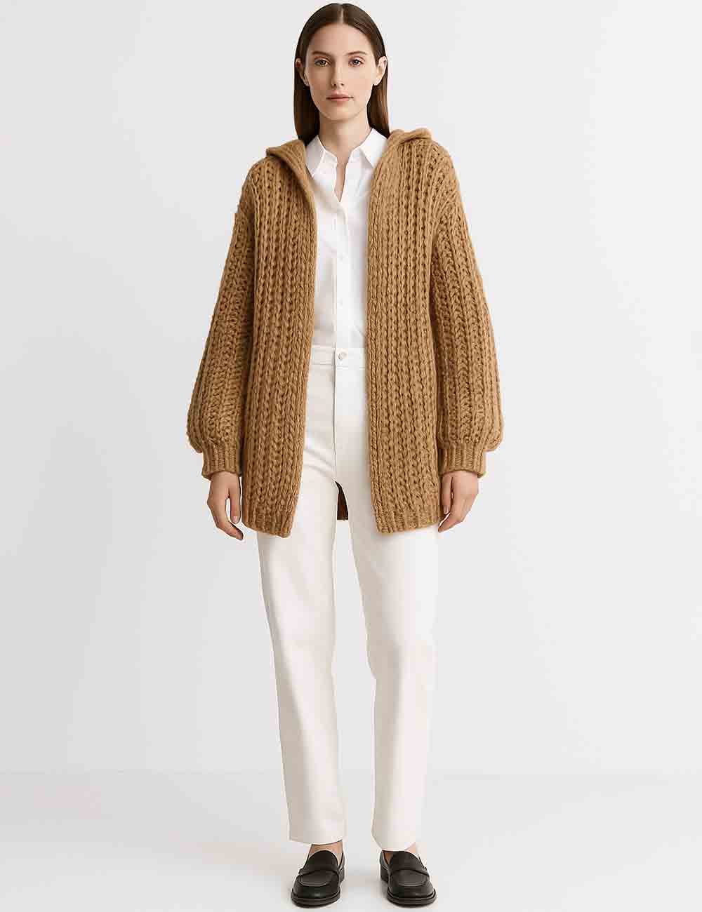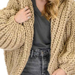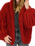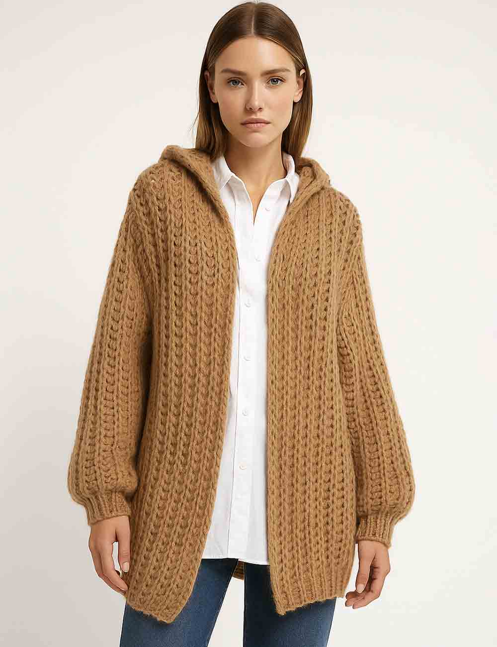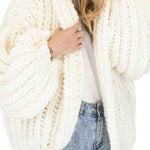 Ladies Solid Color Lantern Sleeves Cable Hooded Chunky Knit Cardigan
