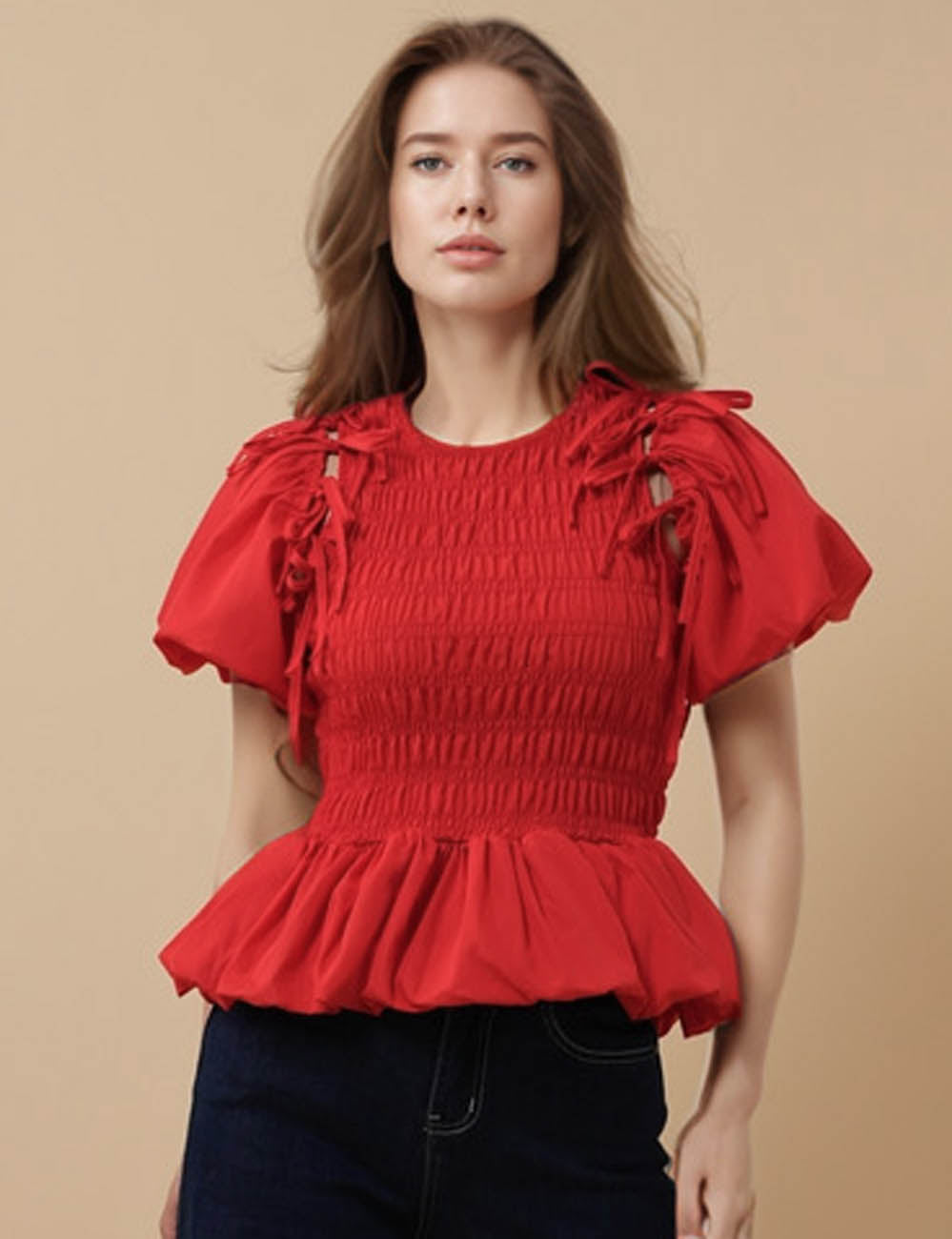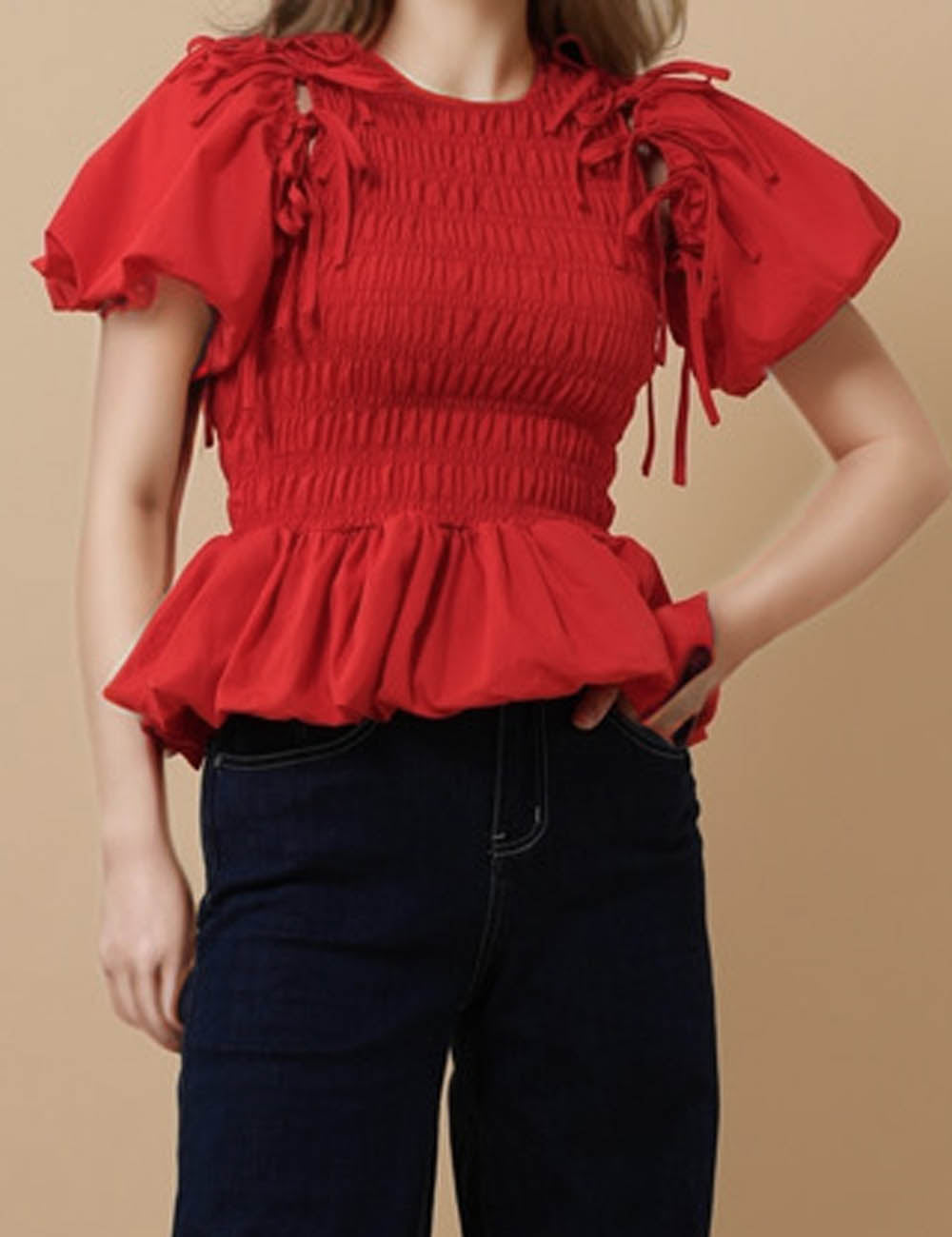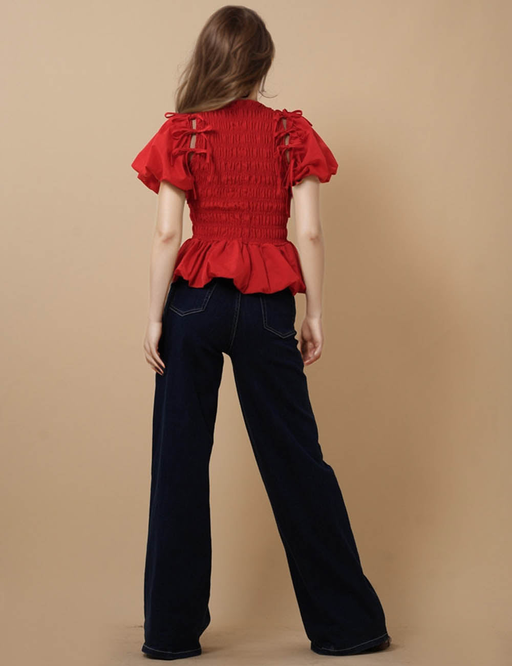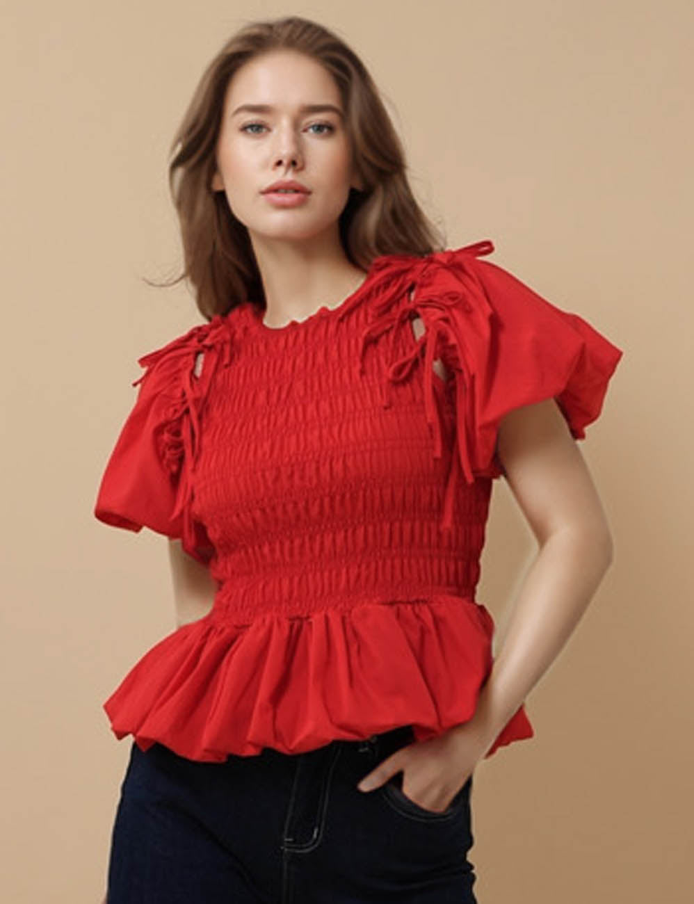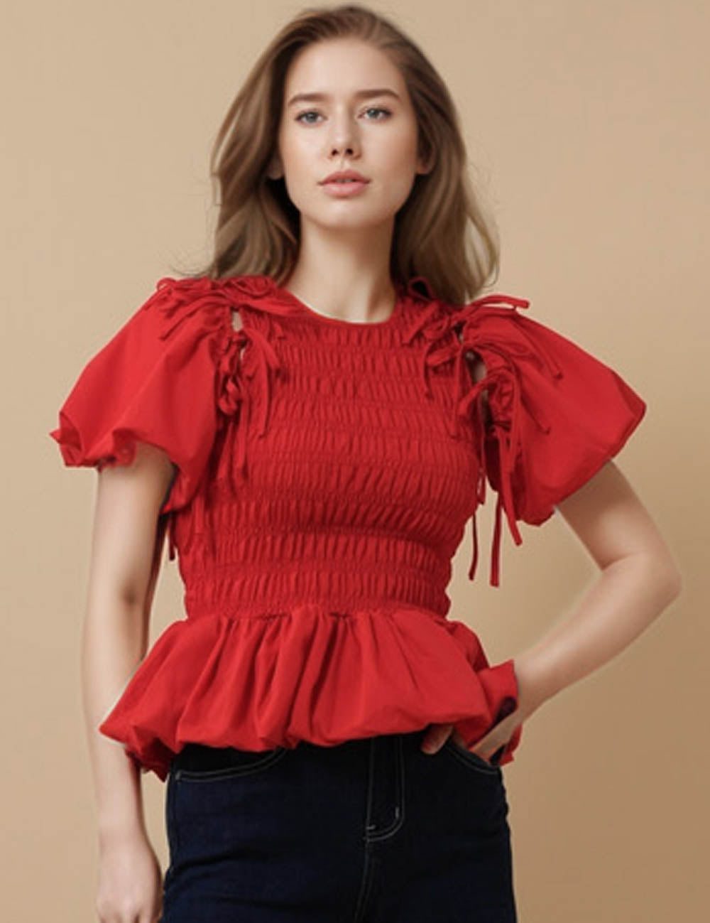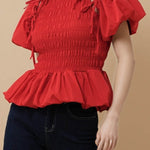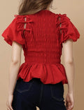 Ladies Solid Color Ruffle Short Puff Sleeves Blouse 8SKT51330