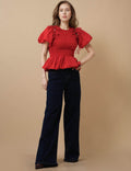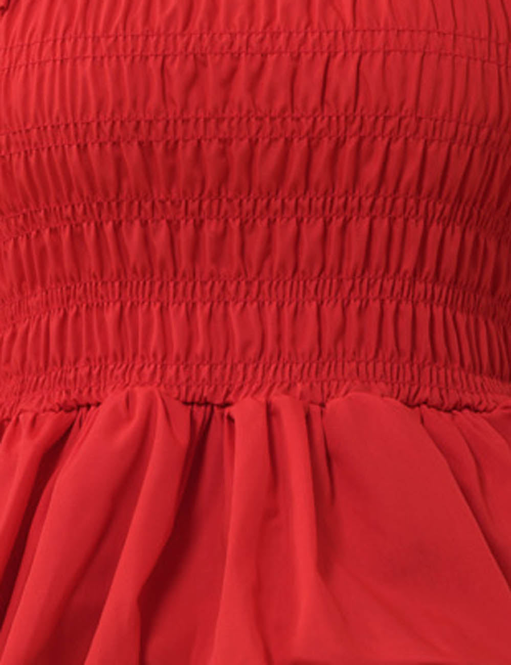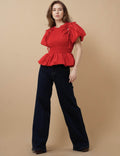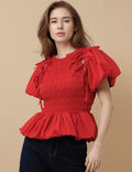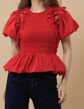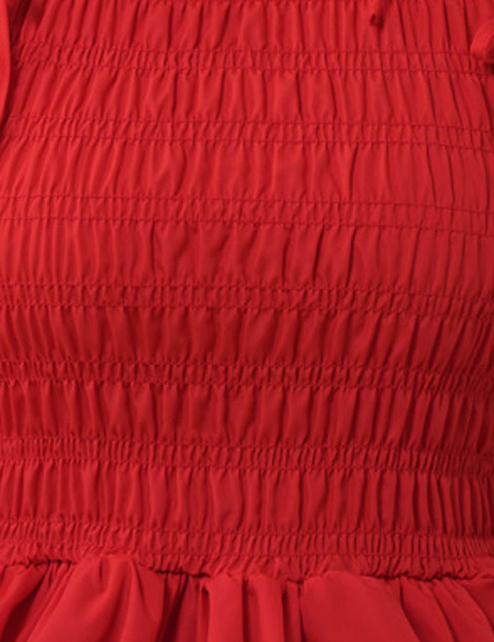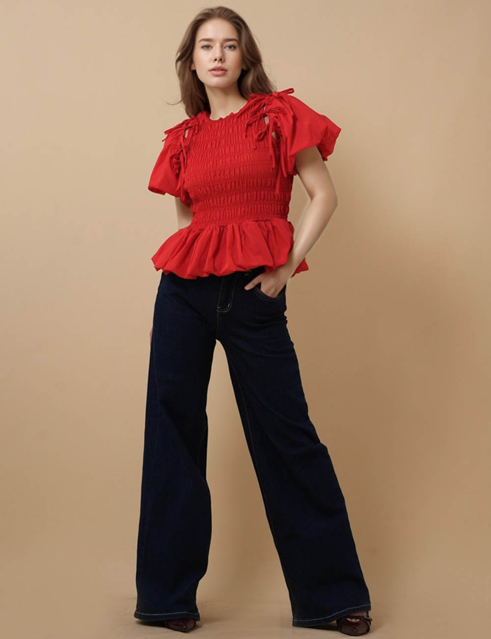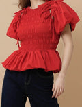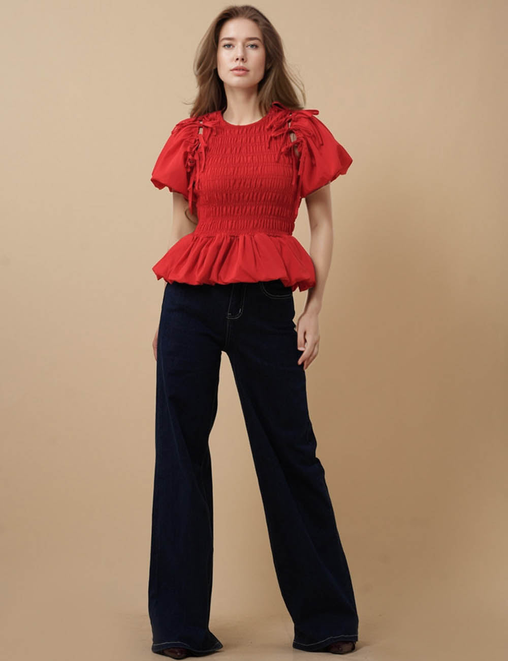Ladies Solid Color Ruffle Short Puff Sleeves Blouse 8SKT51330