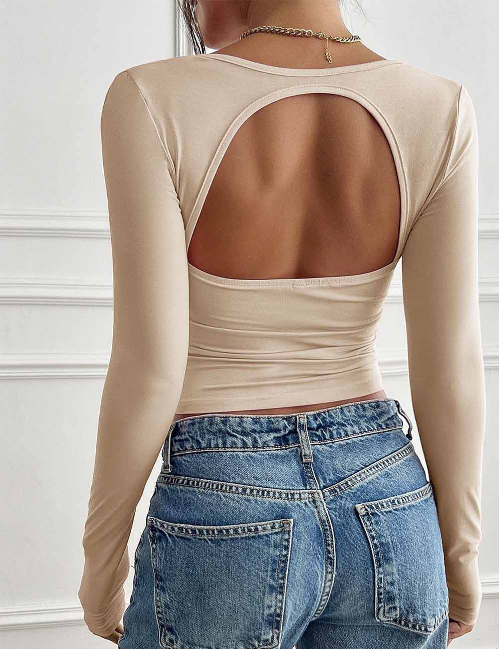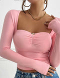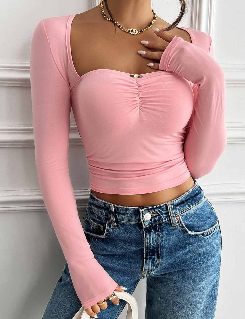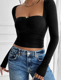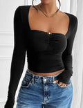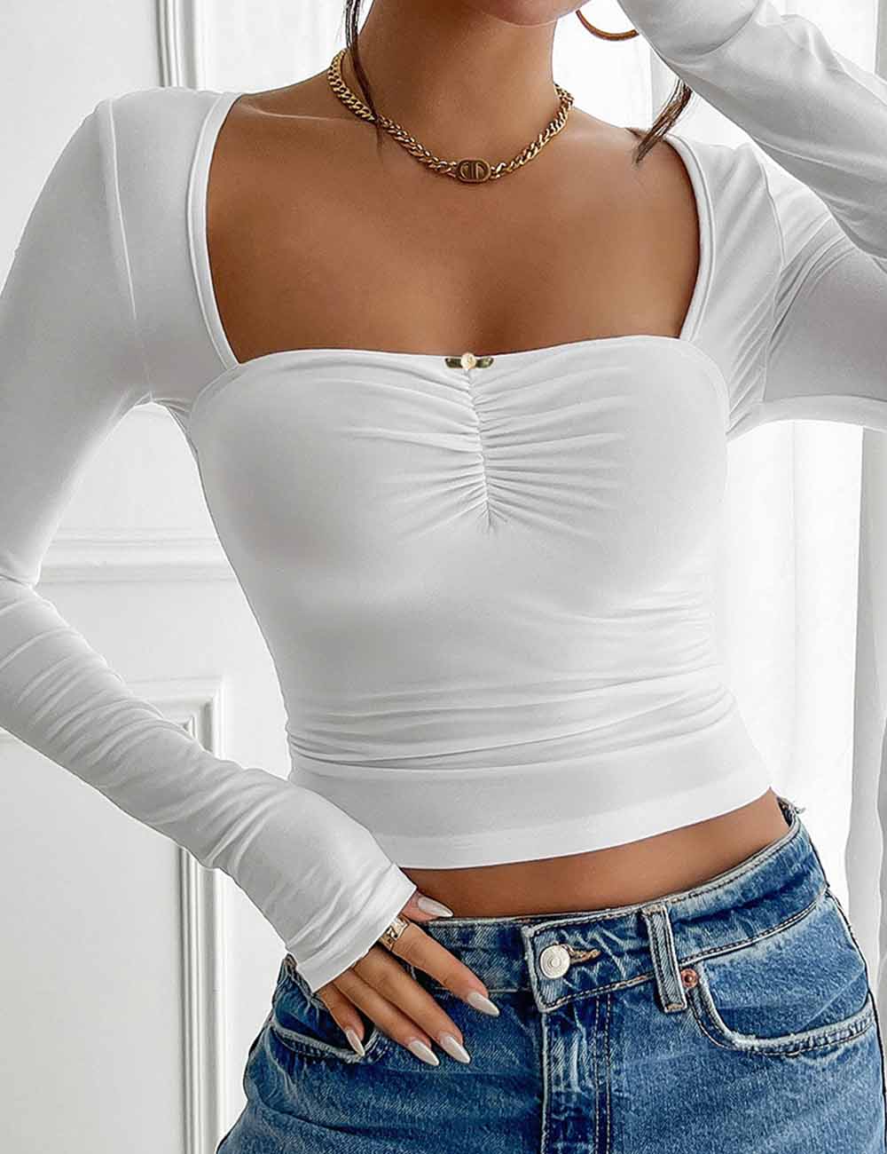 Ladies Solid Color Square Neck Long Sleeves Cropped LayeringTop