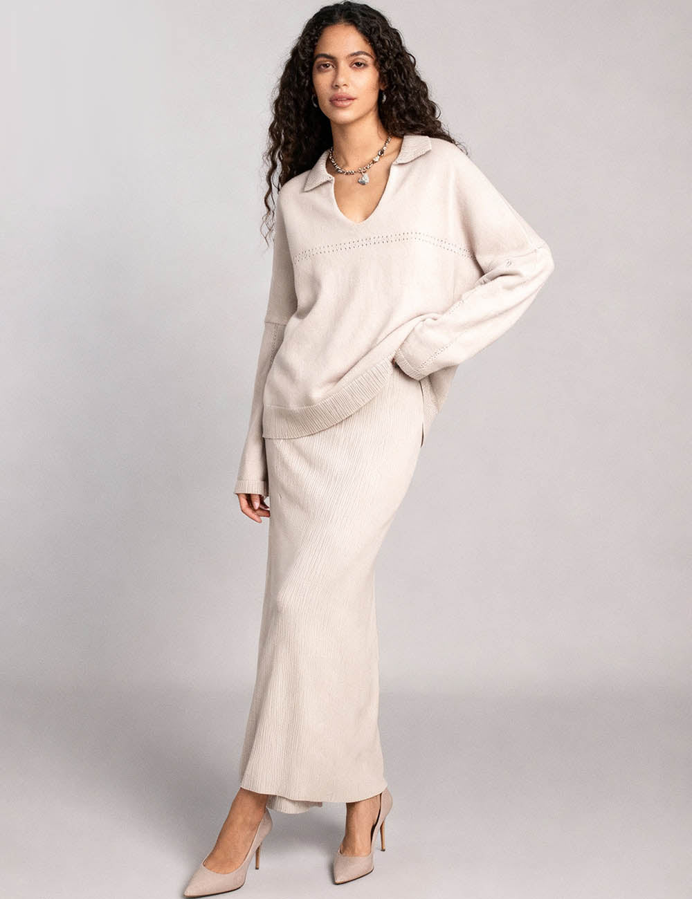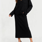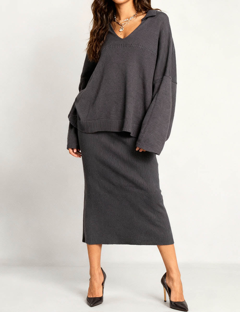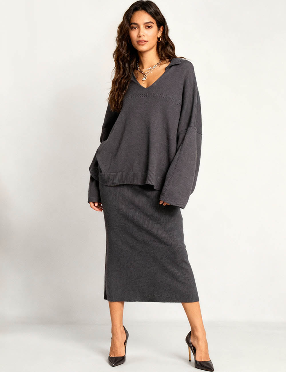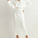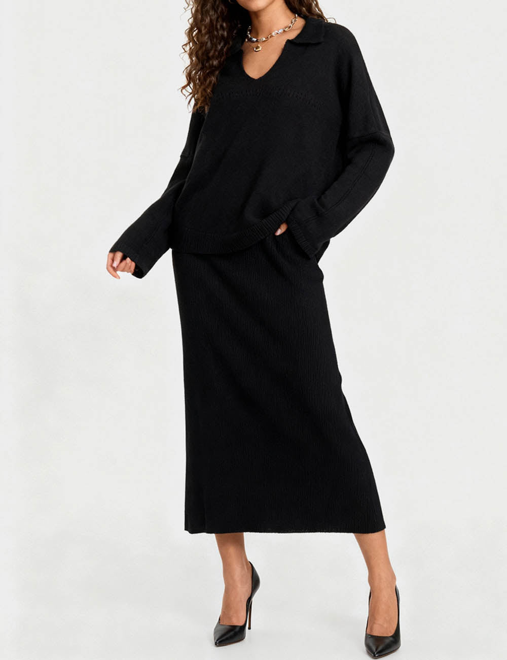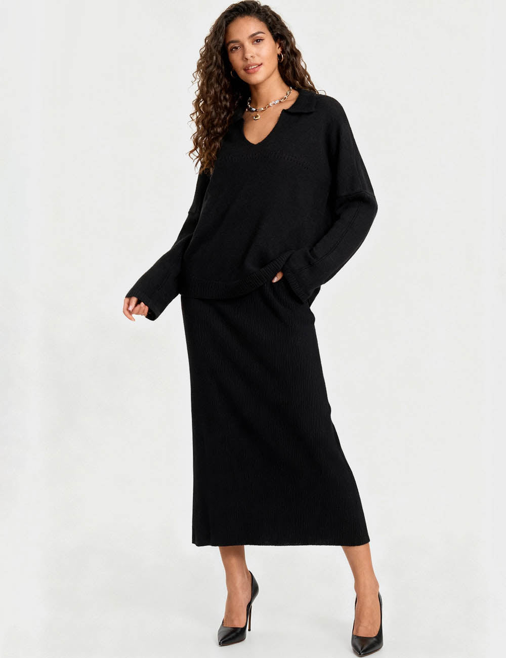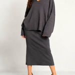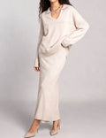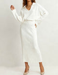 Ladies Solid Color V-Neck Knit Top & Midi Skirt 2PCS Set