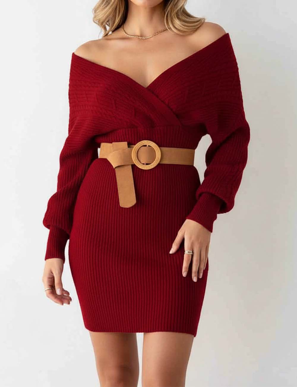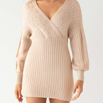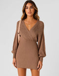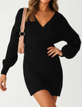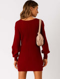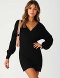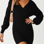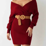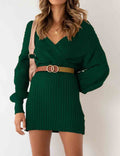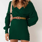 Ladies Solid Color V-Neck Long Sleeves Belt Sweater Dress