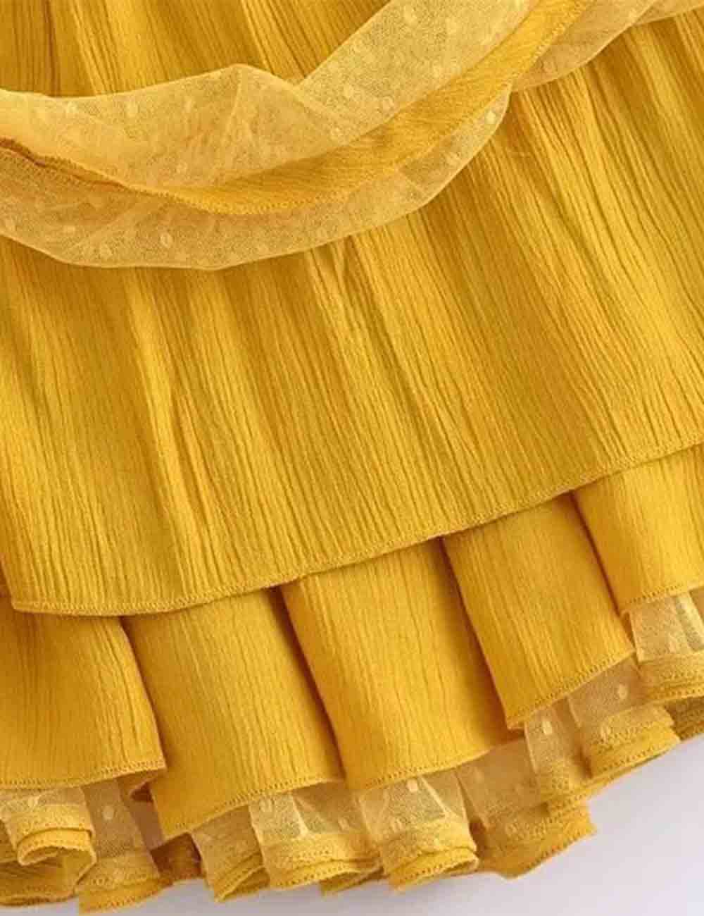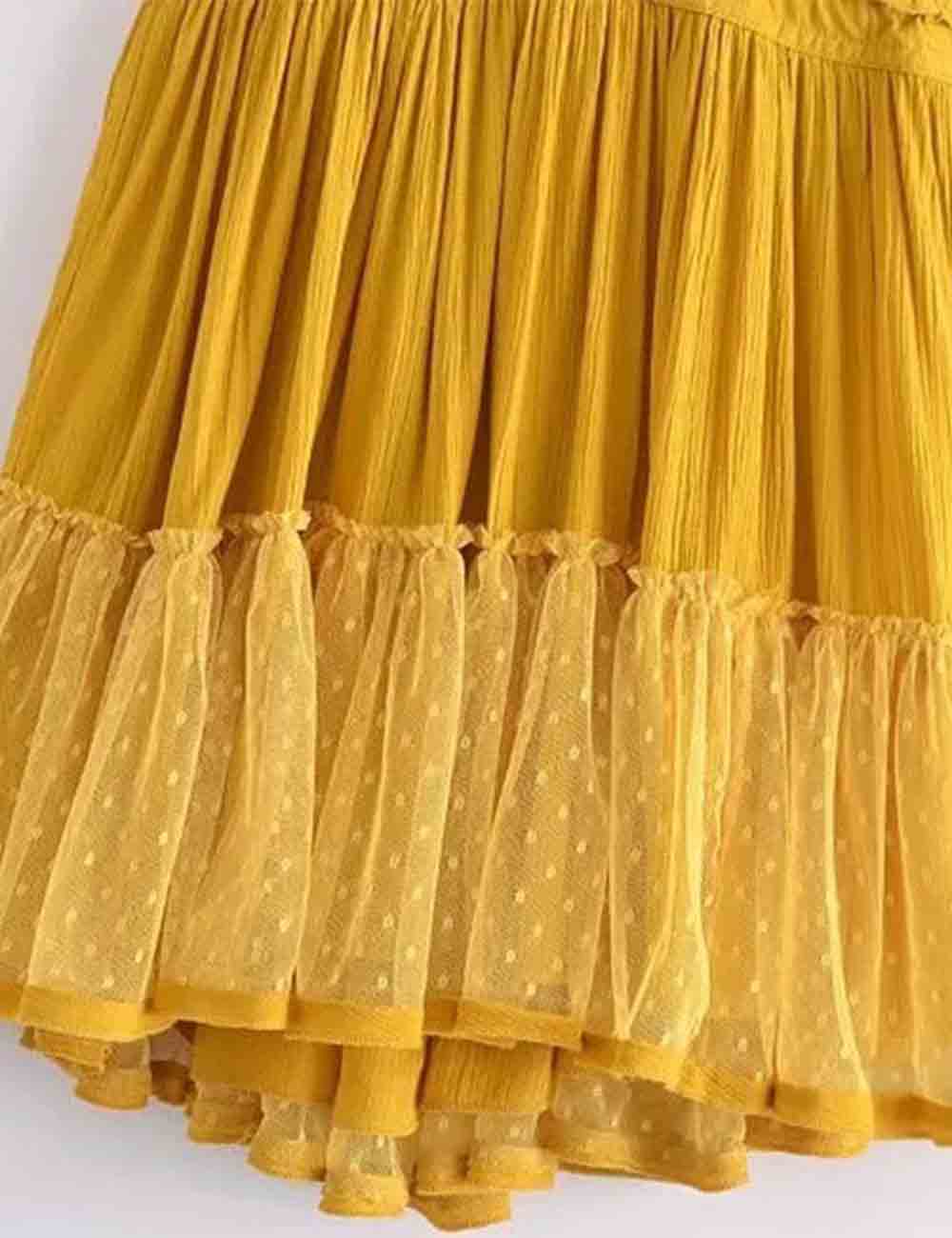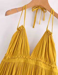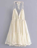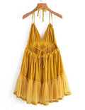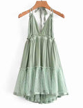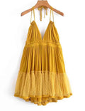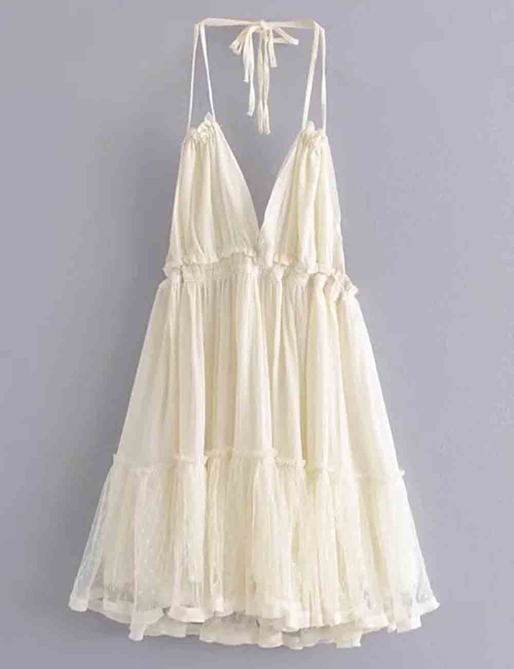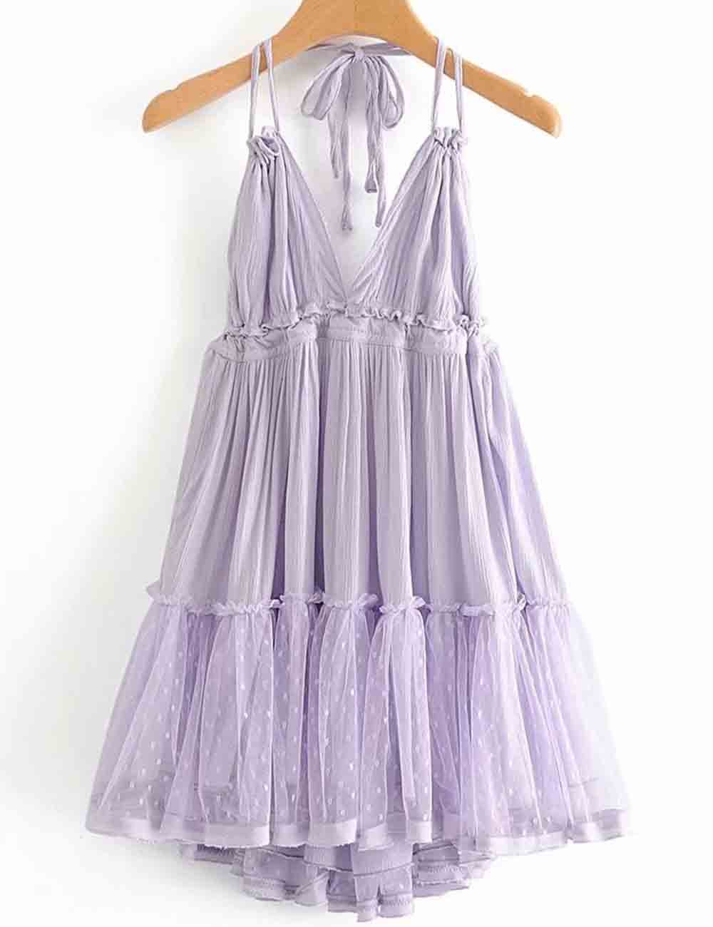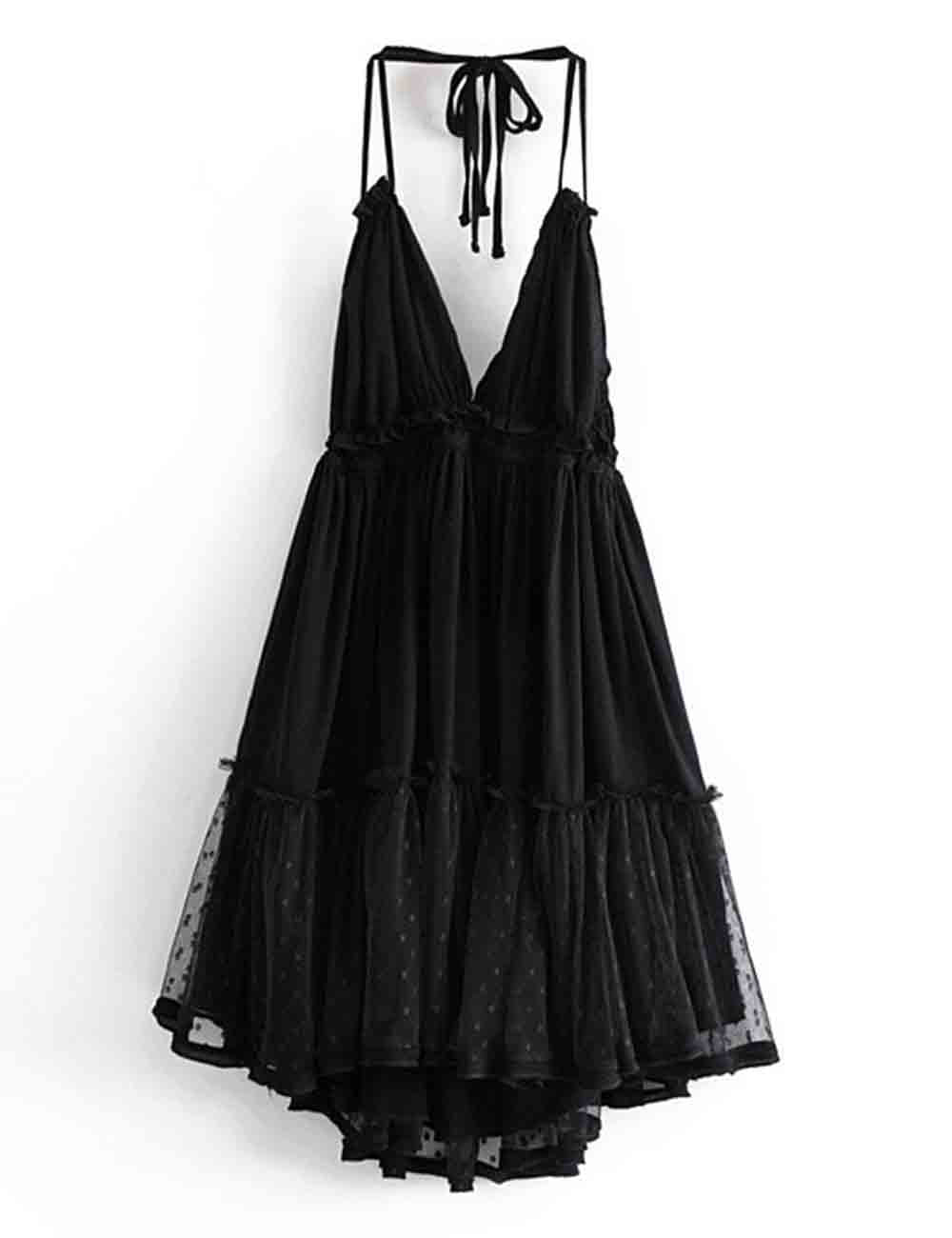 Ladies Solid Color V-Neck Mesh Dot Halter String Shoulder Mini Dress