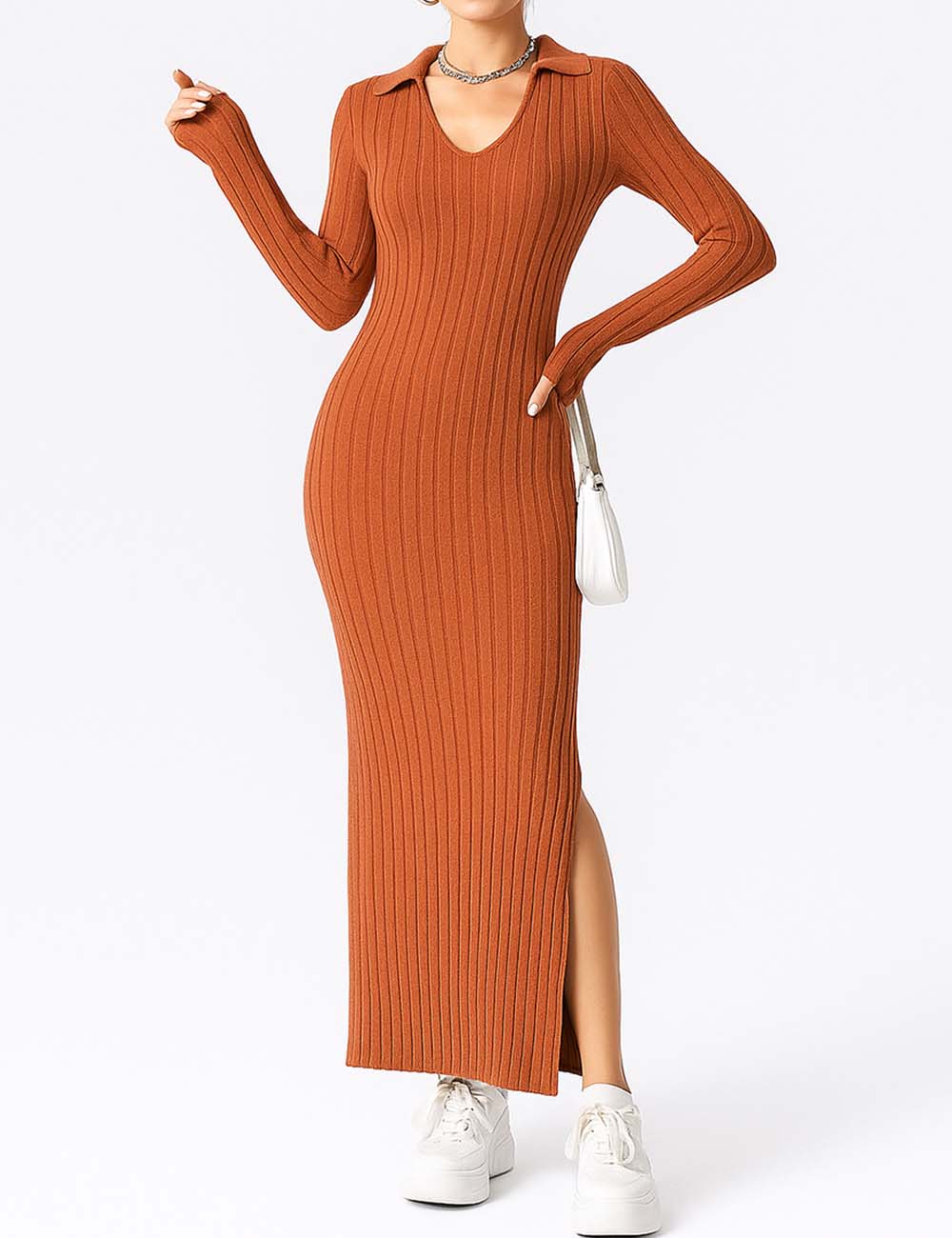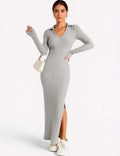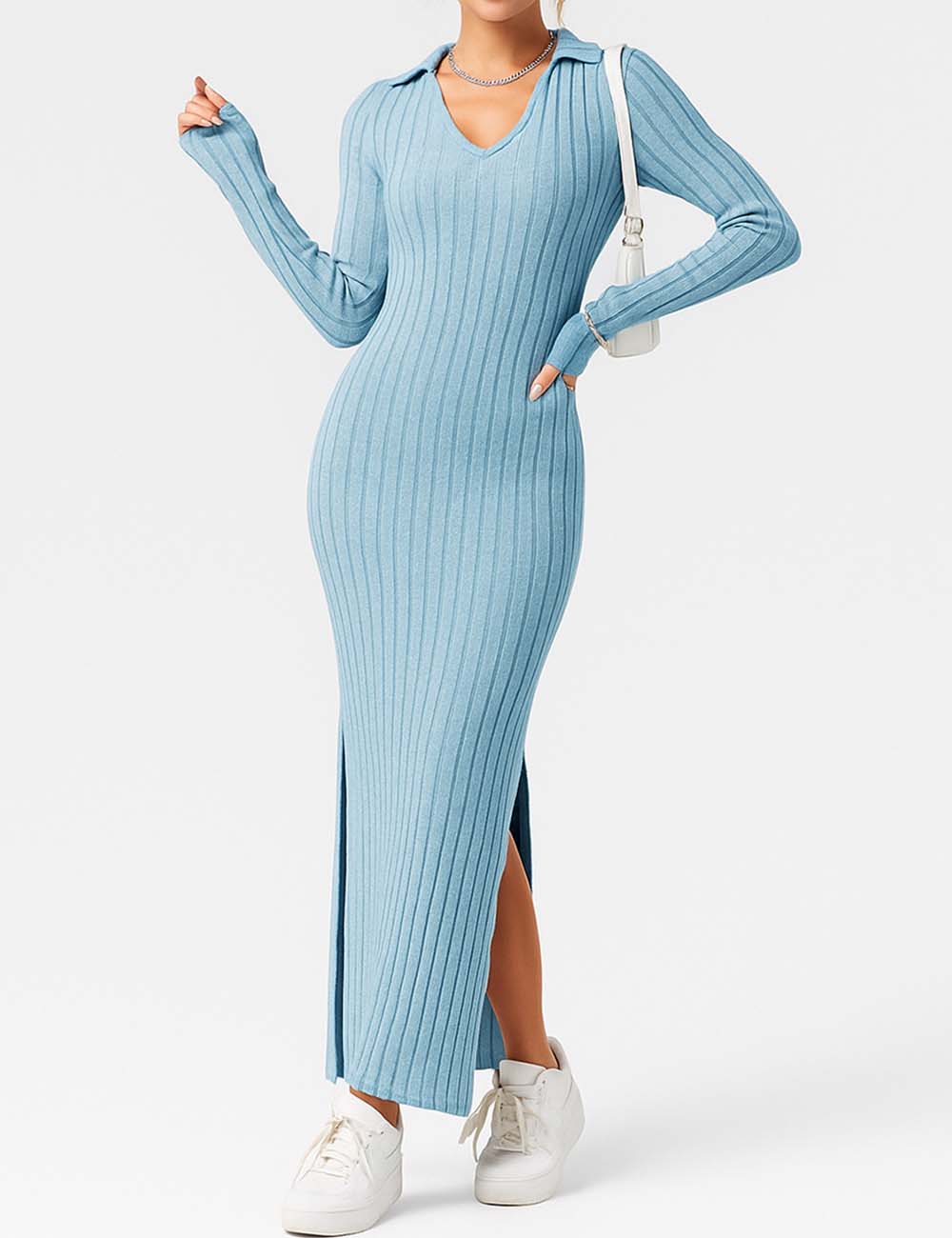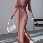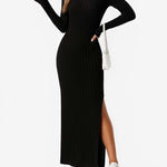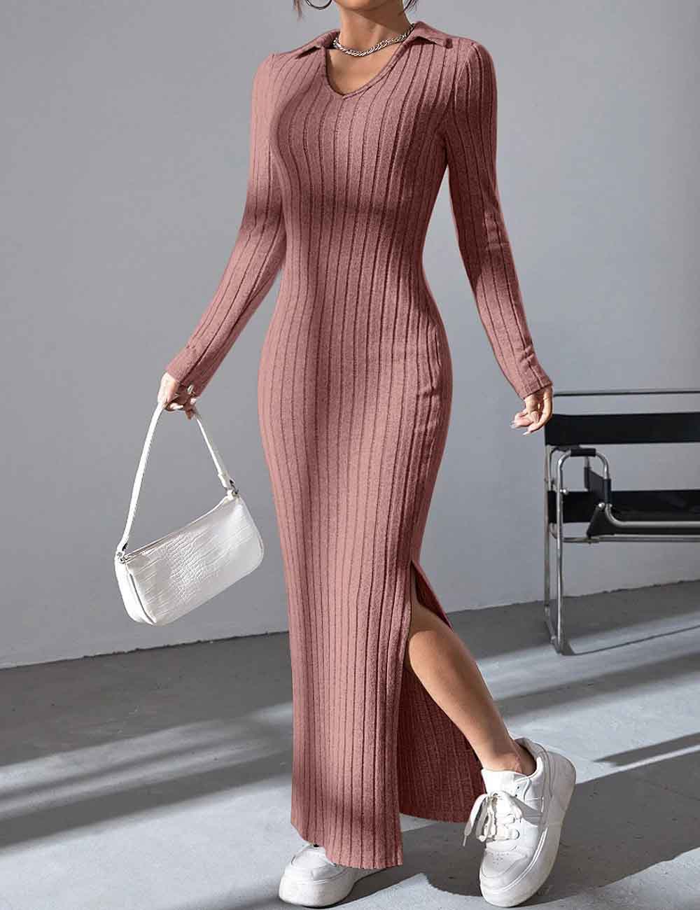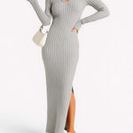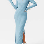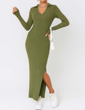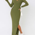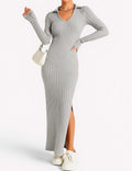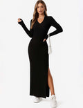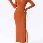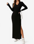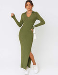 Ladies Solid Color V-Neck Side Split Knit Sweater Dress