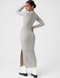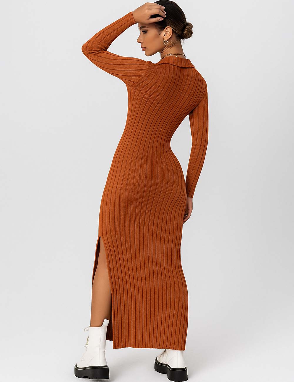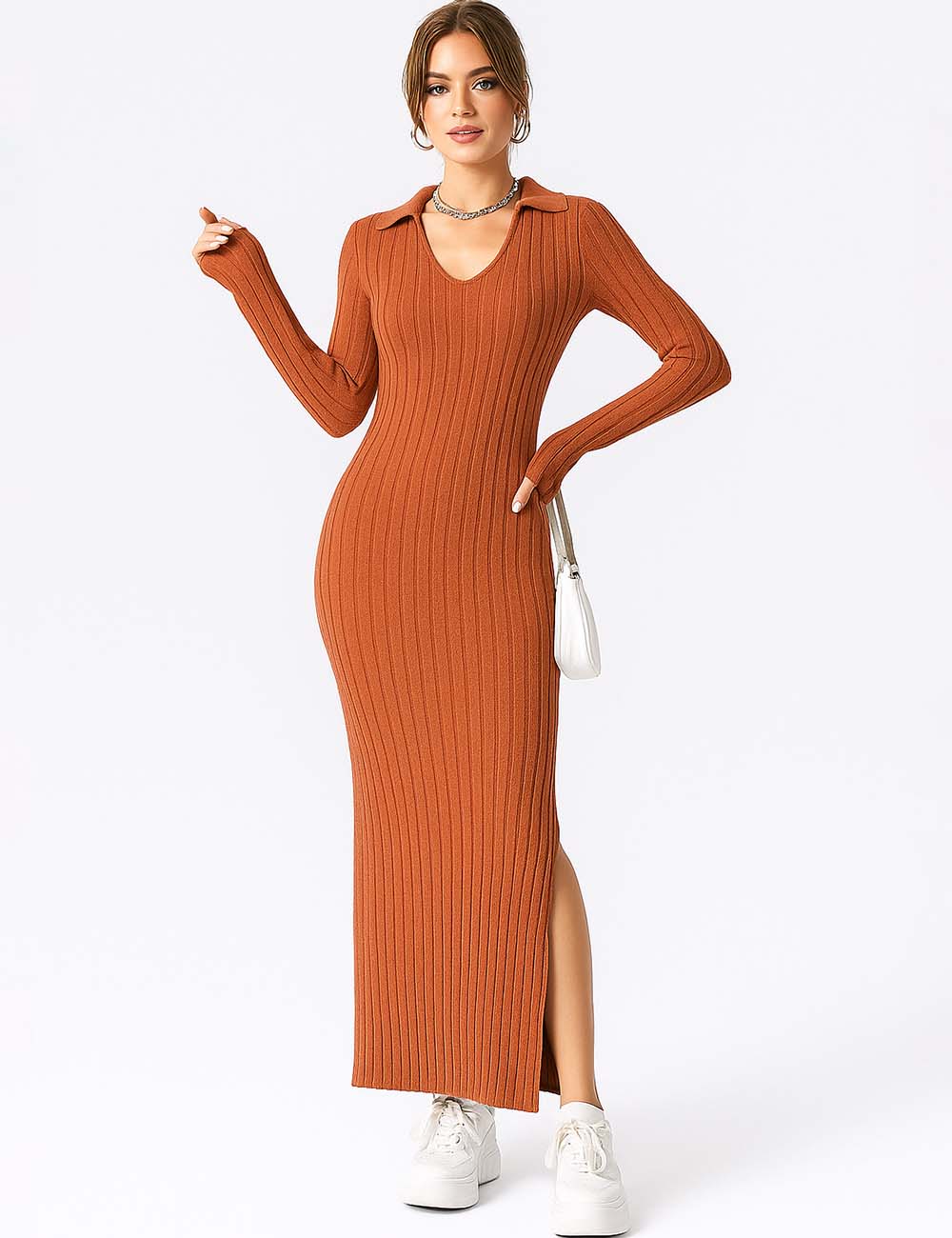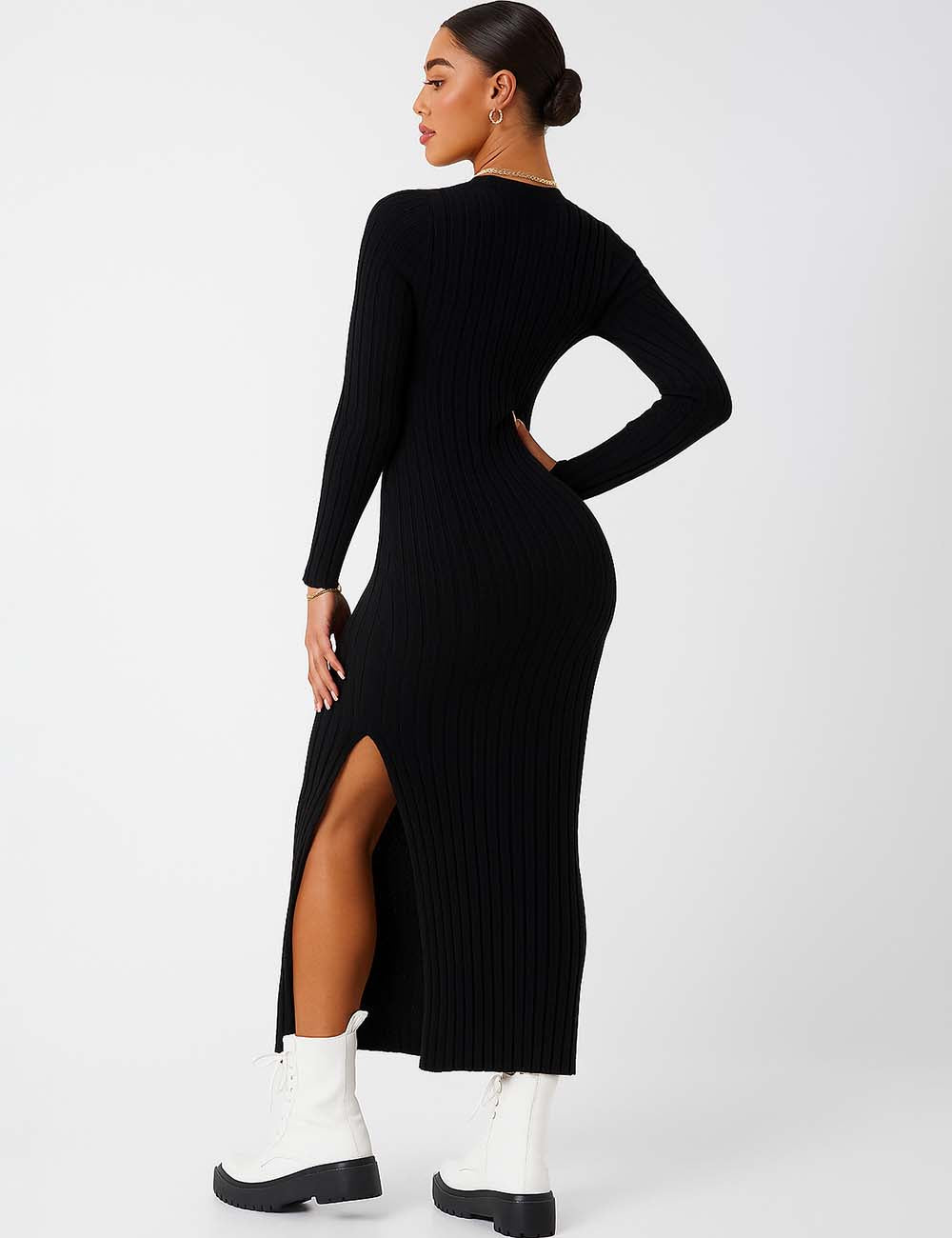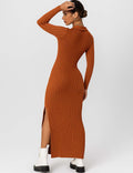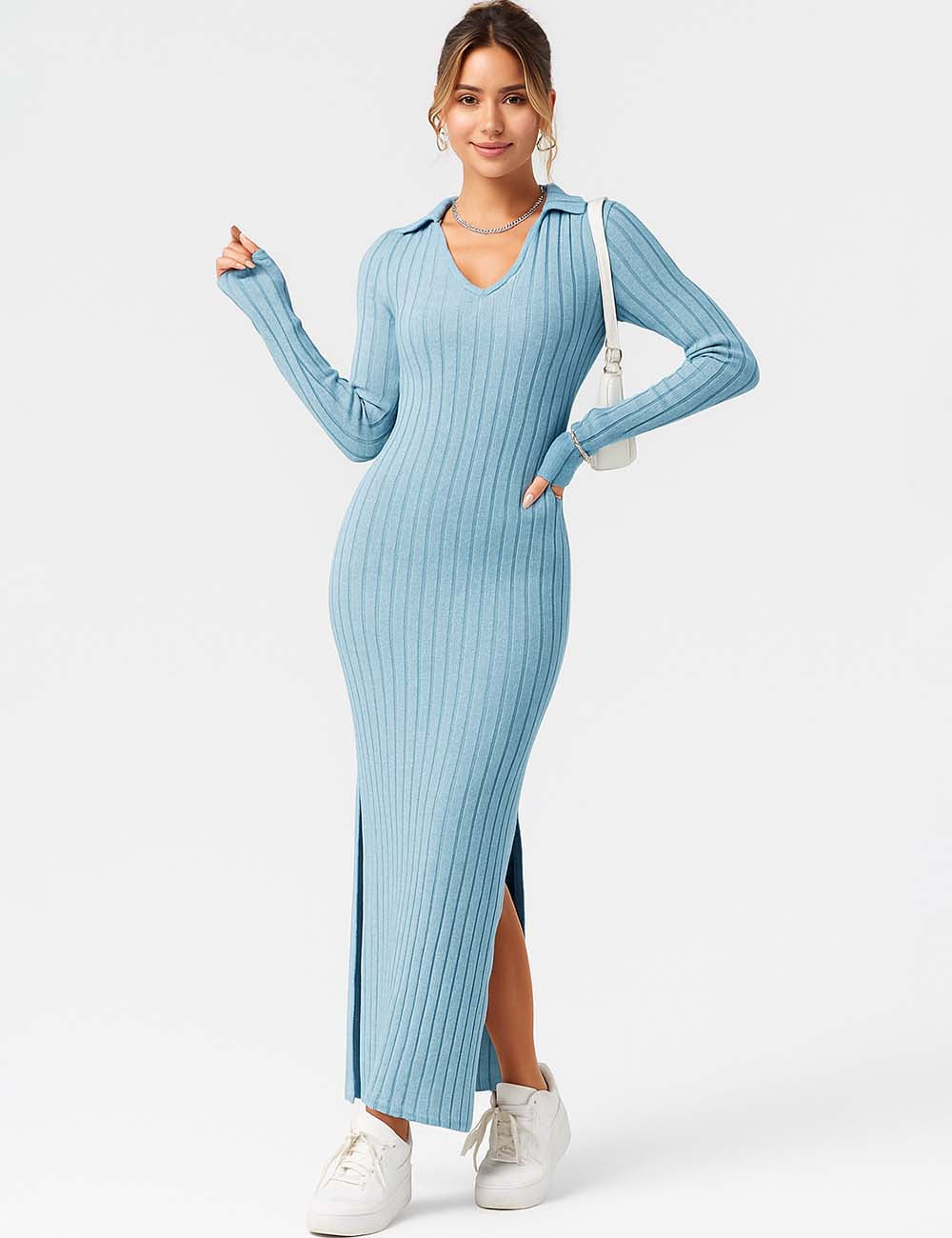 Ladies Solid Color V-Neck Side Split Knit Sweater Dress
