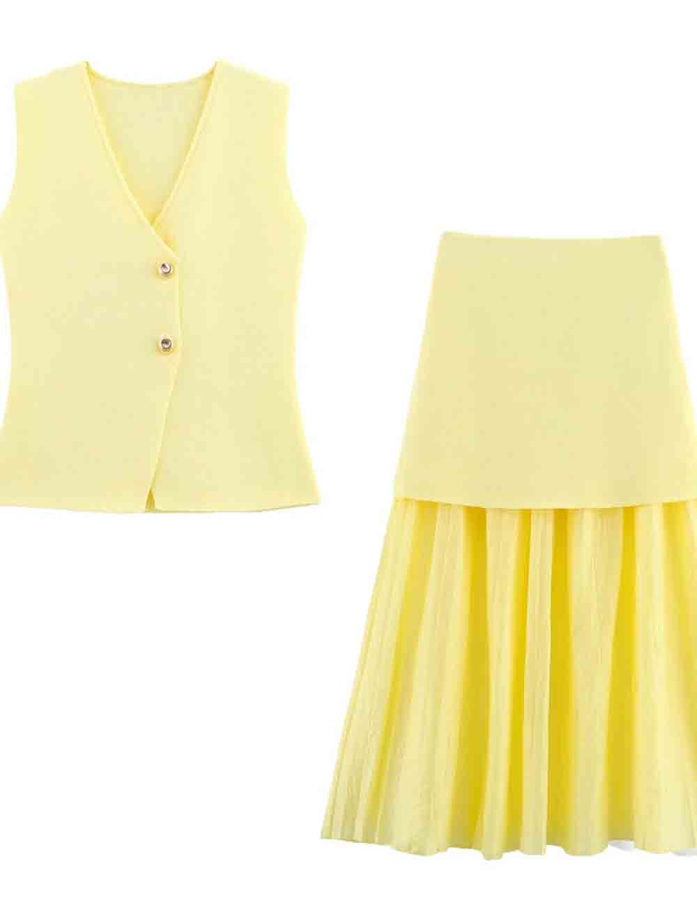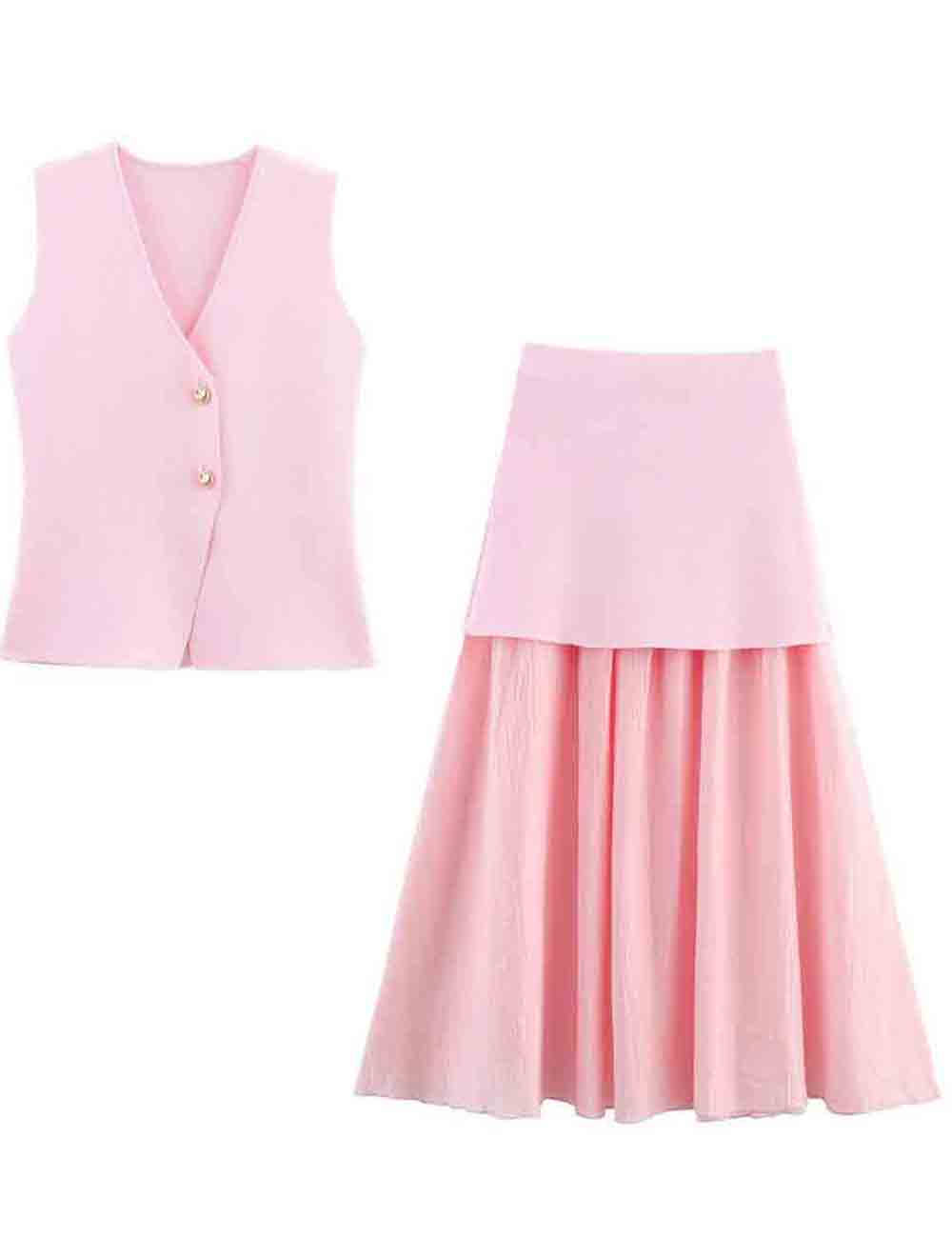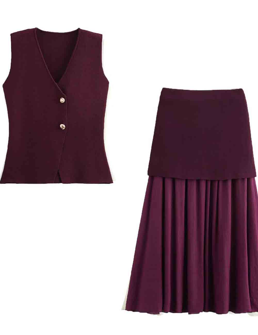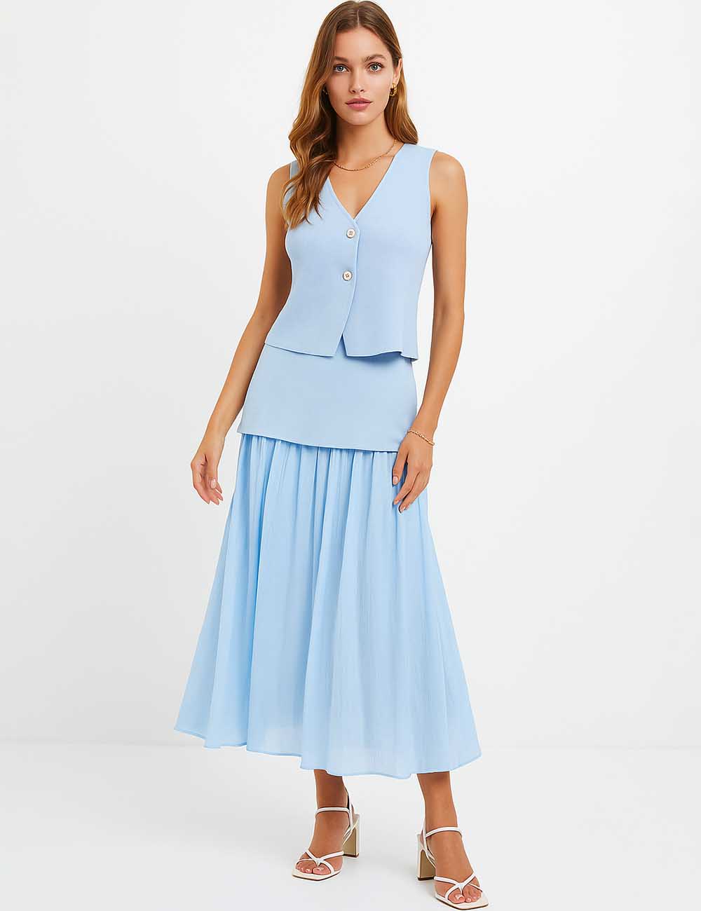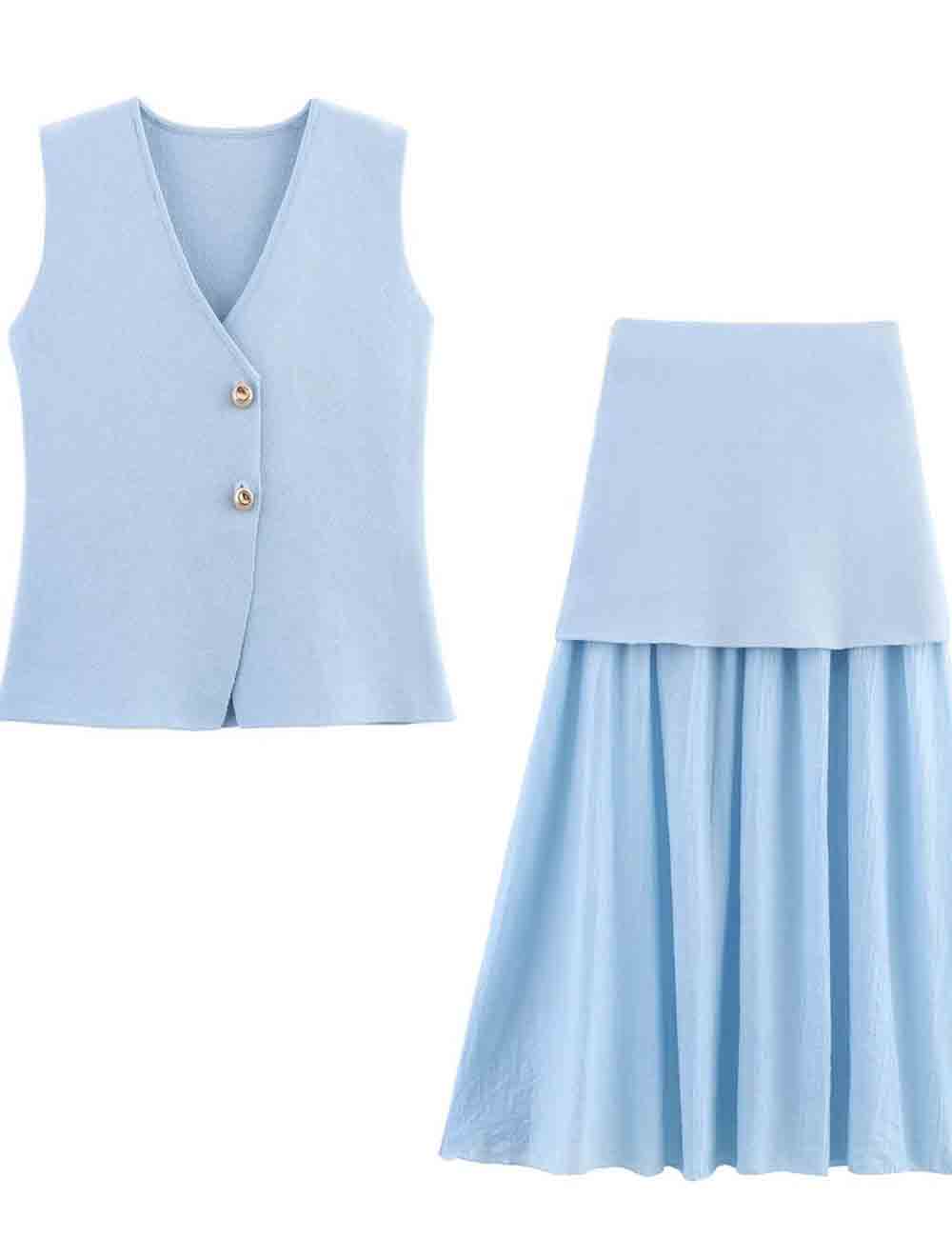Ladies Solid Color V-Neck Sleeveless Knit Top & Skirt Set