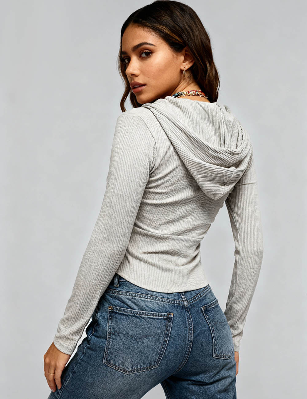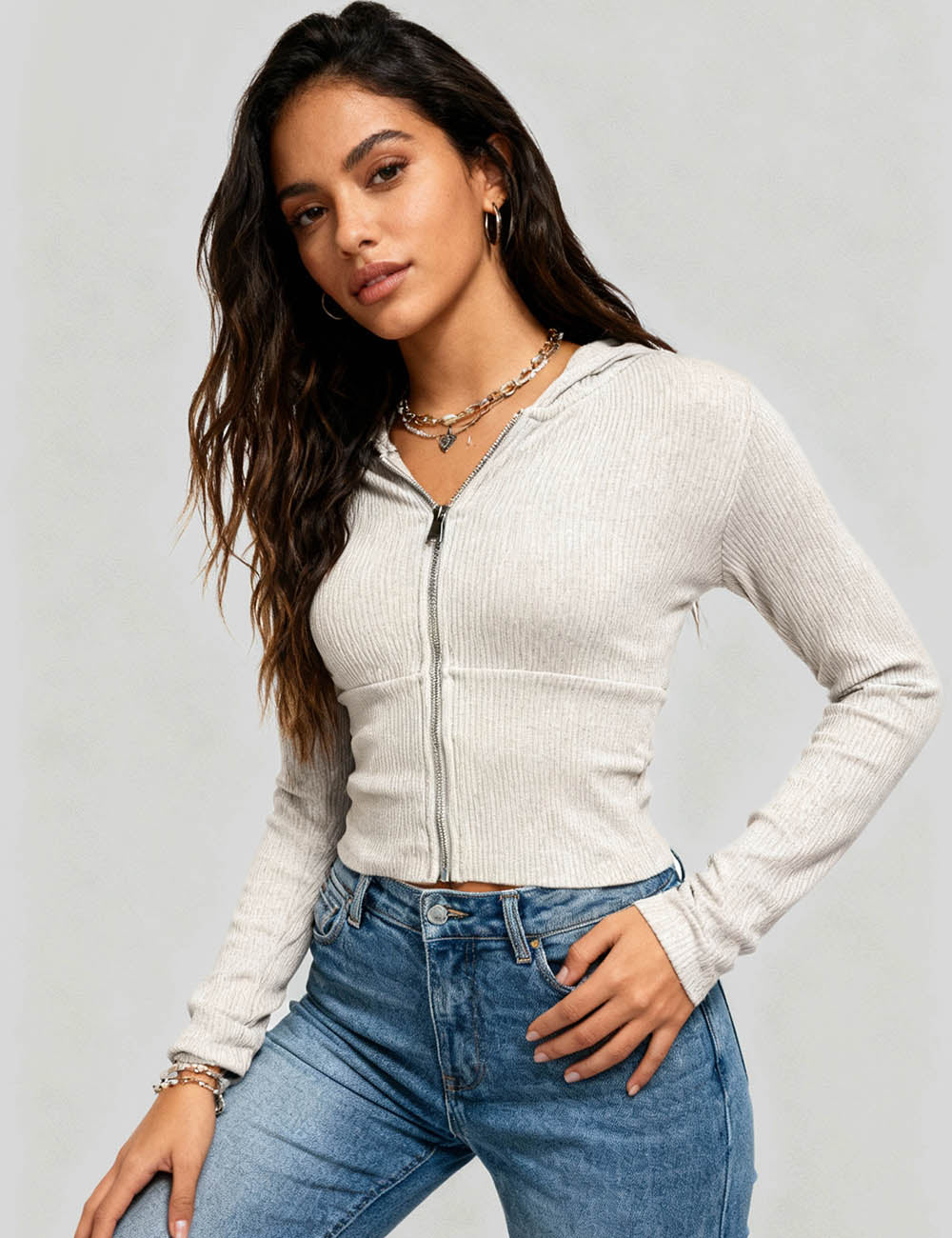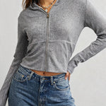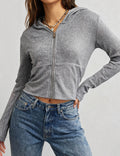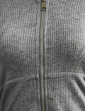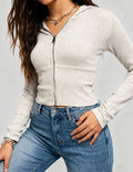 Ladies Solid Color Zip-Up Hoodie Rib Knit Sweatshirt Top