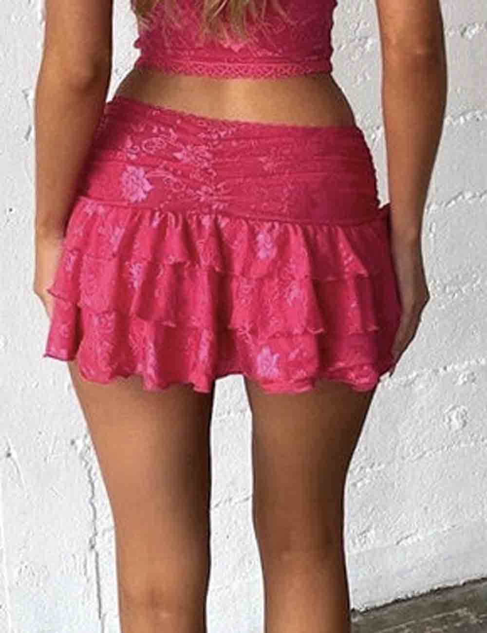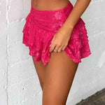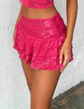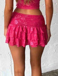 Ladies Solid ColorElastic Waist Floral Lace Tierd Ruffle Mini Skirt