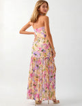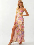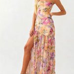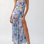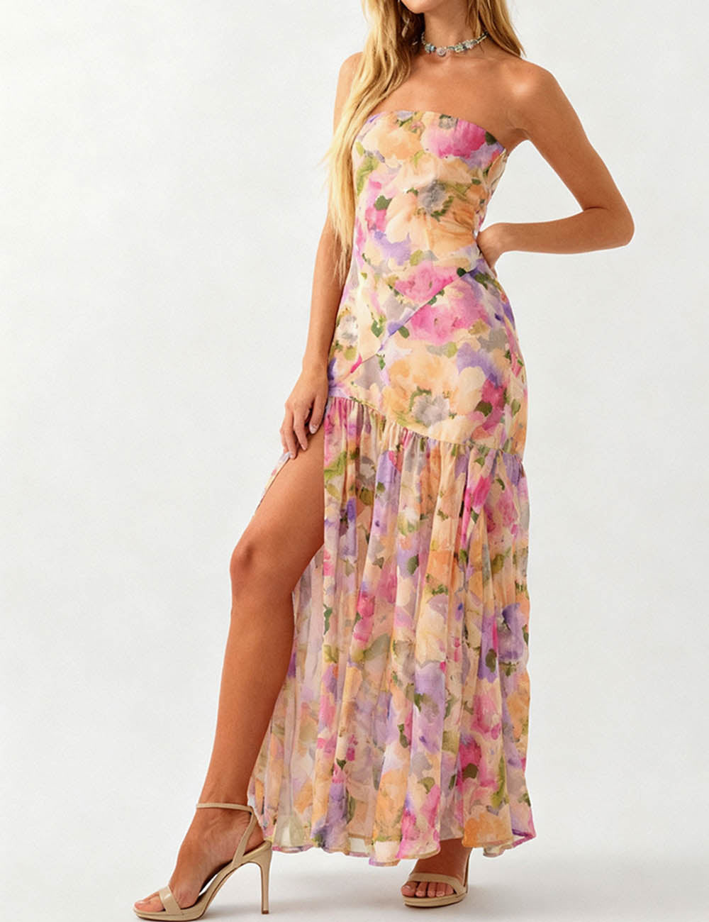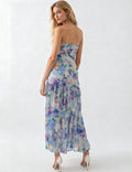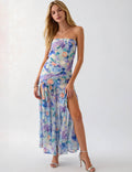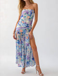 Ladies Strapless Watercolor Floral Chiffon Side Slit Maxi Dress