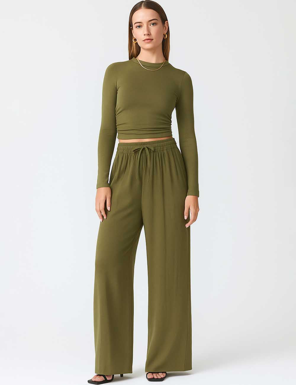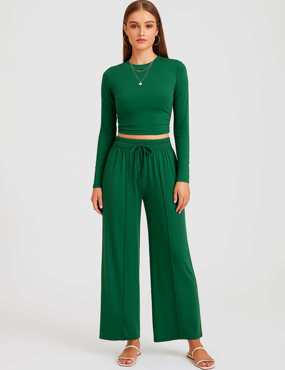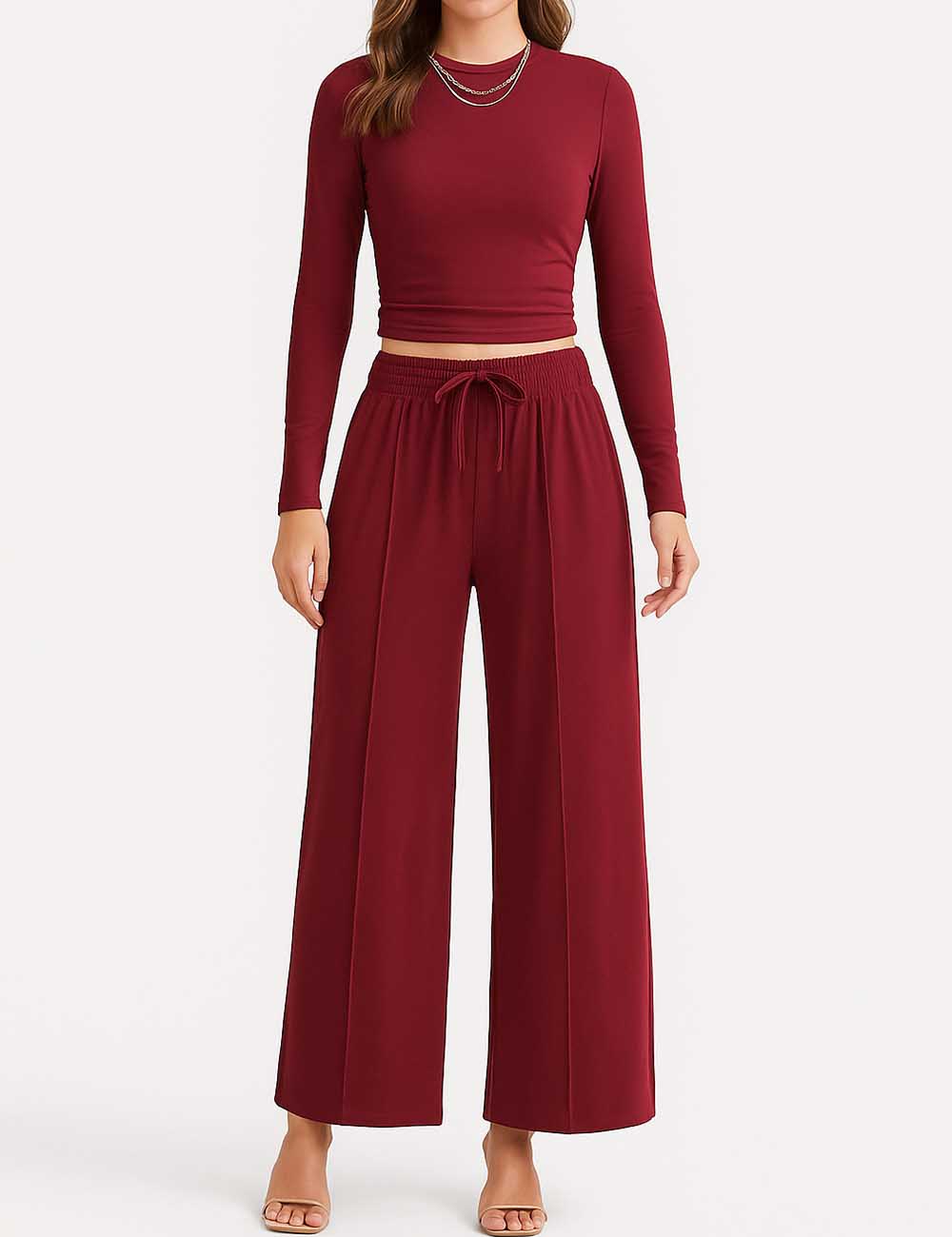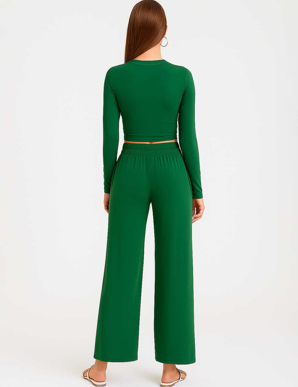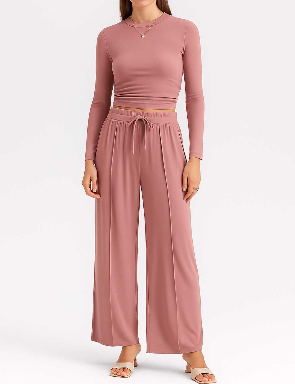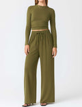 Ladies Stretch Ruched Long Sleeves Cropped Top & Pants Set