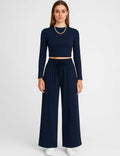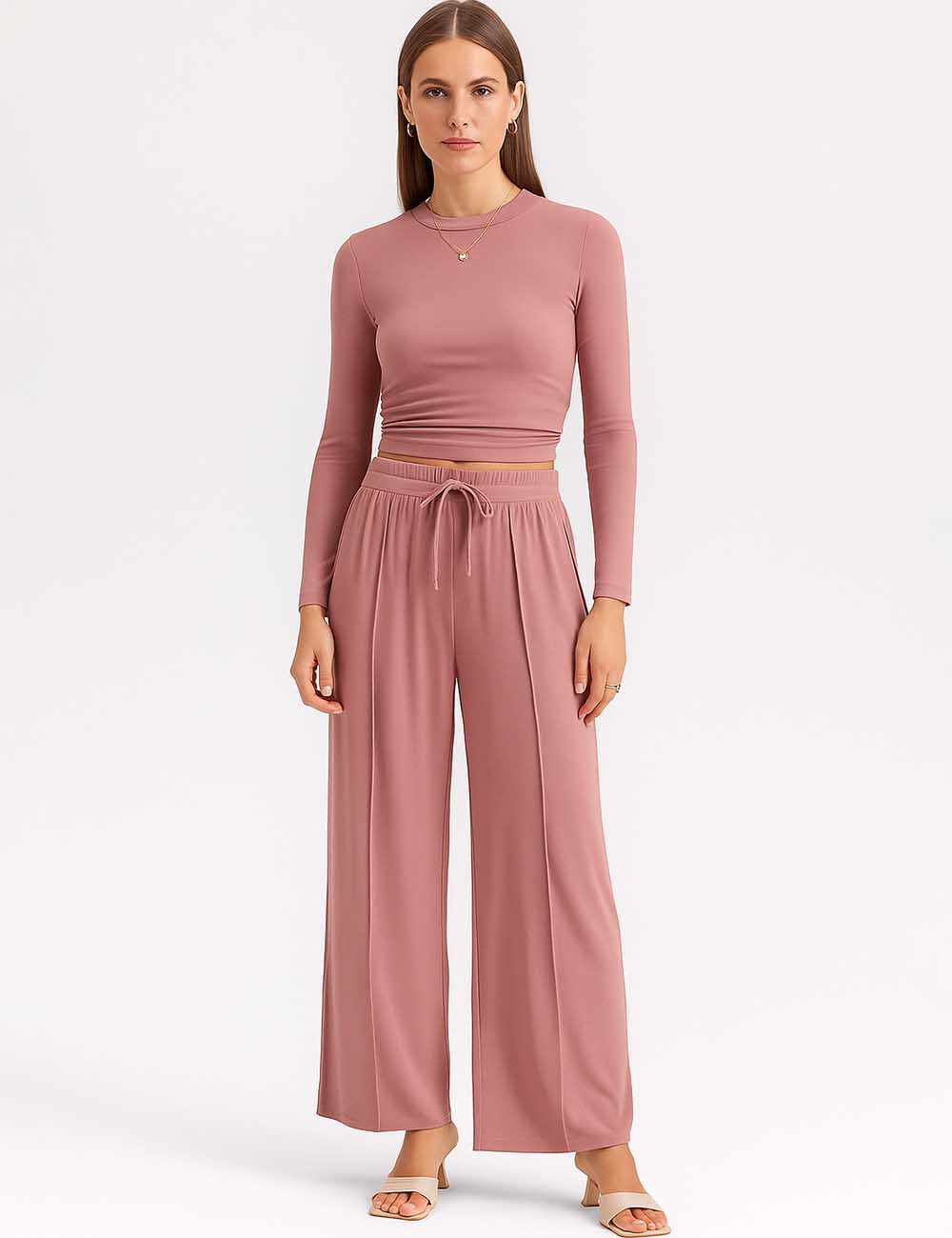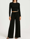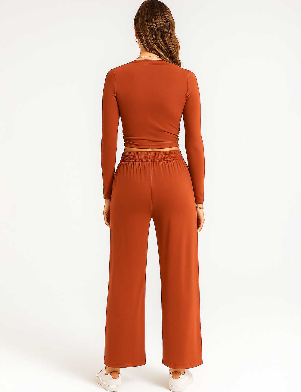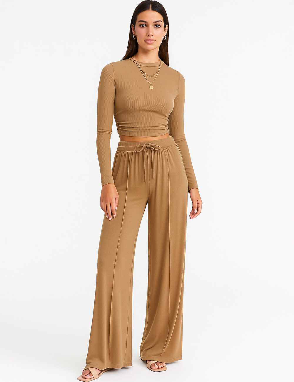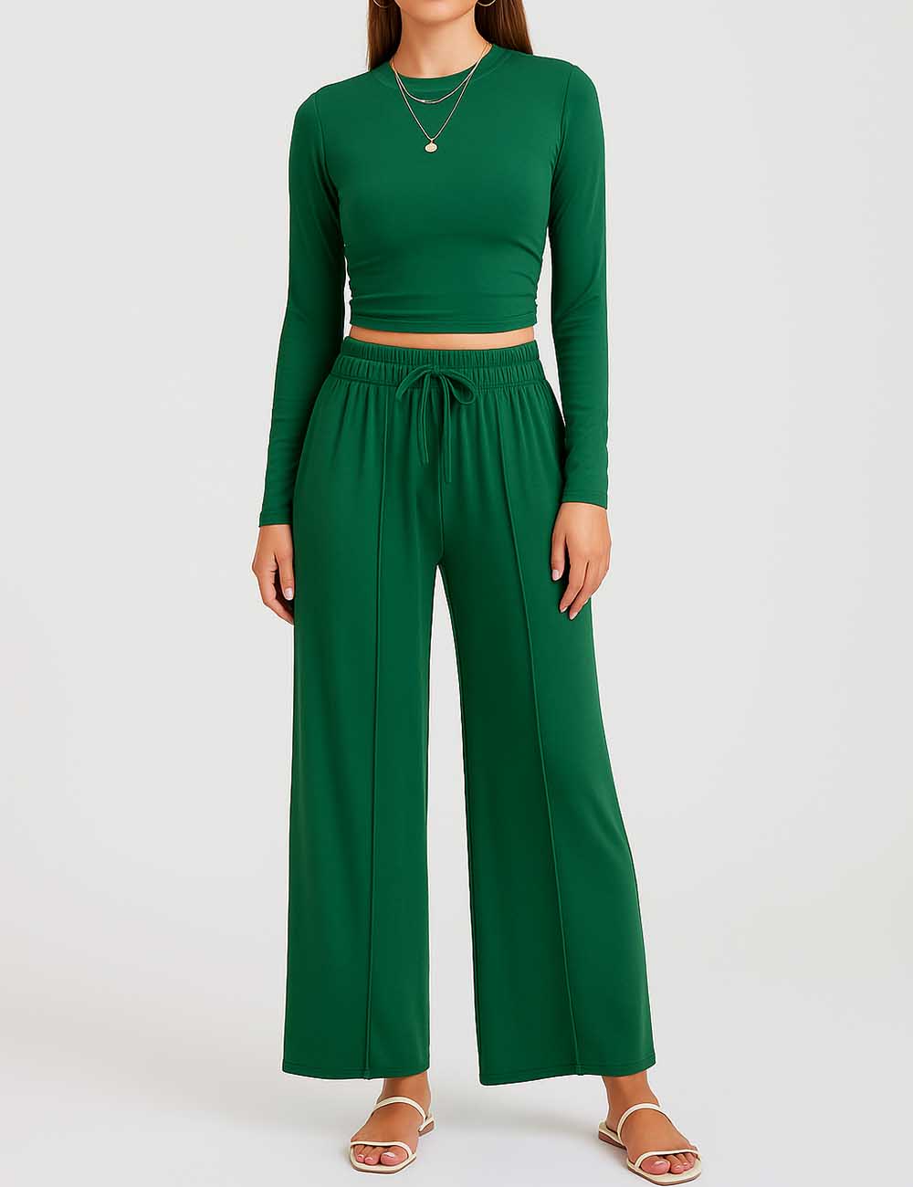 Ladies Stretch Ruched Long Sleeves Cropped Top & Pants Set